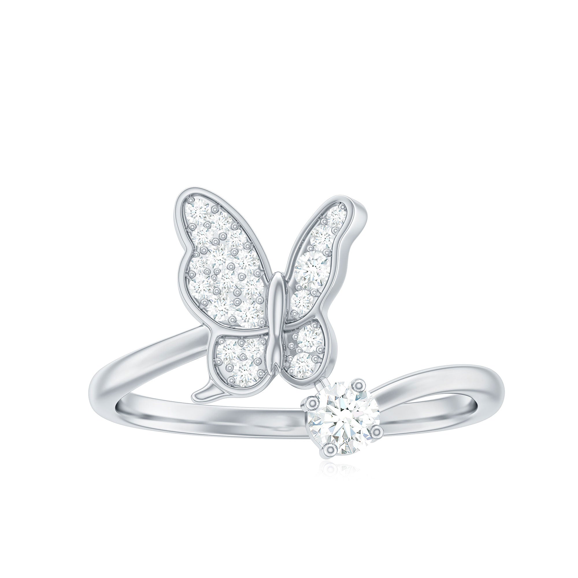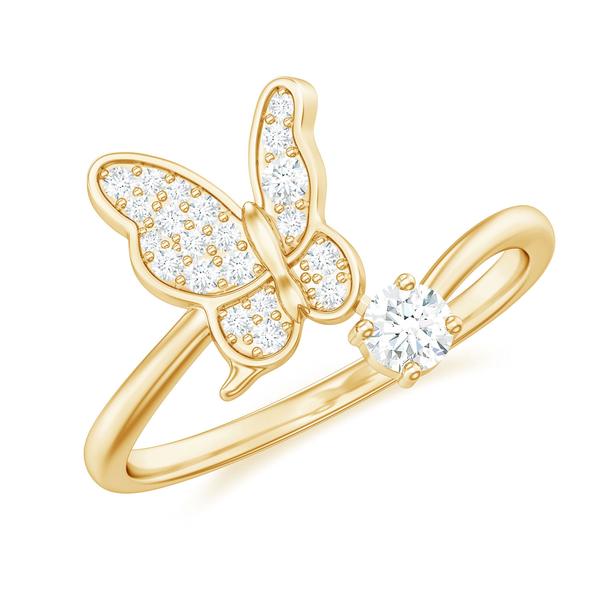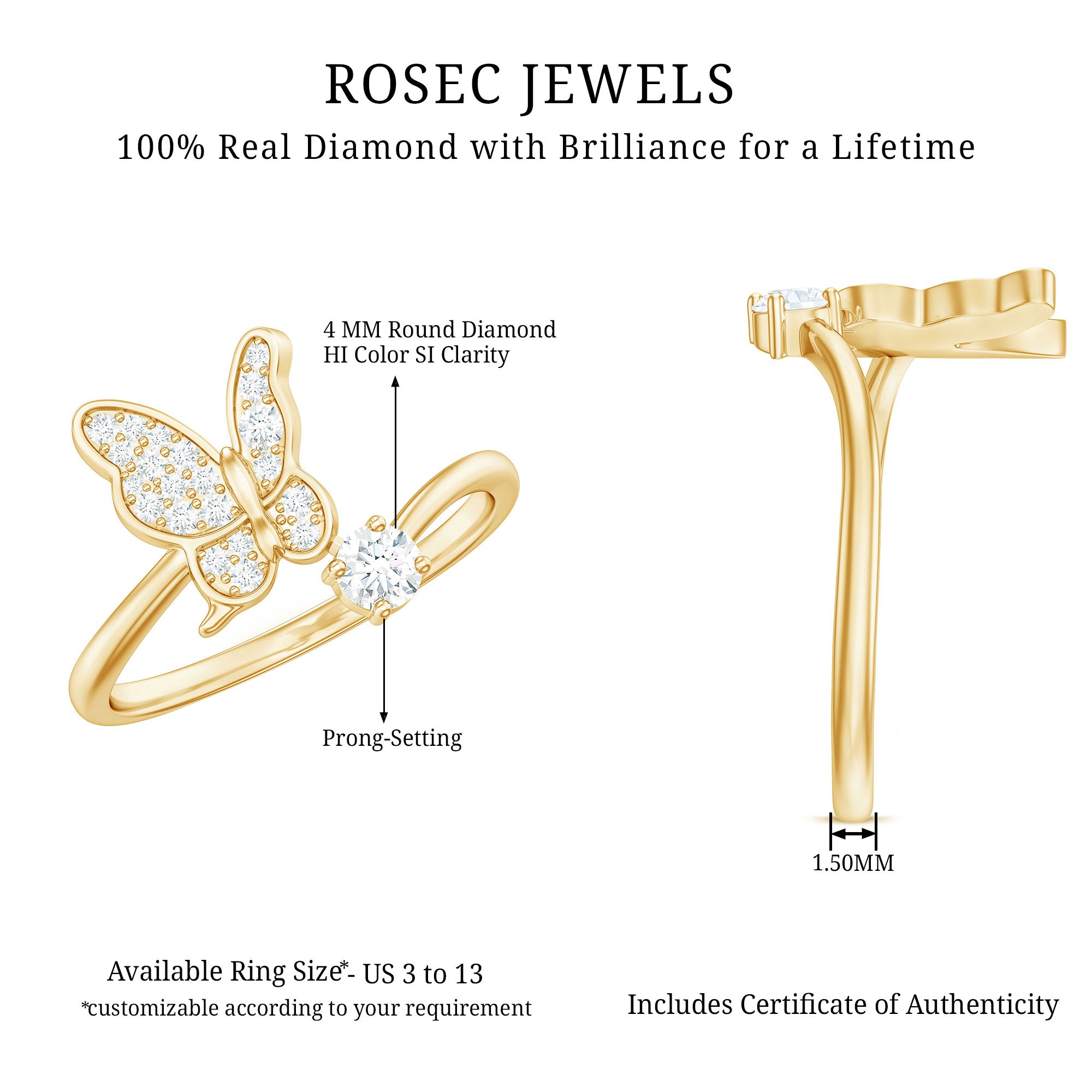 Why go for a regular Diamond Cocktail Ring when you can wear a stunning masterpiece? This gorgeous Diamond Wrap Ring offers an amazing sparkle inspired by natures beauty. It features a lovely butterfly motif, adorned with round cut diamonds that will grab attention from across the room, while a round cut diamond set in prong setting adds a touch of extra shine. The elegant wrap-like design smoothly curves around your finger, and the plain band adds both comfort and flair. This striking Diamond Butterfly Ring is a fantastic choice for a forever ring - perfect for brides who want something different from a solitaire every day. Whether you are getting ready for a fancy evening out, a wedding reception, or a festive gathering, this Real Diamond Ring for Women will be the ideal finishing touch to your outfit. No matter how you decide to wear it - solo or with other jewelry, this beauty guarantees all eyes will be on you. Choosing this Animal Ring for your special day is like embracing modern luxury while making a bold statement.