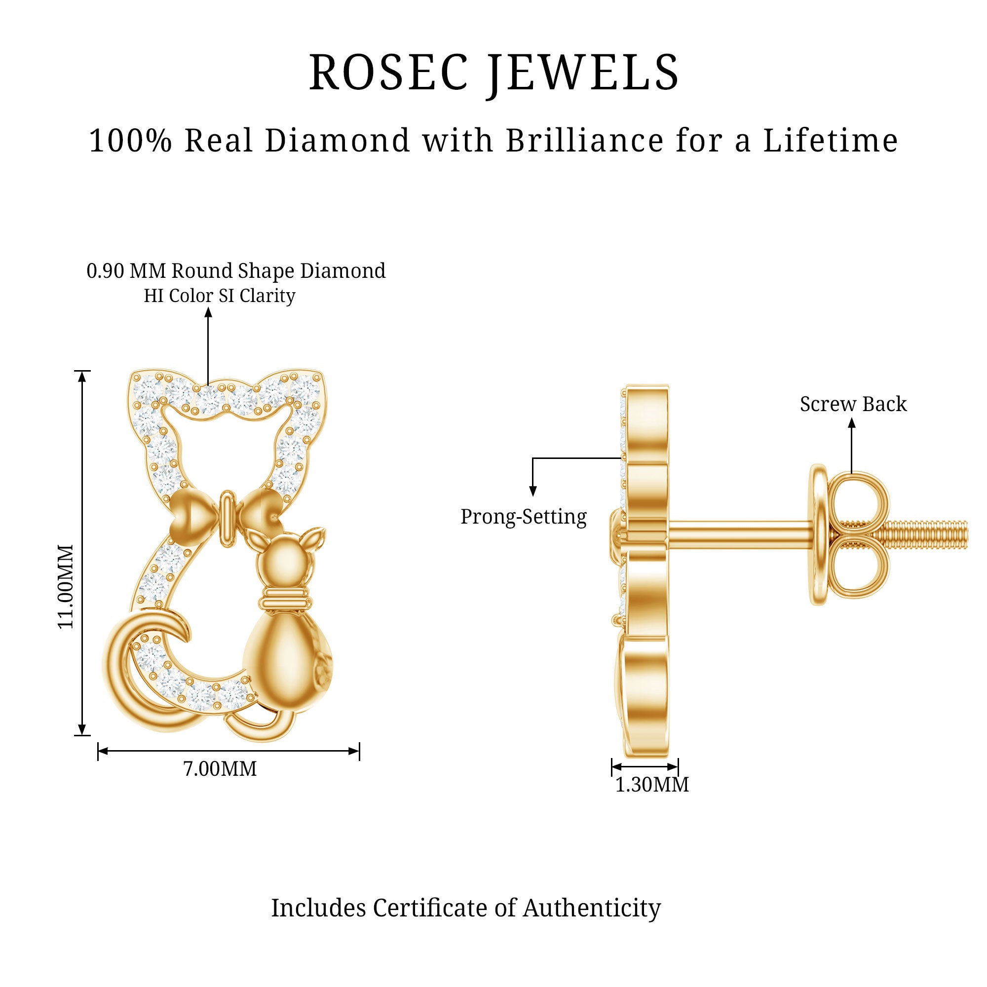 Eye-catching Diamond Stud Earrings have a cat-inspired theme, representing characteristics such as grace, curiosity, and protection. They serve as a perfect present or as a reminder of the companionship and joy that cats bring into our lives. These Studs are embellished with Round Shape Diamond in Pave Setting on the Mommy Cat and the cute Kitten hugs her in such a way that it represents the beautiful relationship between them and the crucial biological bond. These adorable pair of Cat Stud Earrings are a heart-warming accessory that offers a delightful way to showcase your passion without being overly loud. These versatile Hello Kitty Earrings add a touch of whimsy to your everyday style with a touch of movement. These Cute Cat Earrings are a great present for your feline friends, bringing them into your lives. This charming pair could be a present for your little girl, teen or even lets not forget to pamper yourself. So, add a feline flair to your jewelry collection as it is a dream-come-true piece of jewelry.