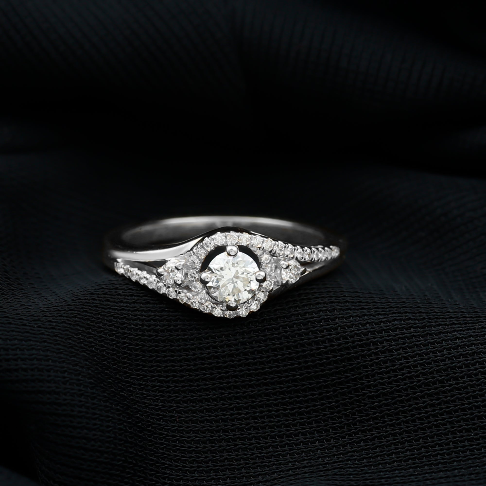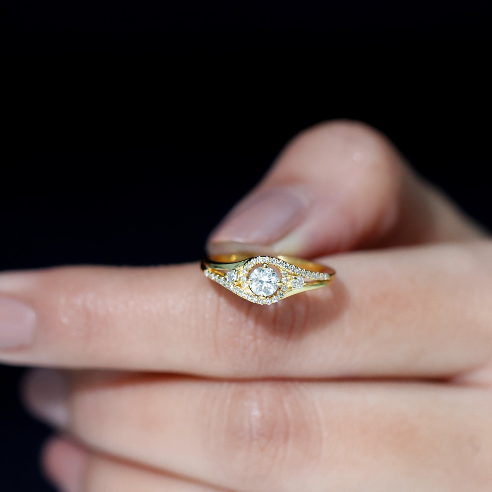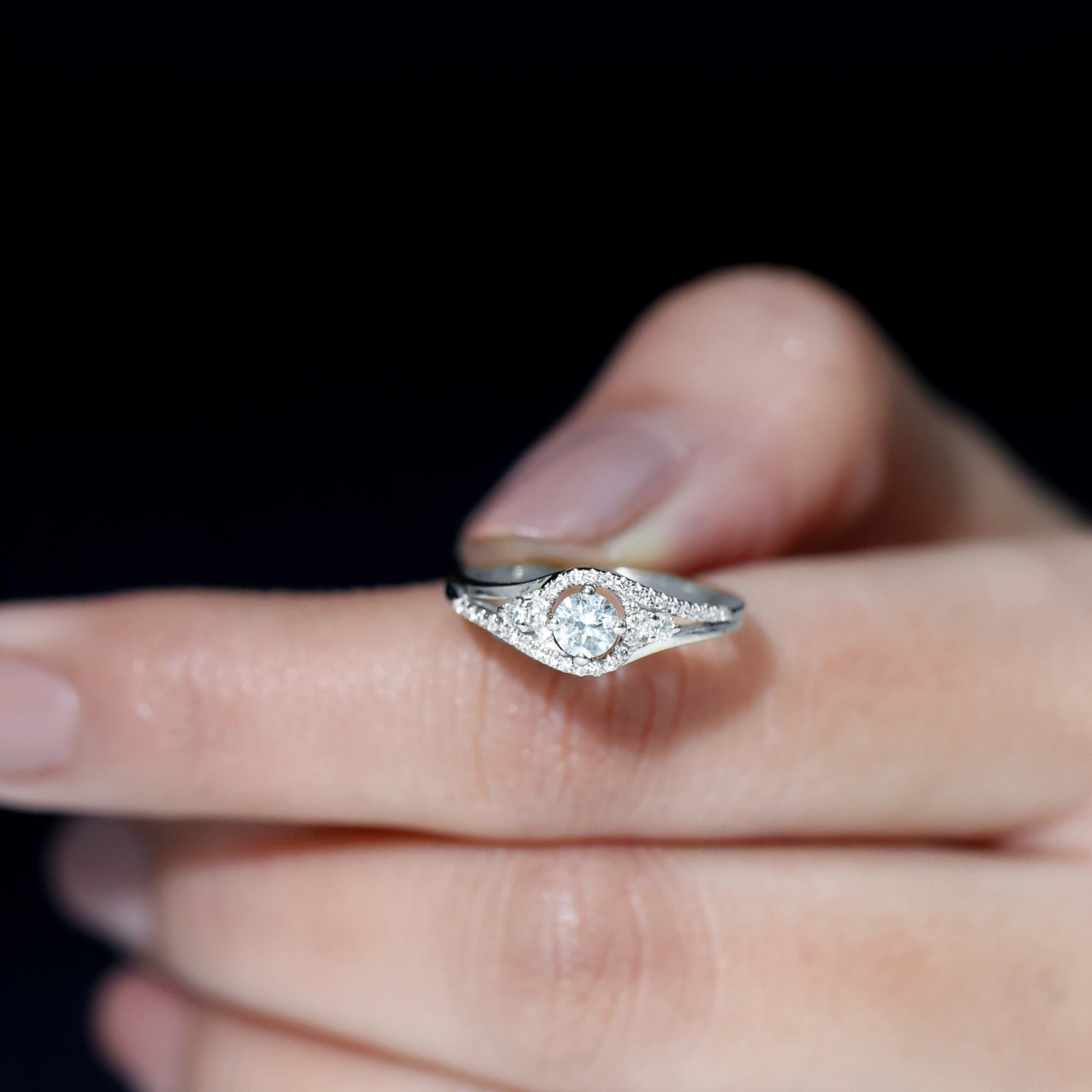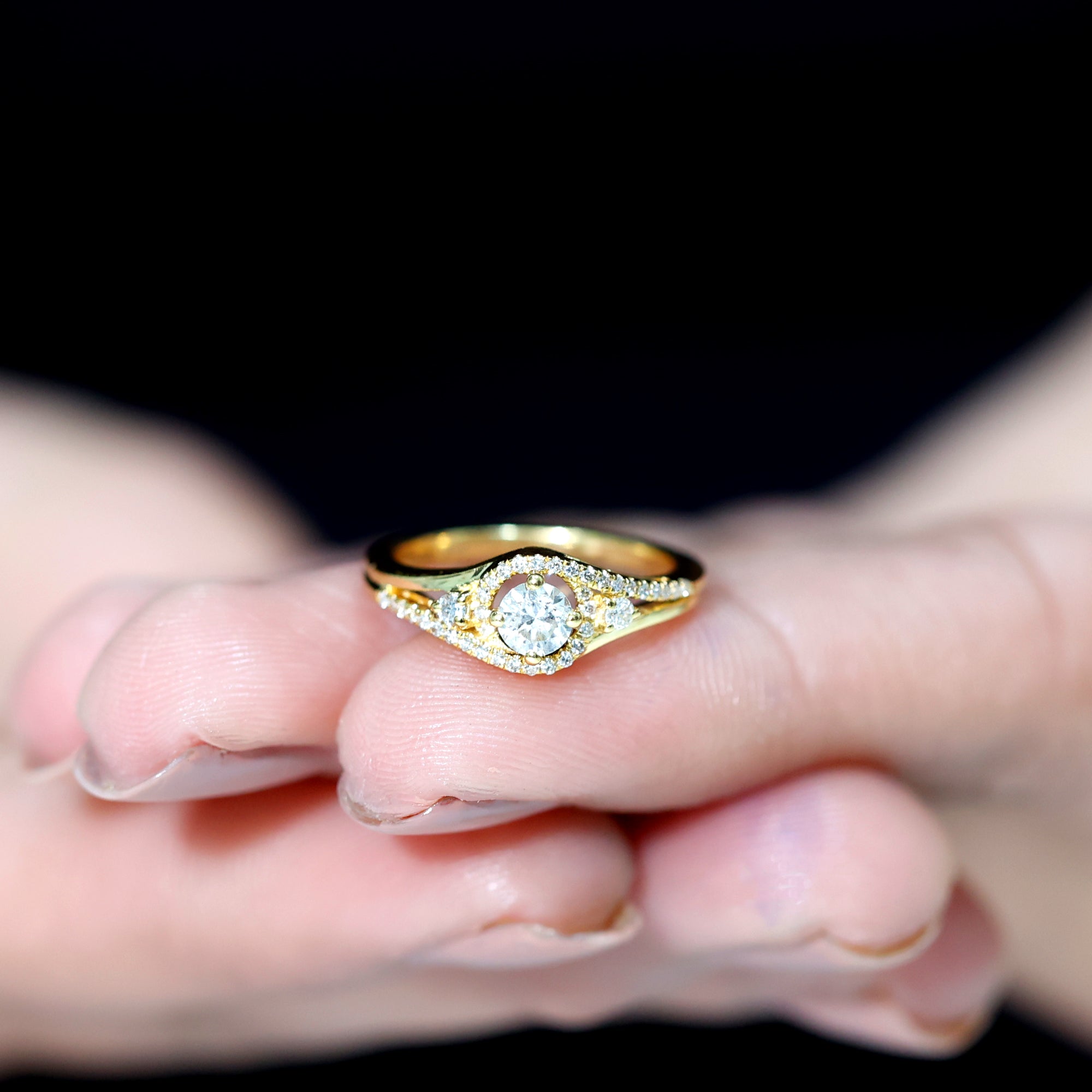 This Diamond Engagement Ring is a way of stealing hearts with its enduring style. Focusing on craftsmanship and versatile classic design, this Timeless Engagement Ring balances tradition with a touch of romance. Simple yet striking design of the timeless sparkle, this Ring is a symbol and extra sparkle that makes it unforgettable. This ring is embellished with Round Shape Diamond in Prong Setting, complemented by a Halo of Diamonds. The uniqueness bypass design, along with a Split Shank, makes this elegant Engagement Ring adds a touch of glamor while staying true to its timeless elegance. With its unmatched sparkle and sophisticated design, this amazing ring is sure to elevate any outfit and add a touch of glamour to your look. The classic with modern minimalist, this Simple Engagement Ring has a light return, with utmost brilliance and fire. A minimalist and excellent way to showcase your promise or mark your milestone. It is also an exquisite and distinctive piece that offers a fresh twist on the classic design.