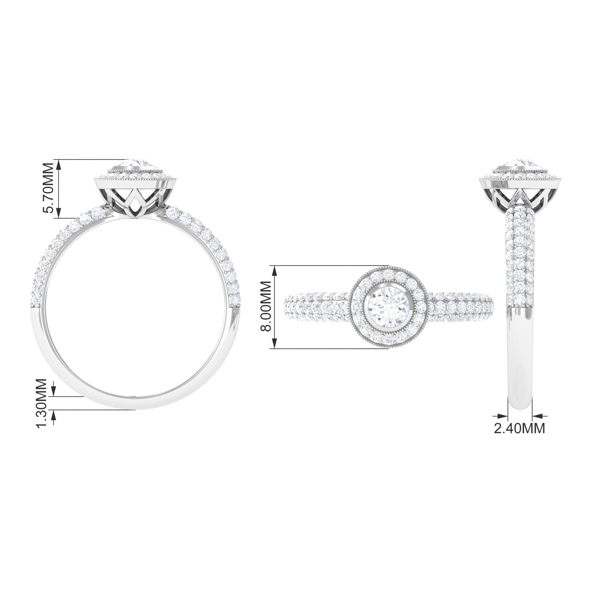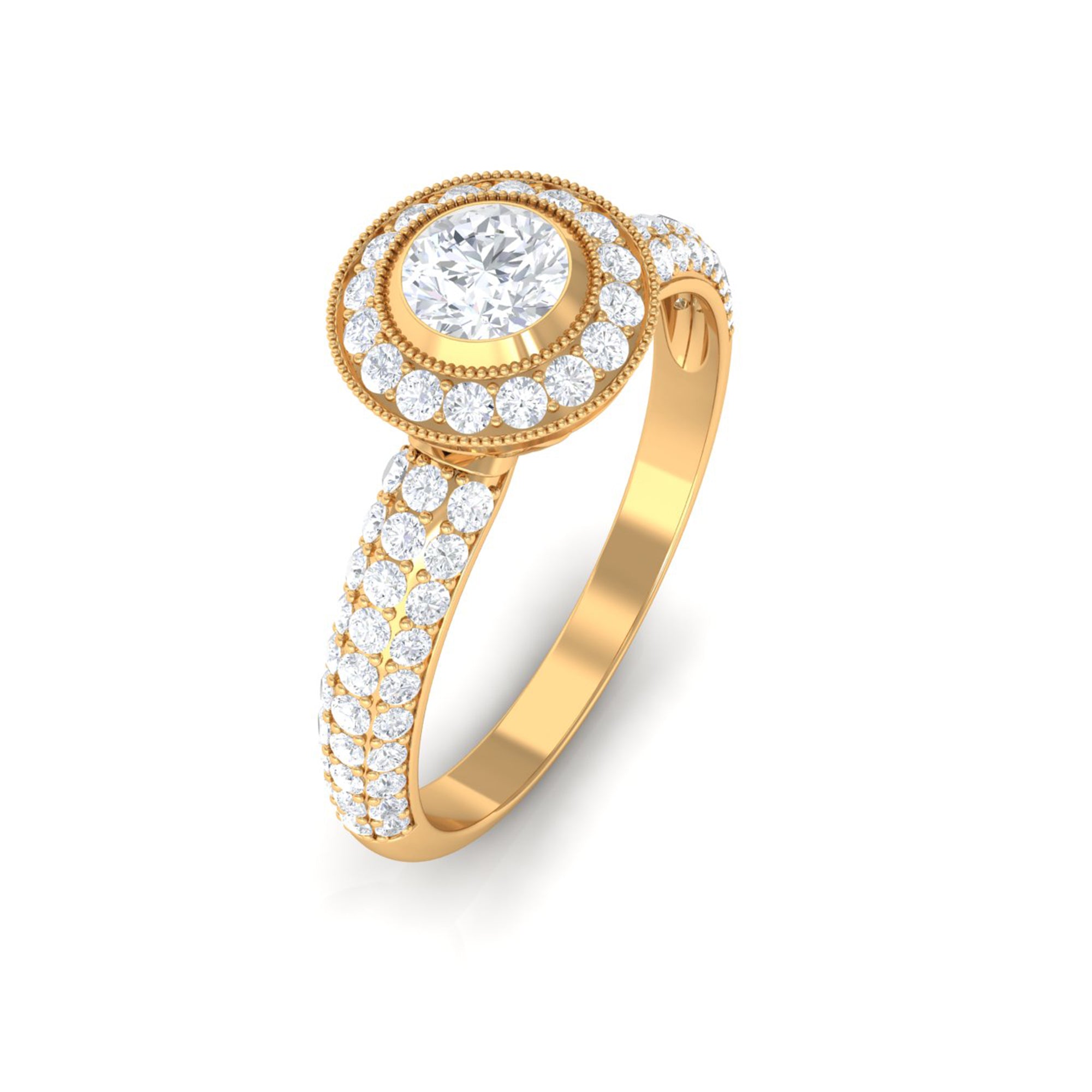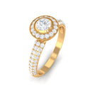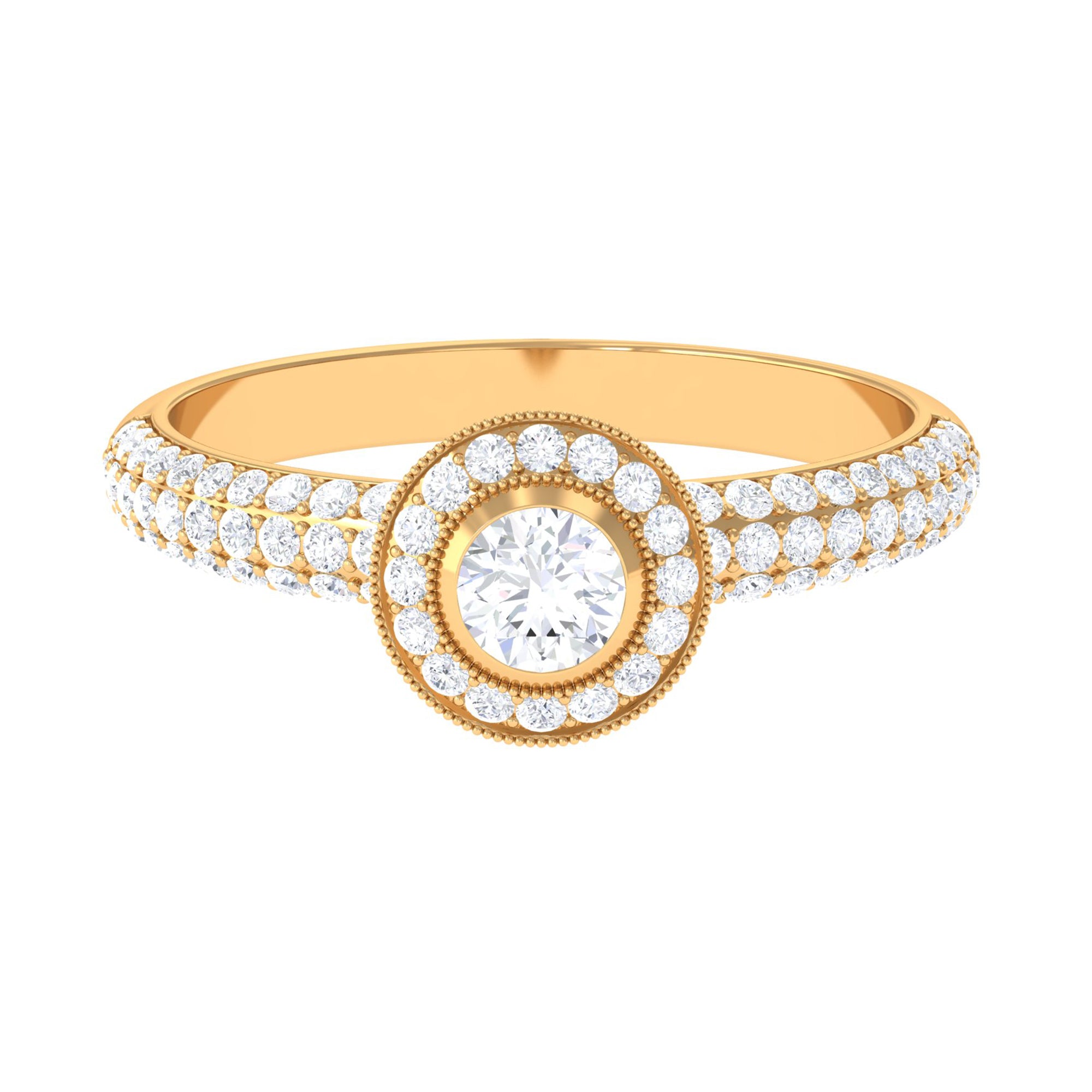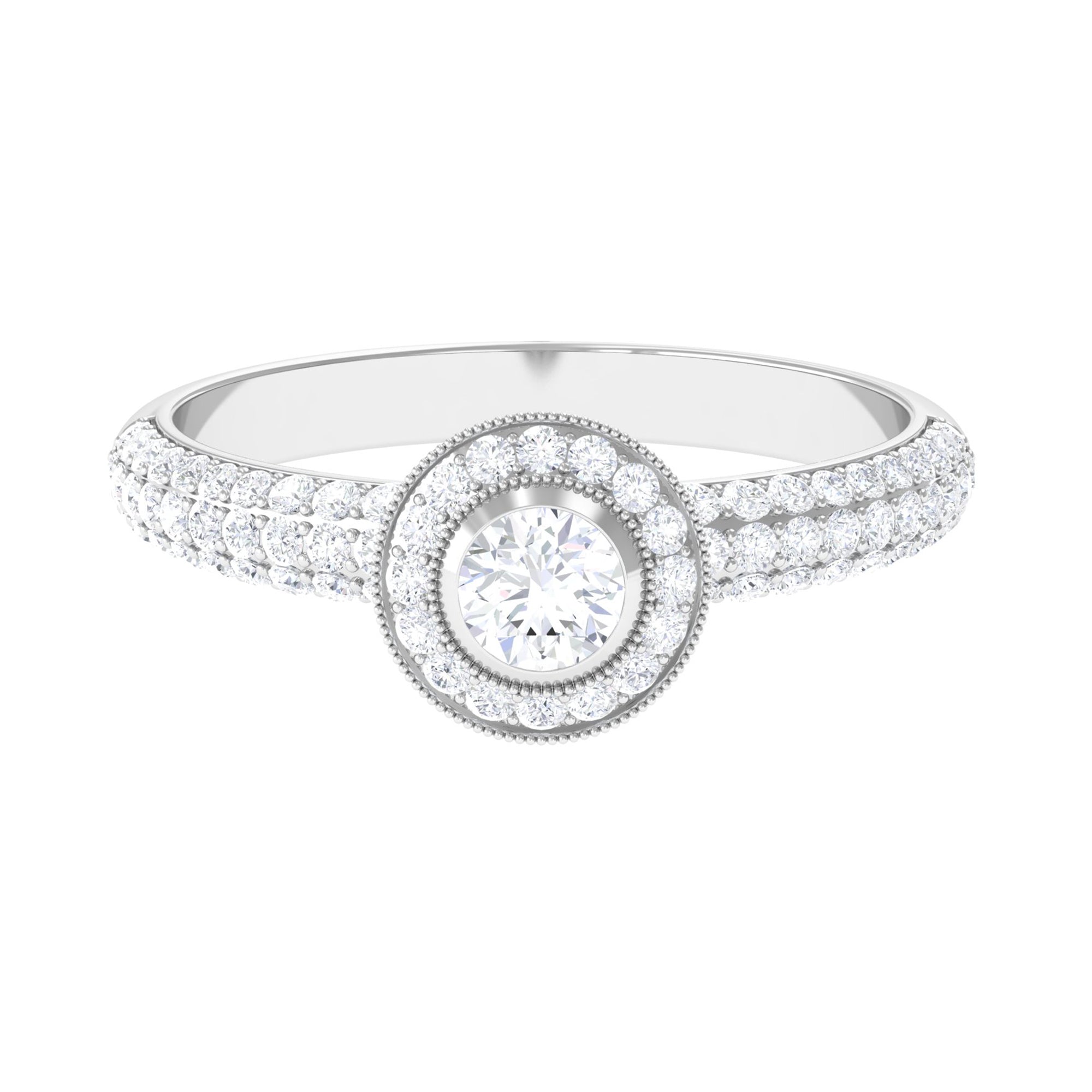 This Diamond Engagement Ring is the ideal finishing touch for those romantic occasions. It features intricate details that exude timeless beauty. At its heart, there is a 4 MM round cut diamond of HI-SI quality that truly shines, set in a secure bezel and surrounded by a halo of round cut stones with beaded accents. The band of this Vintage Engagement Ring is a true work of art, embellished with additional round cut diamonds that create a dazzling sparkle from every angle. Symbolizing love and commitment, this Vintage Diamond Ring captures elegance and timelessness, showcasing a classic yet radiant look that never fades from fashion. This Round Engagement Ring includes a quality assurance certificate and comes beautifully packaged in a chic, protective box, making it perfect for gifting or safe storage when not in use. Whether you are a bride on the hunt for a Diamond Halo Engagement Ring or someone who adores vintage-inspired pieces for special events, this Art Deco Ring will surely add a distinctive touch to your style.