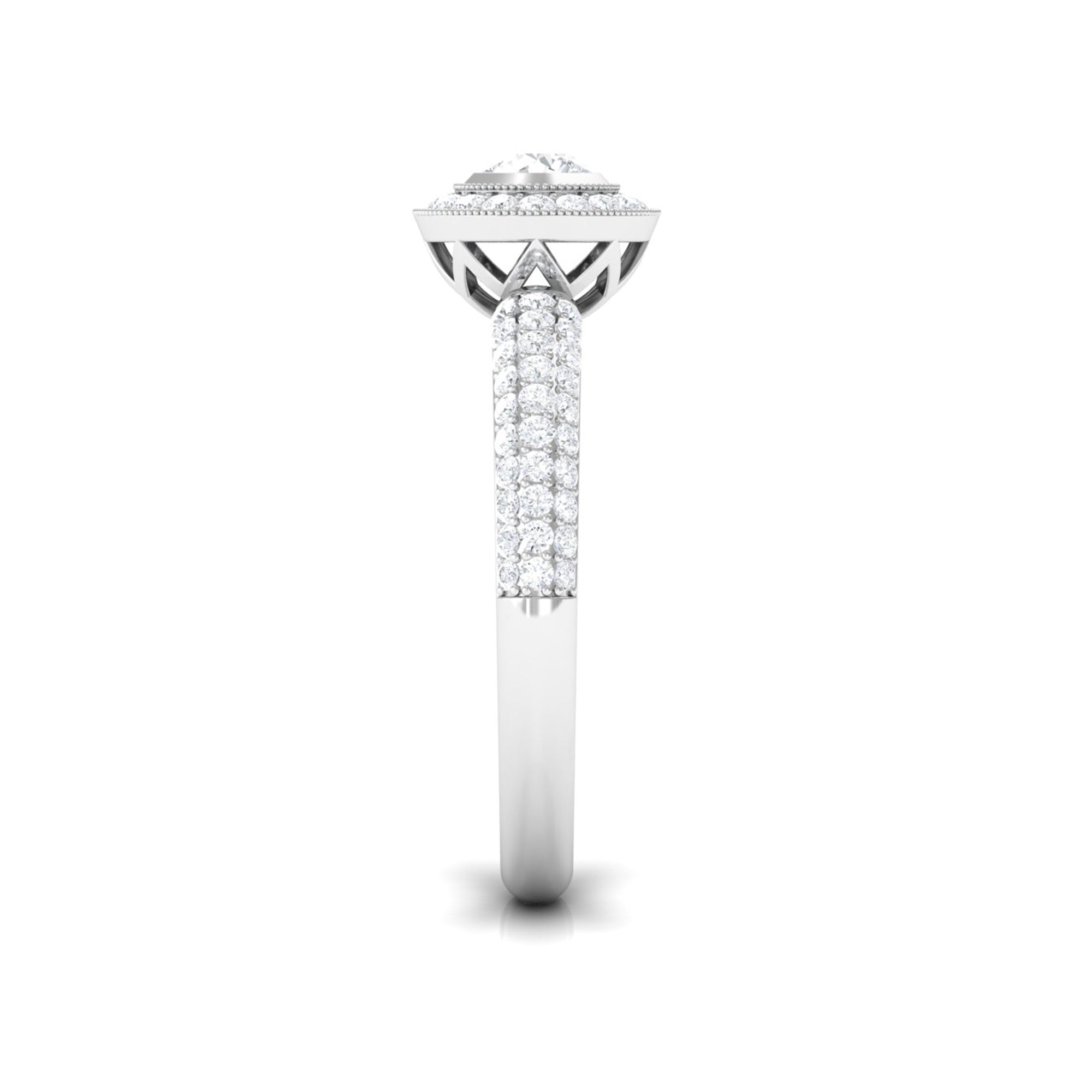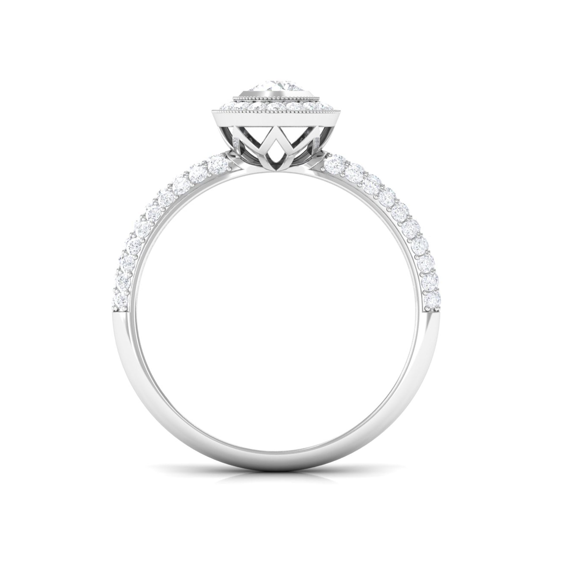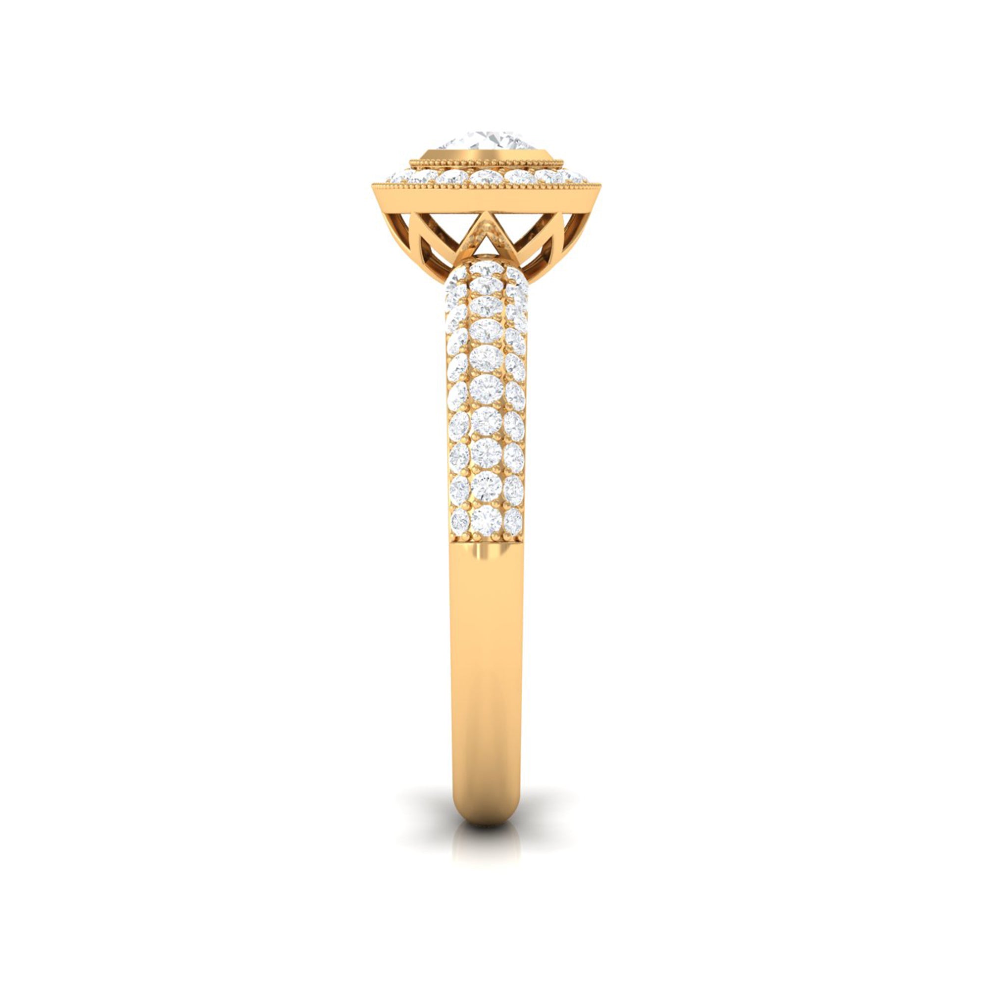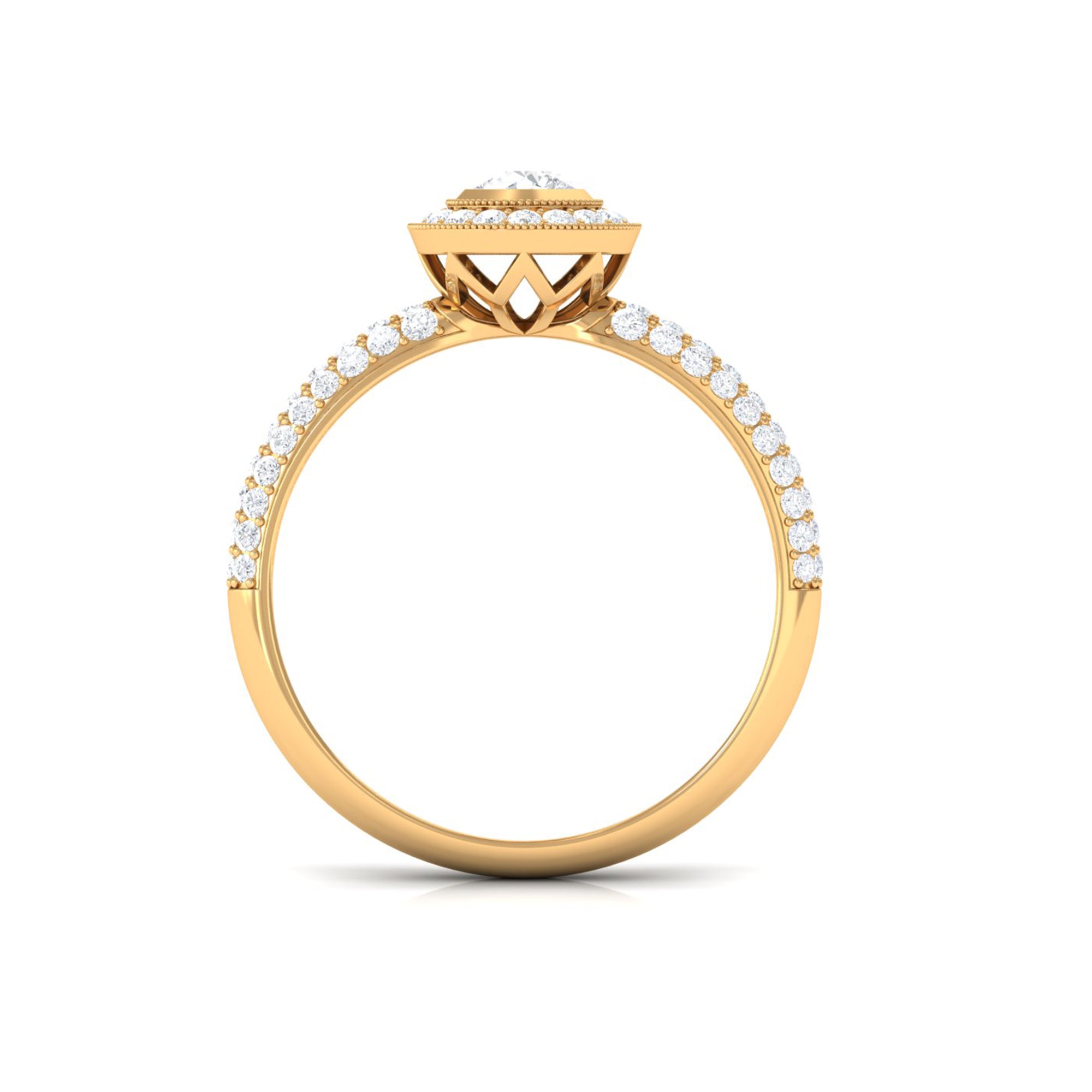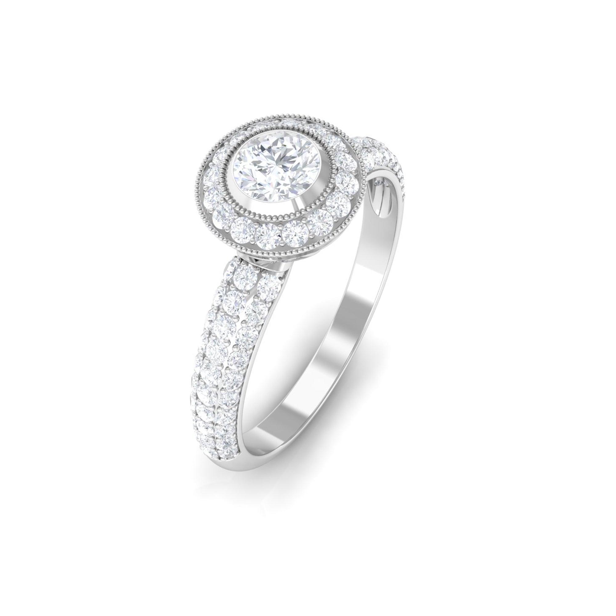 This Diamond Engagement Ring is the ideal finishing touch for those romantic occasions. It features intricate details that exude timeless beauty. At its heart, there is a 4 MM round cut diamond of HI-SI quality that truly shines, set in a secure bezel and surrounded by a halo of round cut stones with beaded accents. The band of this Vintage Engagement Ring is a true work of art, embellished with additional round cut diamonds that create a dazzling sparkle from every angle. Symbolizing love and commitment, this Vintage Diamond Ring captures elegance and timelessness, showcasing a classic yet radiant look that never fades from fashion. This Round Engagement Ring includes a quality assurance certificate and comes beautifully packaged in a chic, protective box, making it perfect for gifting or safe storage when not in use. Whether you are a bride on the hunt for a Diamond Halo Engagement Ring or someone who adores vintage-inspired pieces for special events, this Art Deco Ring will surely add a distinctive touch to your style.