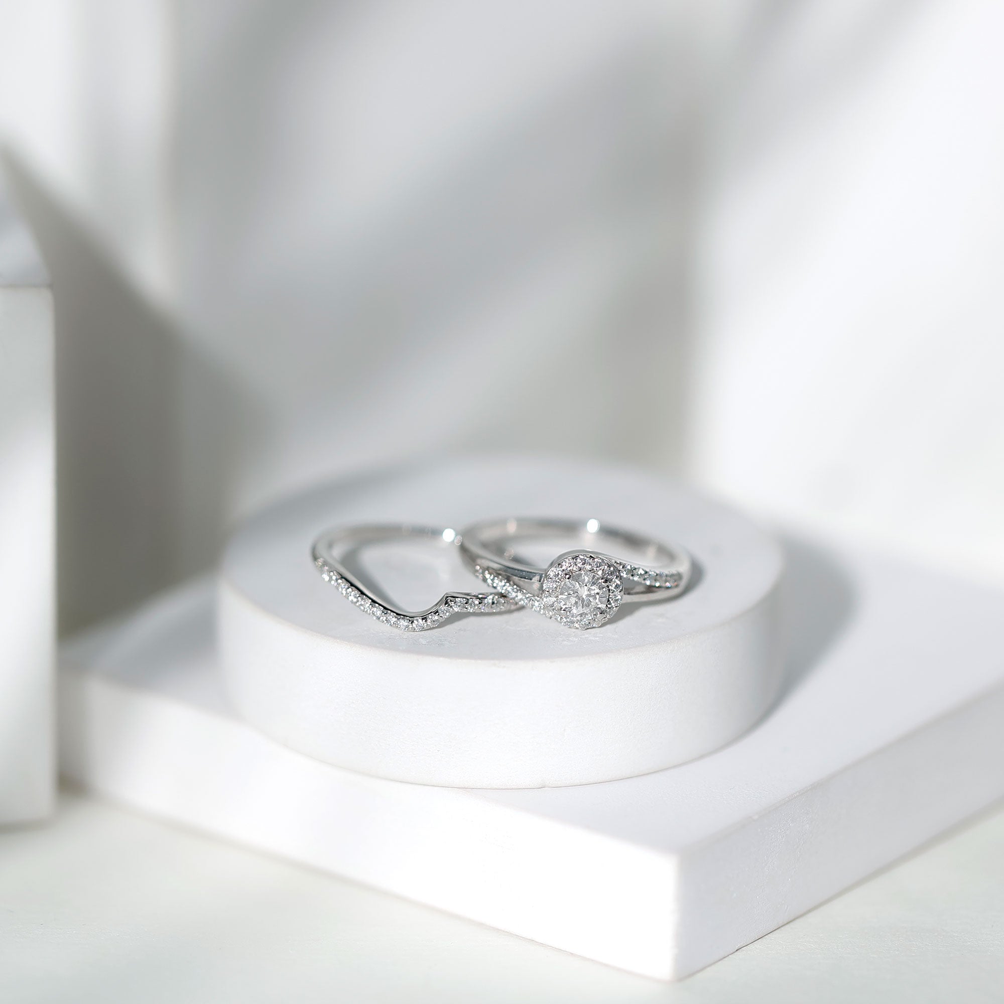 A carefully structured engagement ring serves as the focal point, while the accompanying wedding band is shaped to align comfortably alongside it. This intentional pairing ensures a cohesive silhouette on the finger, eliminating the need to search for a separate matching band later. The design prioritizes visual continuity, balanced sparkle, and a refined overall profile.