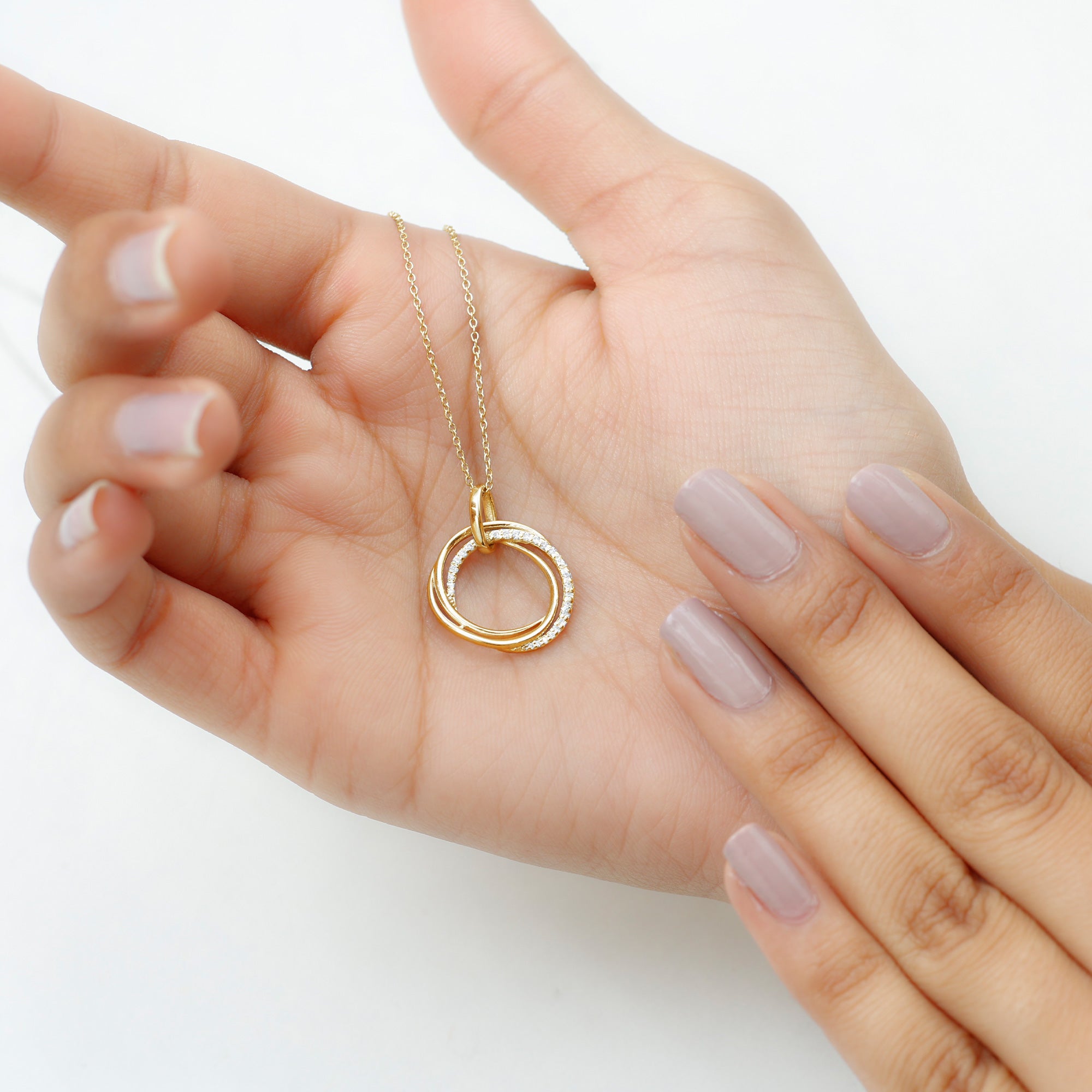 Celebrate the strong connections with this Diamond Necklace, which is an essential everyday piece of jewelry that she would love to wear all day long. This Pendant is adorned with Round Shape Diamond in Pave Setting, sitting in a circle; the other circles are too intertwined together, making it an unwavering protection and boundless devotion. Dangling through a chain, this Interlocking Circle Necklace displays the common symbol for a never-ending life, a lifelong bond between a couple. Symbolising lasting connections, this Circle of Life Necklace creates a symbol of togetherness and infinite love. As a minimal and timeless design, this Promise Necklace has a timeless appeal, ensuring that it will be treasured for years to come. So, uphold the beauty of connection with the Circle interlocking Necklace celebrates the eternal bond of love and connection that transcends time. A circle pendant symbolizes a never-ending journey or pathway of life, a continuous and ongoing adventure or experience.