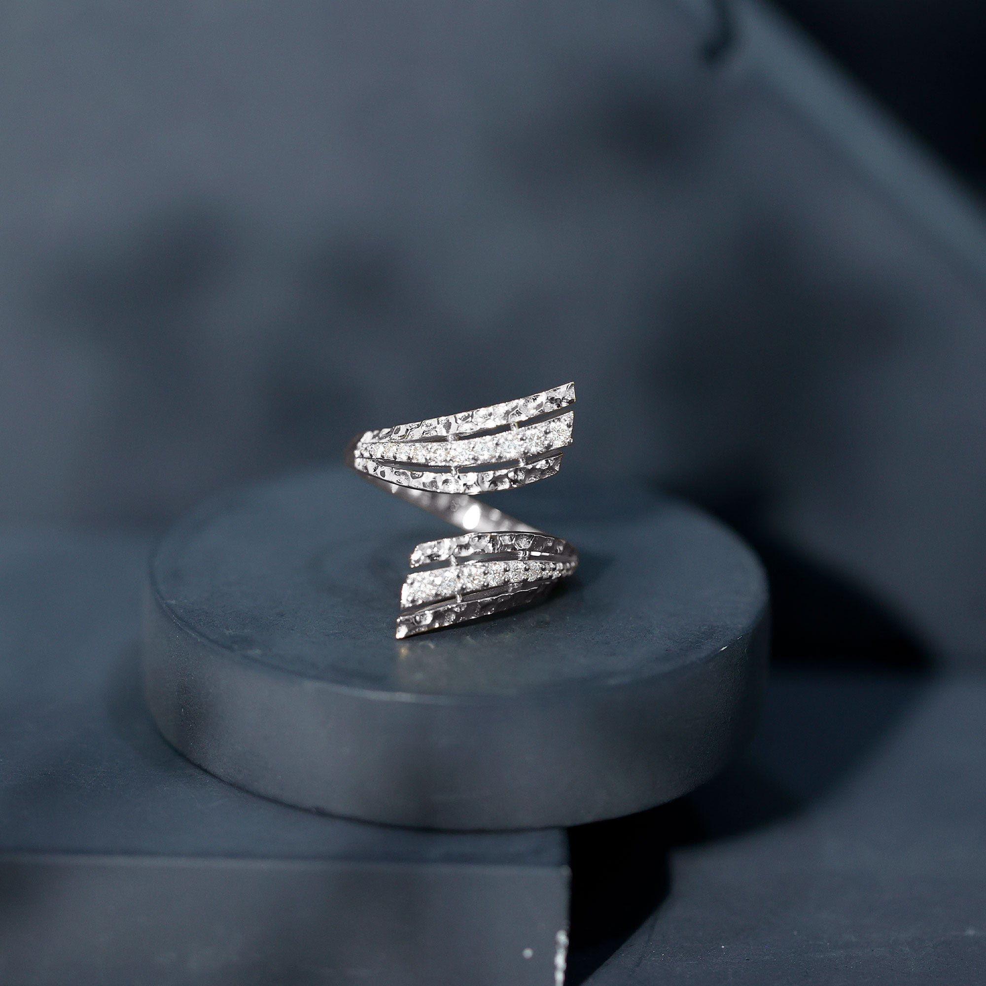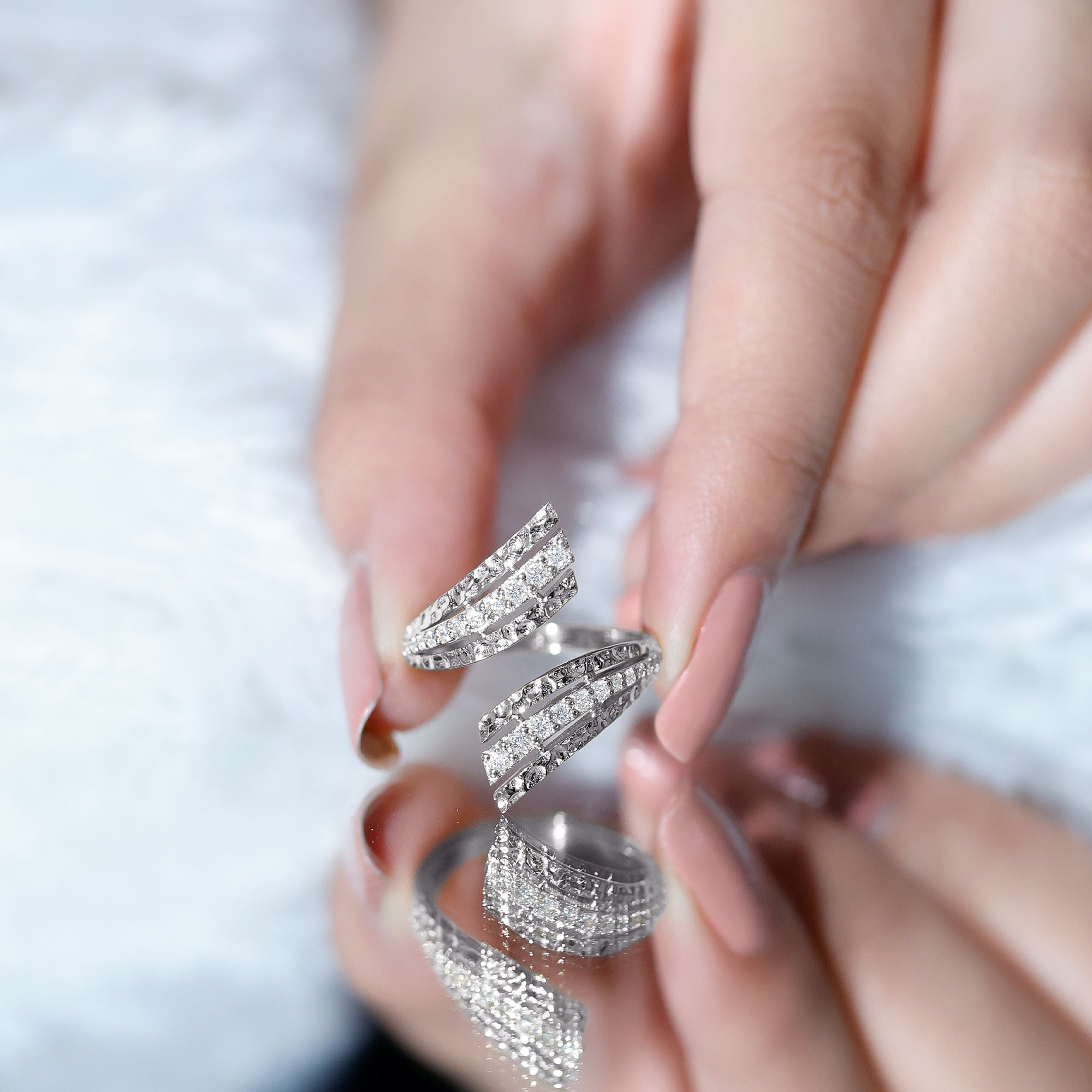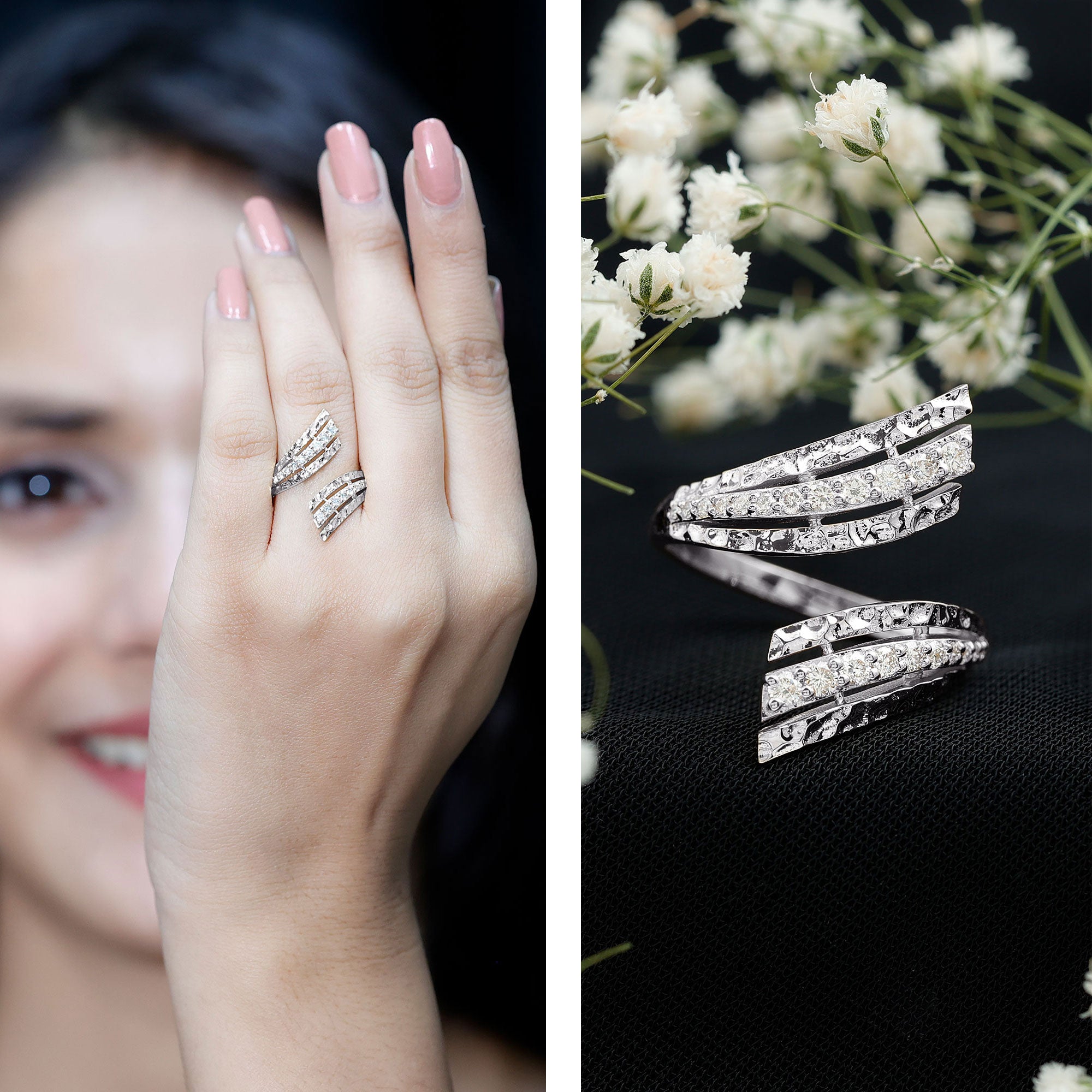 Step into the spotlight with this Statement Diamond Ring for Women - a design that effortlessly blends bold structure with artistic elegance. This Cocktail Ring is not just a piece of jewelry, it is a conversation starter wrapped around your finger. Crafted in a unique split-wrap style, this beauty features round brilliant cut diamonds that instantly catch the light and add a dazzling shine to the ring. The textured finish adds a modern and artistic touch to the overall design, making it look rich and detailed from every angle. What makes this Diamond Wrap Ring truly special is how the multiple strips are connected to one band. So, while it looks like stacked rings, it is actually one piece that is easy to wear and super stylish. This Diamond Cuff Ring is the perfect mix of sparkle and texture. Whether you are heading to a party or just love making a statement with your jewelry, it is sure to grab attention and compliments with every move.