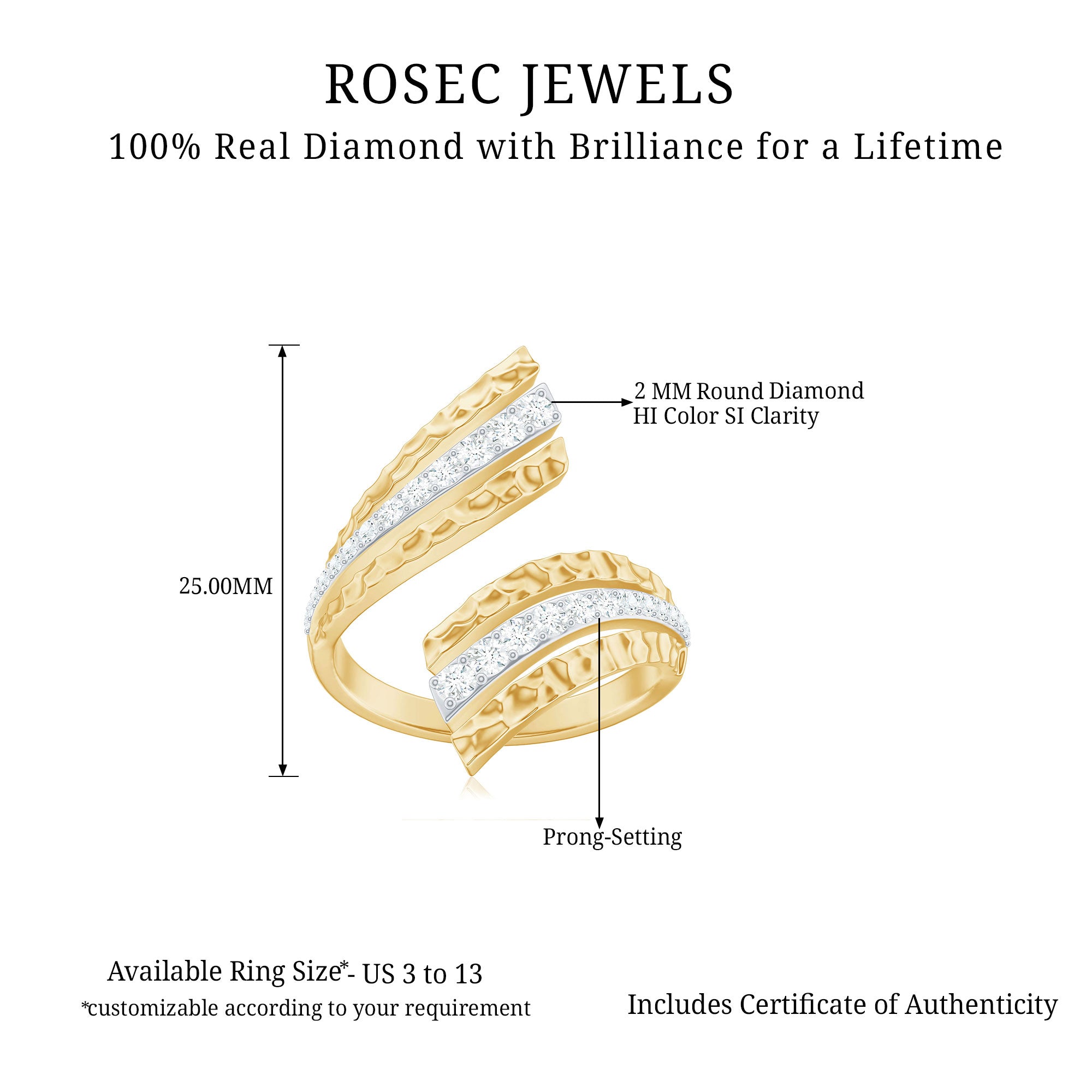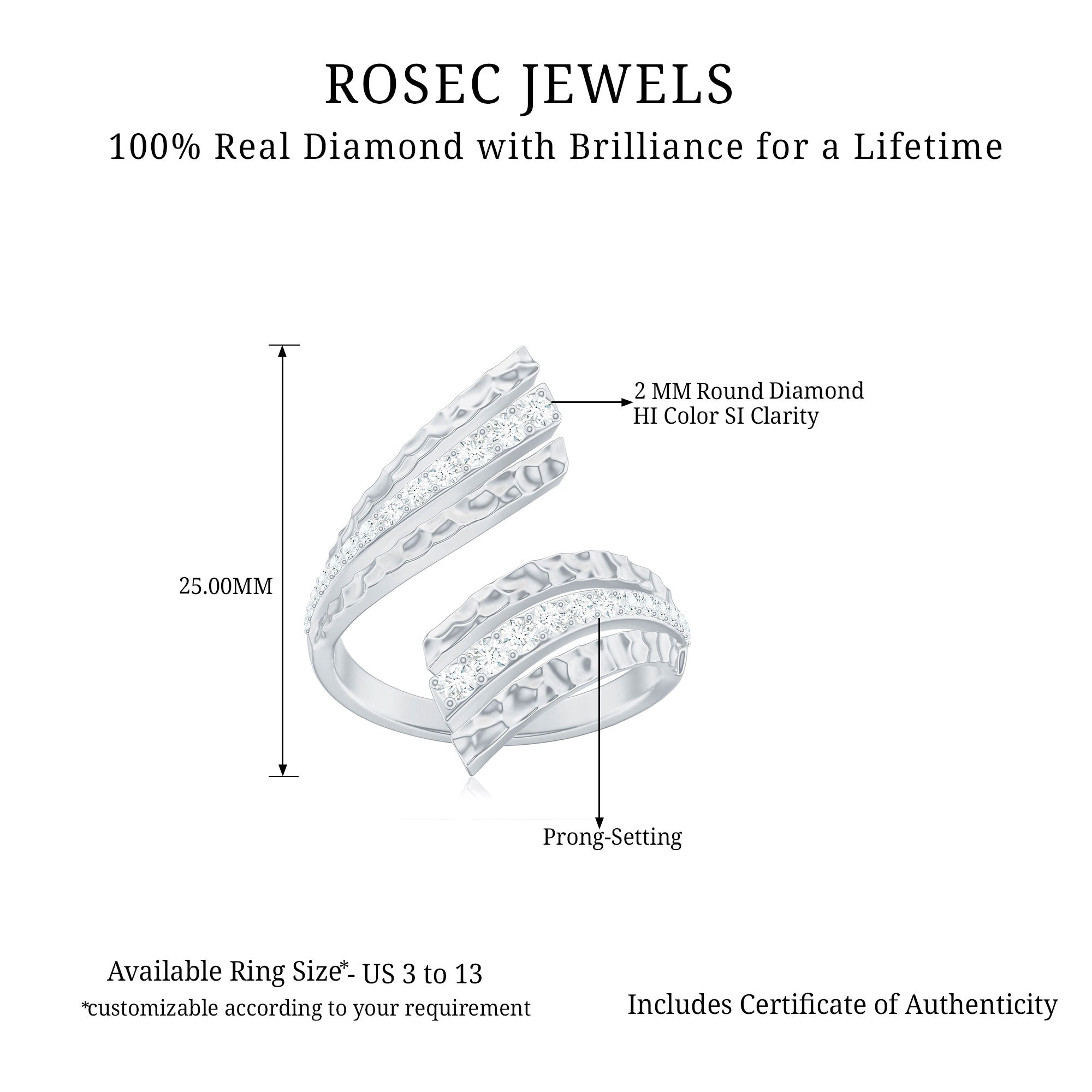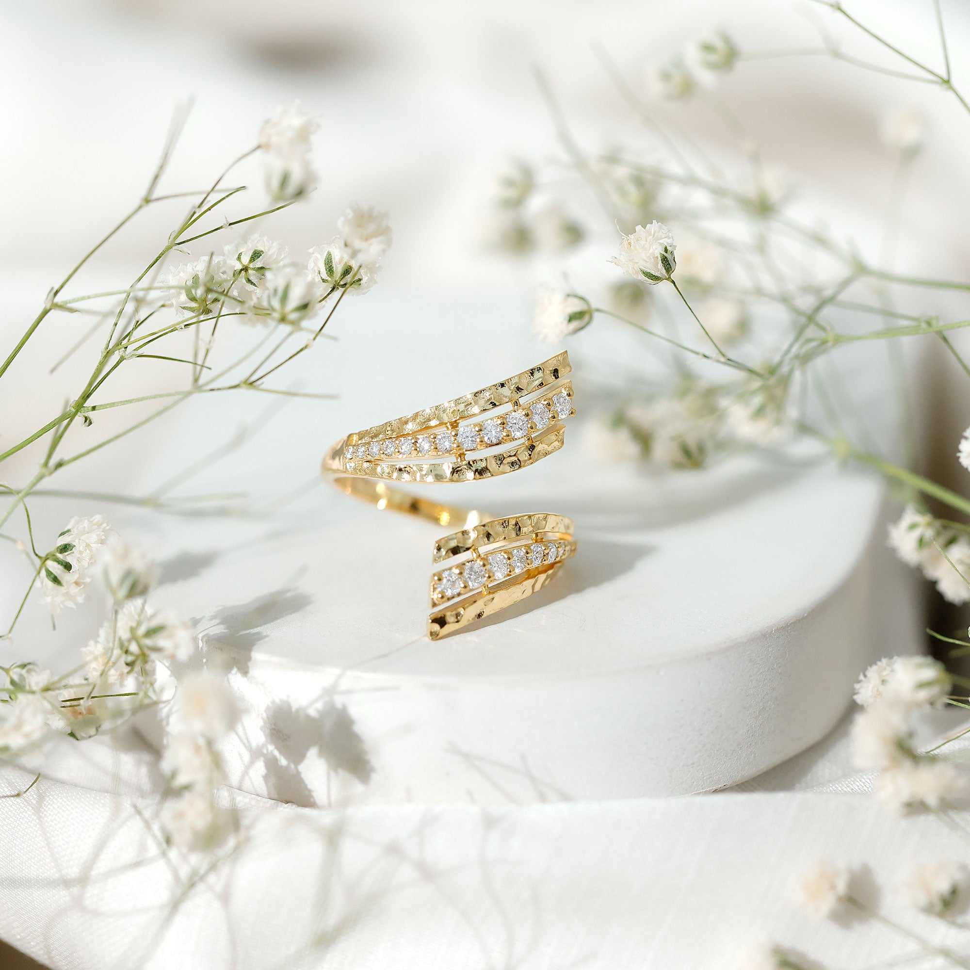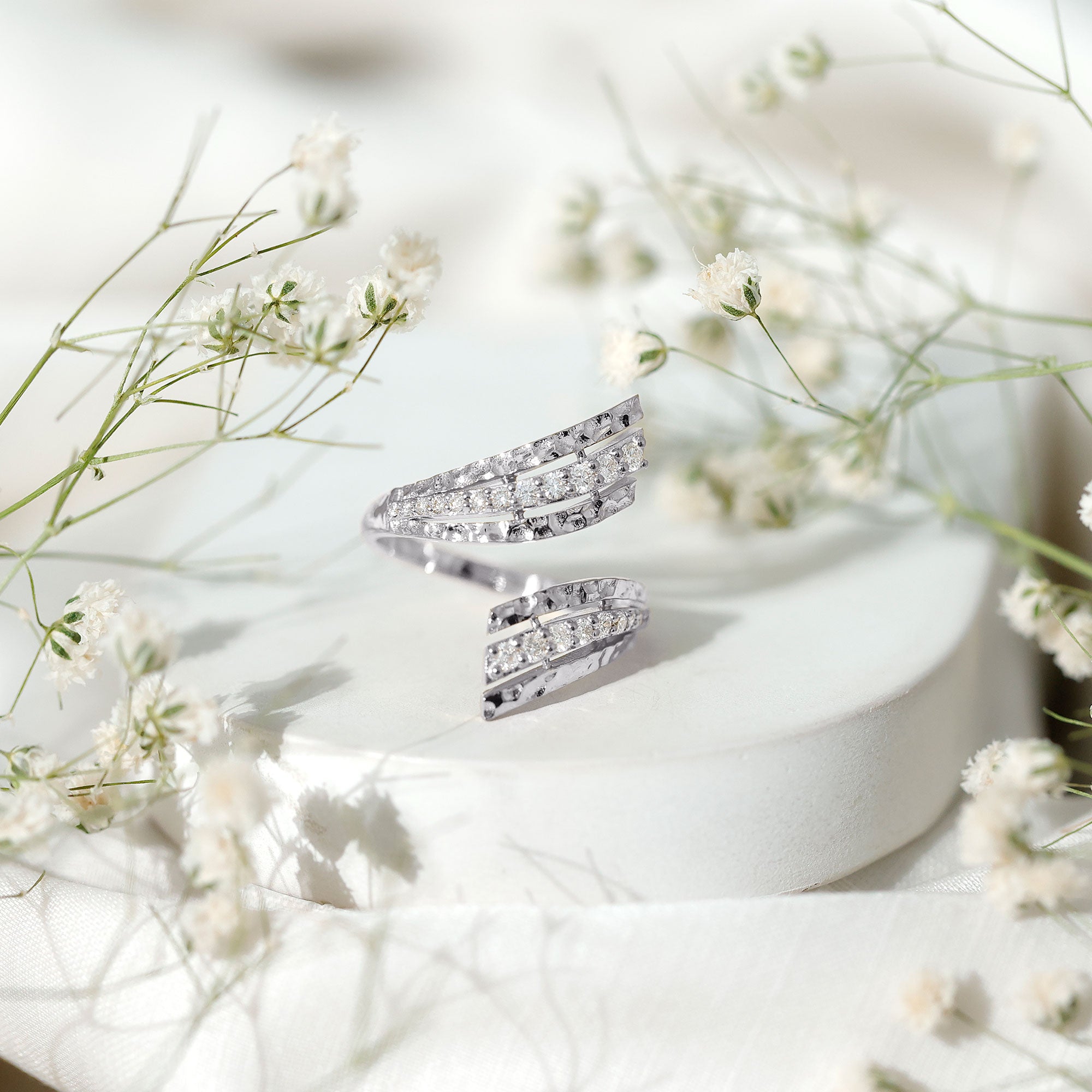 Step into the spotlight with this Statement Diamond Ring for Women - a design that effortlessly blends bold structure with artistic elegance. This Cocktail Ring is not just a piece of jewelry, it is a conversation starter wrapped around your finger. Crafted in a unique split-wrap style, this beauty features round brilliant cut diamonds that instantly catch the light and add a dazzling shine to the ring. The textured finish adds a modern and artistic touch to the overall design, making it look rich and detailed from every angle. What makes this Diamond Wrap Ring truly special is how the multiple strips are connected to one band. So, while it looks like stacked rings, it is actually one piece that is easy to wear and super stylish. This Diamond Cuff Ring is the perfect mix of sparkle and texture. Whether you are heading to a party or just love making a statement with your jewelry, it is sure to grab attention and compliments with every move.