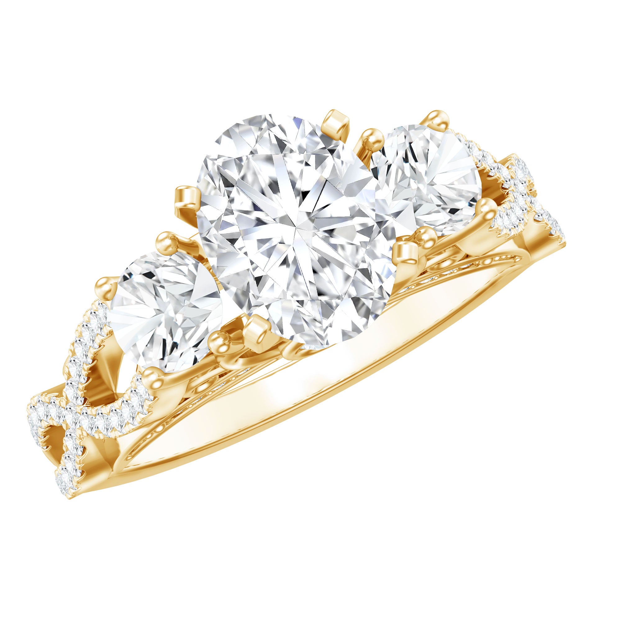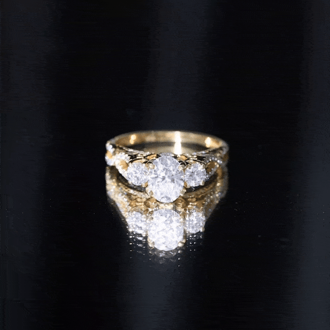 Designed for those who appreciate vintage charm with a touch of modern elegance, this gorgeous Lab Created Diamond Engagement Ring represents the perfect emblem of a love story. At its heart sparkles a captivating 6X8 MM oval lab grown diamond, accompanied by two round brilliant cut side stones that provide balance, shine, and irresistible charm. Each diamond is lab grown, ensuring this beauty is not only stunning but also ethically made for modern couples. The band of this Oval Diamond Engagement Ring is a work of art in itself - a criss cross shank elegantly wraps around the finger, embellished with tiny diamonds that twinkle with every move. The sophistication extends to the gallery, where the craftsmanship is truly breathtaking. Underneath the center stone lies a detailed vintage-inspired design, featuring a bezel set diamond and designer patterns, all adorned with accent stones. A classic piece designed to impress from every perspective, this Three Stone Engagement Ring is more than just jewelry, it is a promise, a memory, and a representation of your past, present, and future together.