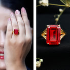 This Emerald Cut Ruby Ring is an absolute work of art that fuses modern sophistication with a hint of vintage allure. Handcrafted from sterling silver and plated with 14k yellow gold, it showcases a stunning 10X14 MM Emerald Cut Lab Grown Ruby set in Basket Setting as a Solitaire, bringing a dazzling sparkle to the piece. The vintage-inspired design of this Emerald Cut Engagement Ring is ideal for anyone who appreciates classic and timeless jewelry. This Lab Created Ruby Engagement Ring is suitable for any special event, whether it is a wedding or a cocktail party, and it truly stands out as a statement piece that adds a dash of elegance to any outfit. The Solitaire Ruby Ring features a split shank design, lending a contemporary flair that enhances its elegance on the finger. The split shank band design adds an extra layer of charm, while the vintage-style patterns beneath the stone give this Red Stone Engagement Ring a sophisticated and romantic vibe. Plus, it comes in various metal color options, allowing you to select your favorite and create a more personalized piece of jewelry.