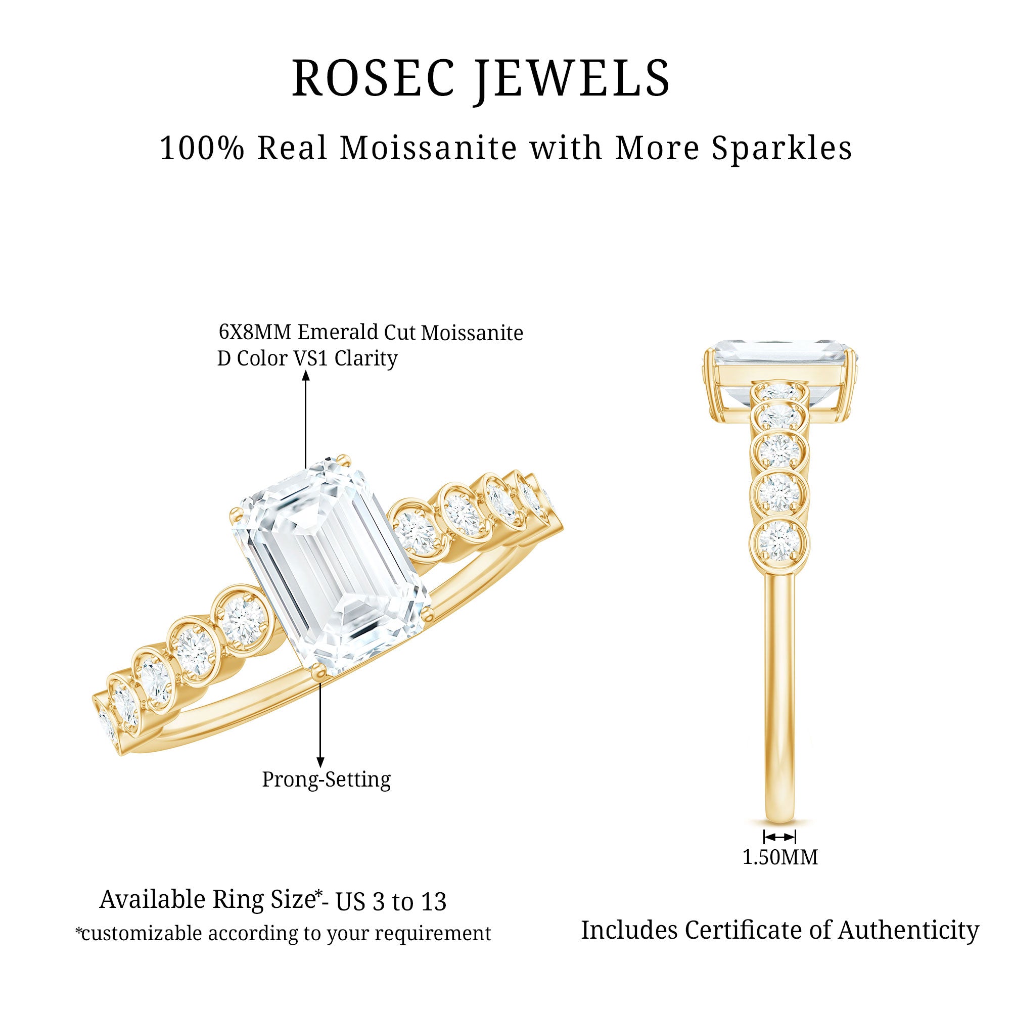 Dazzle with Distinction in this Emerald Cut Moissanite Engagement Ring – a testament to quality, elegance, and everlasting love. Celebrate a moment that defines forever with this 6X8 MM emerald cut moissanite solitaire engagement ring, a stunning creation that combines clarity, brilliance, and timeless allure. With a total weight of 2.47 ctw, this certified moissanite ring exudes brilliance from every angle. The bold emerald-cut center stone, set securely in a classic prong setting, is flanked by a graceful lineup of round moissanites along the band, making it a perfect choice for those who seek moissanite rings that balance tradition with modern sparkle. This engagement ring is designed to mark one of lifes most cherished milestones with poise and passion. Ideal for the woman who admires vintage charm yet desires a contemporary twist, this piece draws inspiration from emerald cut engagement ring while radiating a modern glow. Each moissanite is hand-selected for its exceptional fire and clarity, ensuring lasting beauty and unmatched quality. Whether youre proposing or simply celebrating your love story, this emerald cut ring engagement style stands out as a brilliant representation of devotion. From romantic beginnings to enduring promises, this womens moissanite ring speaks to a journey thats just beginning—crafted to be remembered and admired for generations.