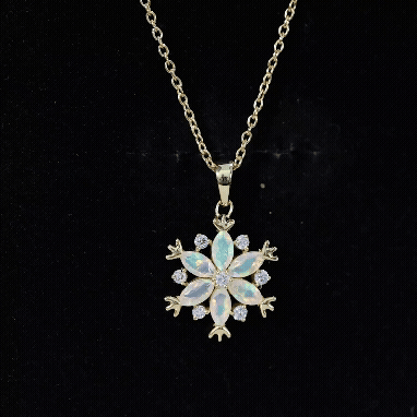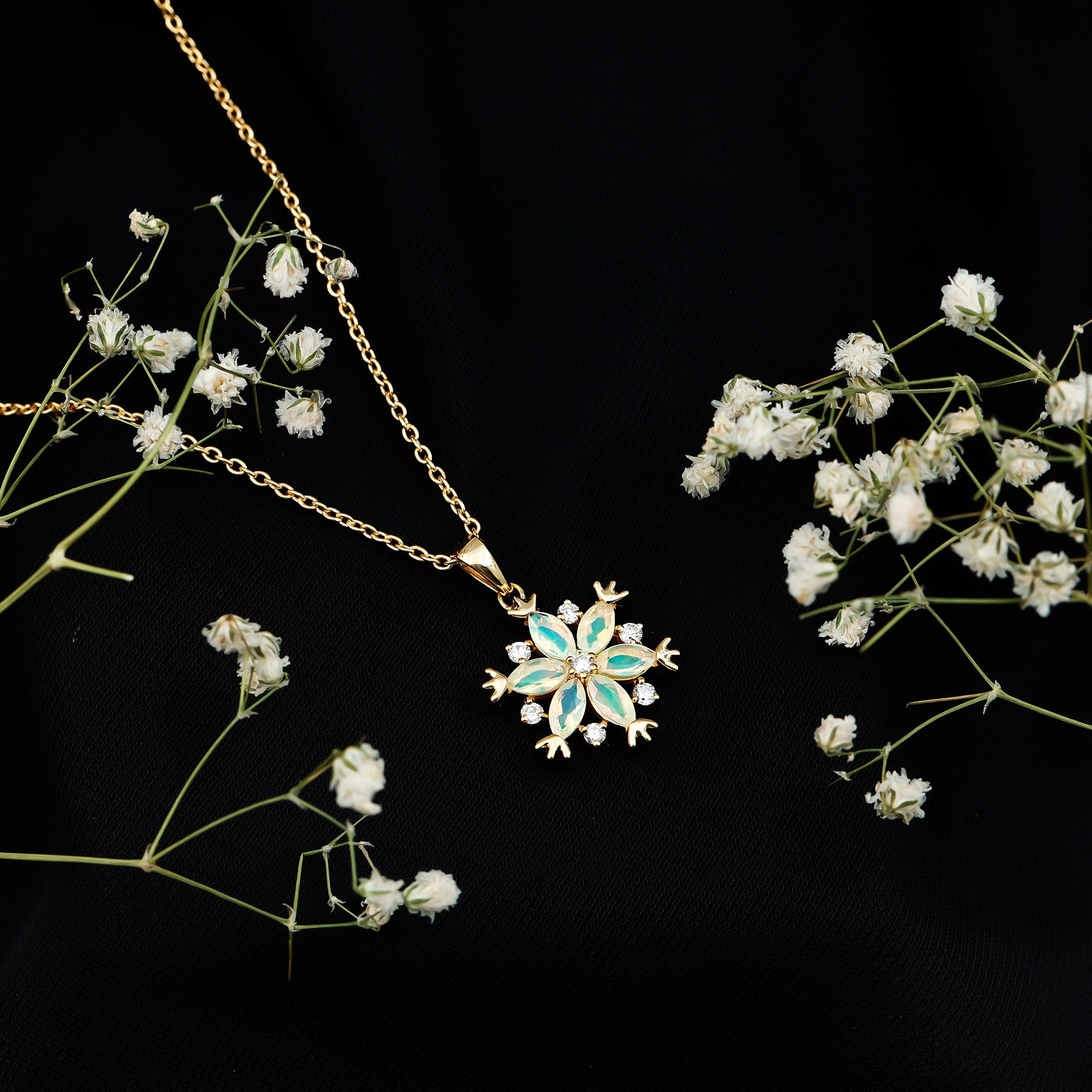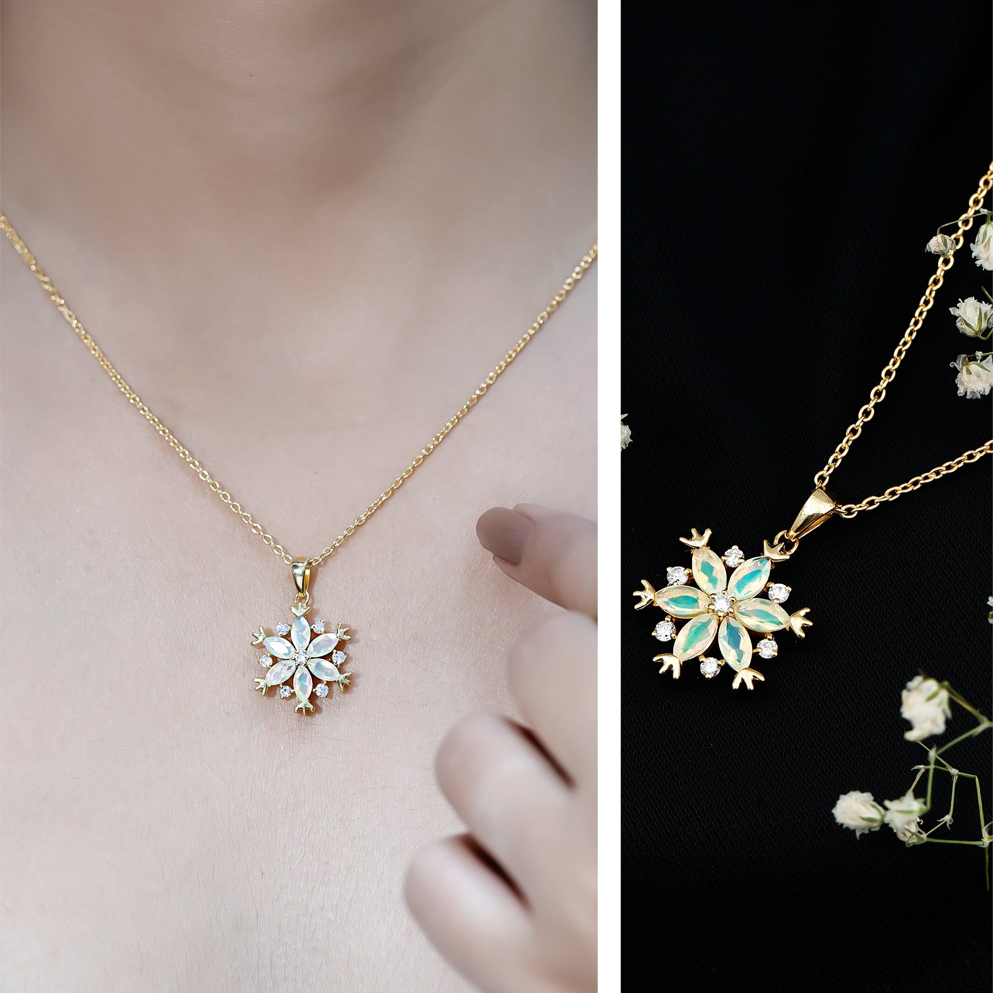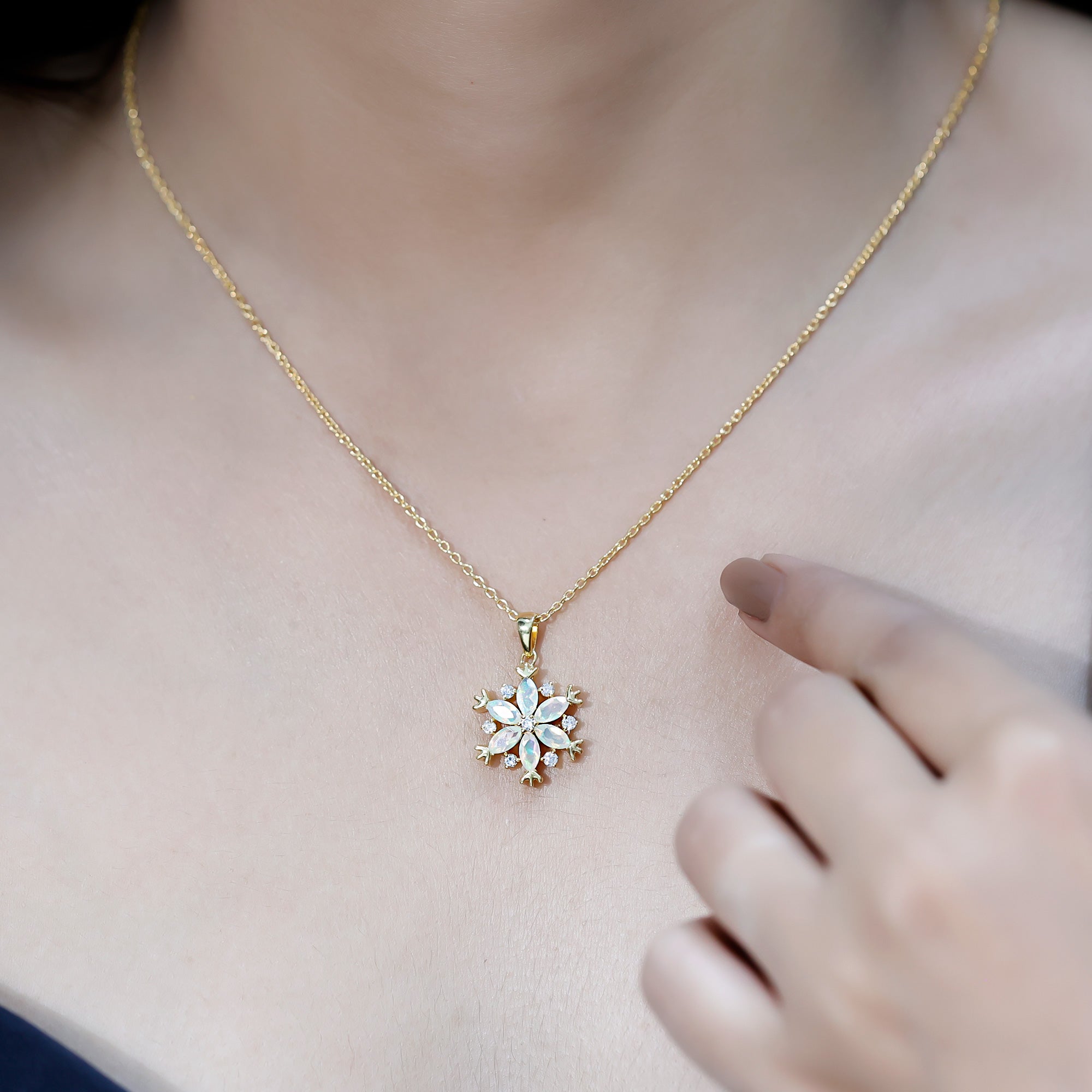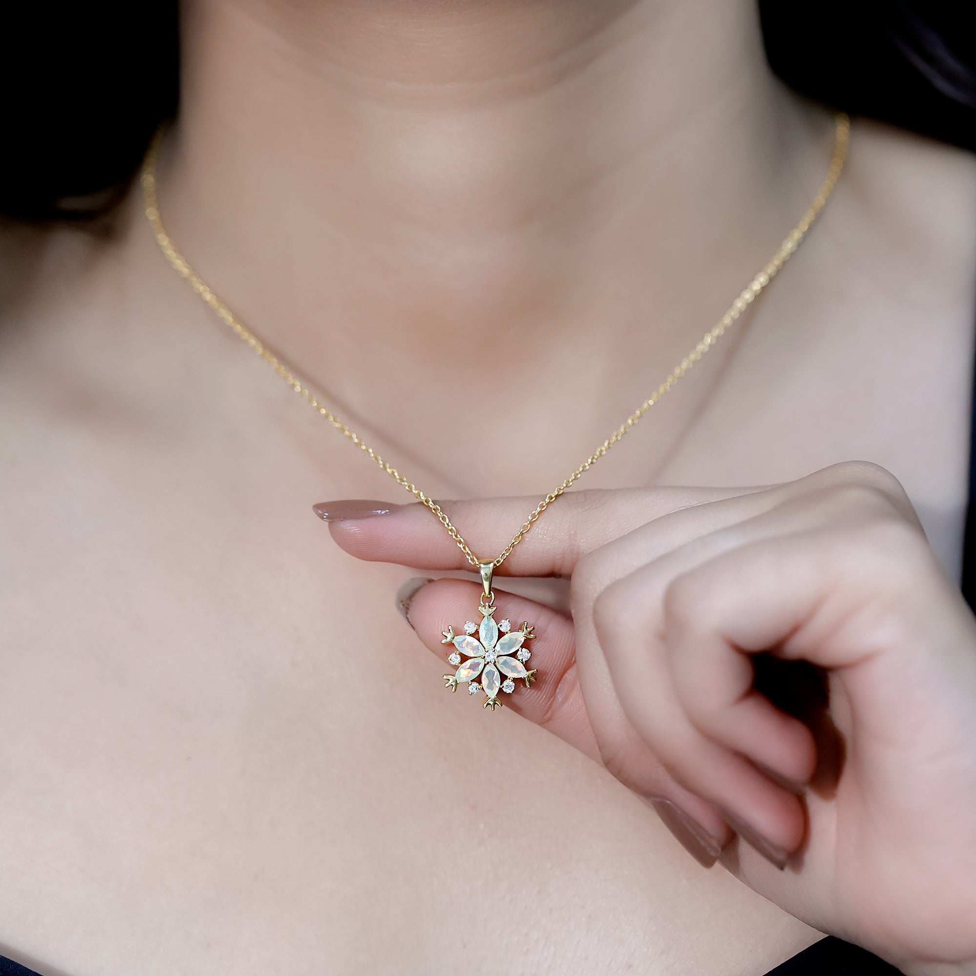 Celebrate the magic of the season with this stunning Snowflake Necklace, beautifully crafted in Yellow Gold Plated Silver. Designed to capture the sparkle of winter, this Fine Pendant Necklace showcases glowing 3X6 mm Marquise Shape Ethiopian Opal stones arranged in a delicate snowflake pattern, accentuated by sparkling Lab Grown Diamond stones that shimmer with every movement. Suspended from a sleek, comfortable chain, this Opal Pendant Necklace is perfect for everyday wear yet elegant enough to elevate any holiday outfit. Whether you are dressing up for festive gatherings or adding a touch of sparkle to a cozy winter look, this Opal Diamond Necklace brings warmth and style to any moment. This Silver Opal Necklace arrives in a beautifully crafted jewelry box, making it a thoughtful and ready-to-gift surprise for someone special, perfect for Christmas, winter birthdays or simply showing love through a meaningful piece of jewelry. This Real Opal Necklace is a celebration of the beauty of winter, crafted to be cherished year after year.