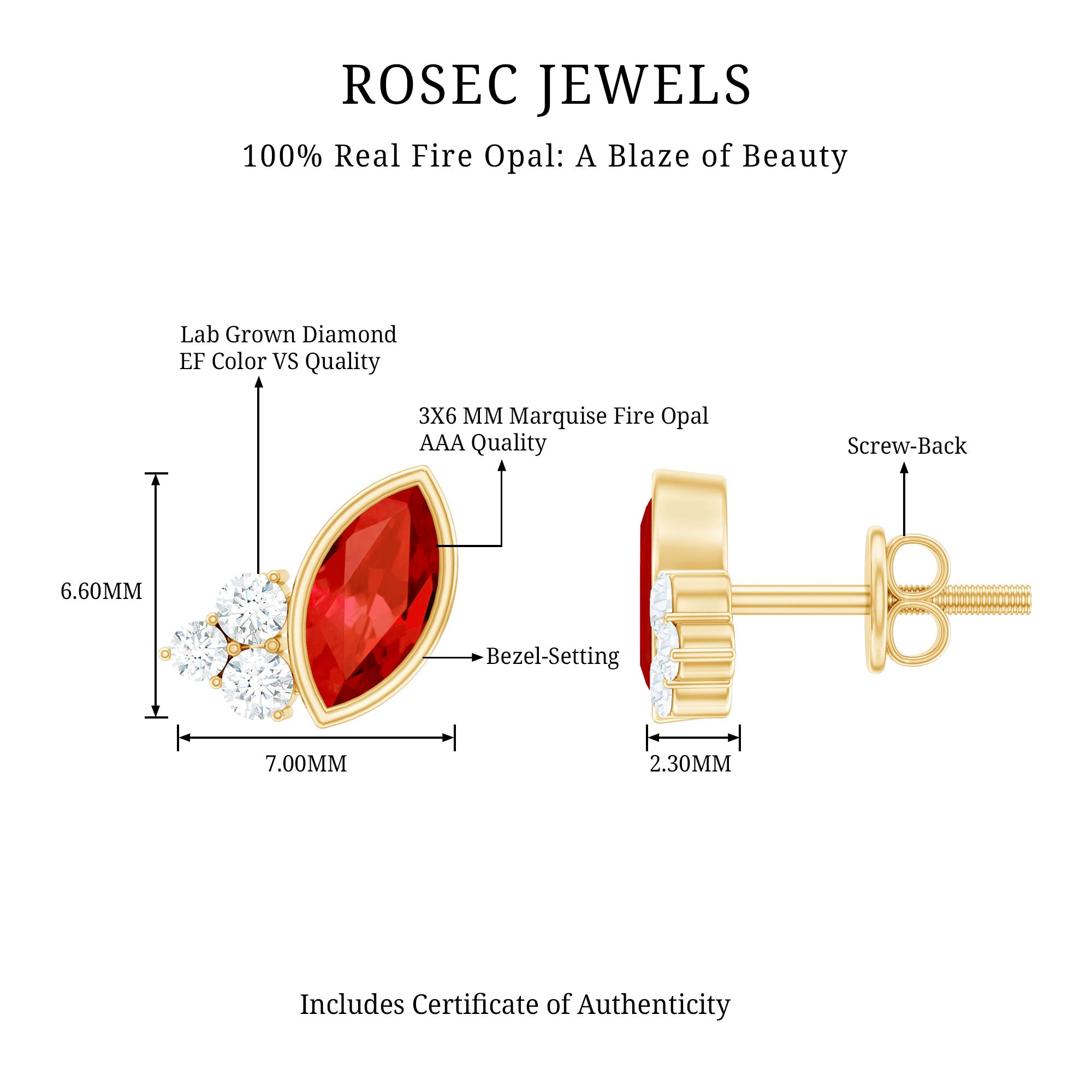 Feel the vibrant energy of these Fire Opal Stud Earrings, which bring bold elegance to your jewelry collection. Thoughtfully crafted in yellow gold plated silver, these Simple Earrings feature a stunning 3X6 MM marquise cut natural Fire Opal, set in bezel setting. A delicate trio of round cut lab grown diamonds accent one side of each earring, adding just the right amount of sparkle. With EF color and VS clarity, these diamonds beautifully highlight the glowing AAA quality opal, creating a lovely contrast that feels both modern and timeless. Secured with comfortable screw back closures, these Fire Opal Earrings are perfect for daily wear. Whether you are dressing up for a special occasion or adding a touch of color to your everyday outfit, they offer effortless elegance with a unique twist. As the birthstone for October, Fire Opal makes these Marquise Earrings a meaningful gift for someone special, or a personal treat if you love bold, colorful gems. Their simple design makes them easy to pair with anything, from workwear to weekend outfits. Full of warmth, charm, and character, these Fire Opal and Diamond Earrings are a beautiful way to wear your birthstone or simply enjoy a pop of fiery color with timeless style.