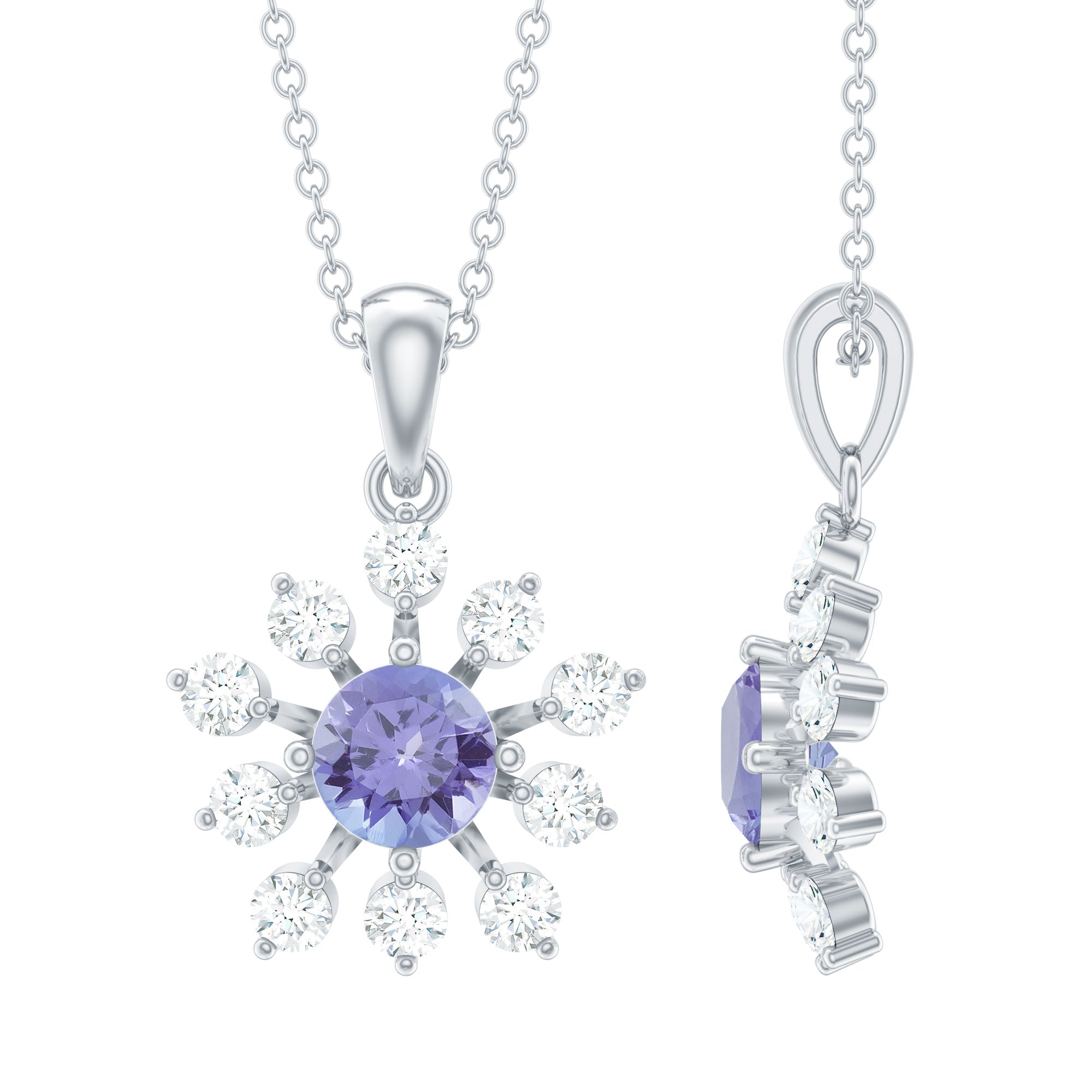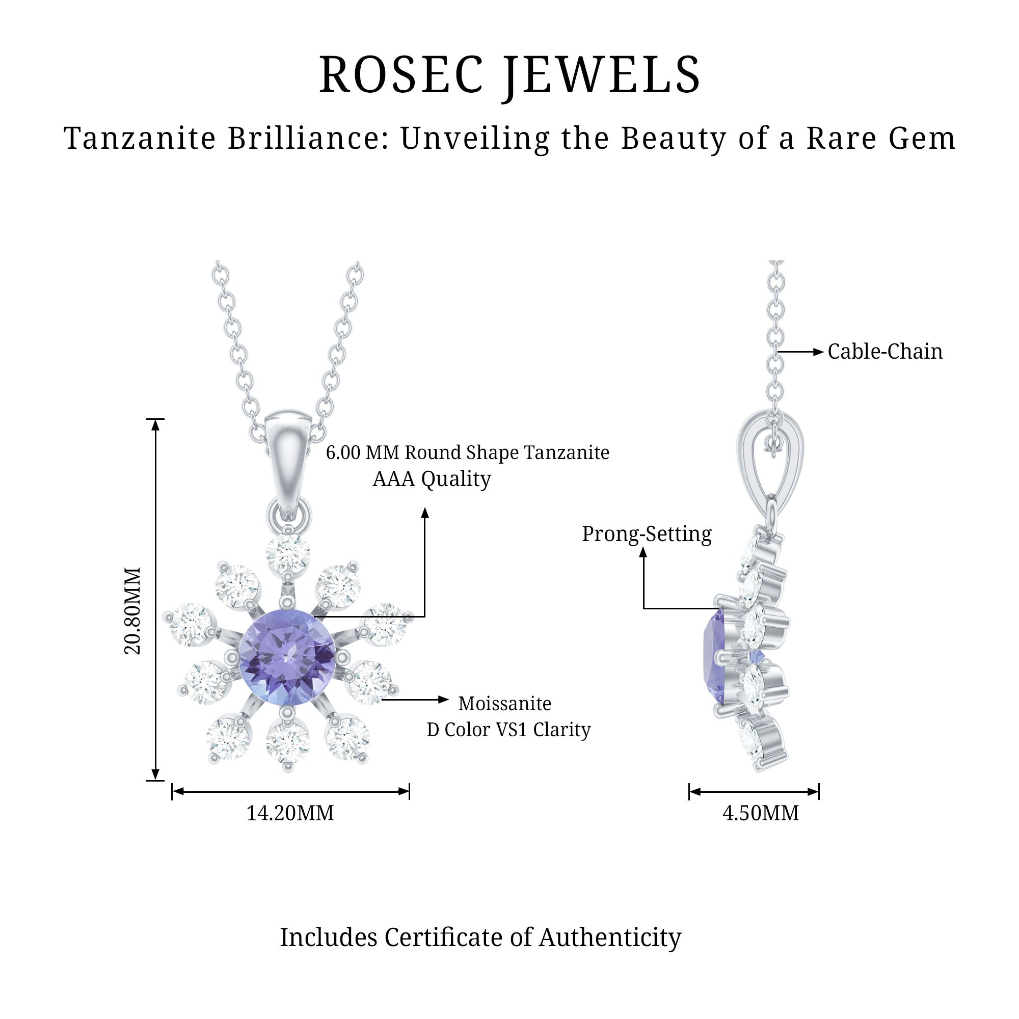 This Tanzanite Pendant Necklace is a quiet reminder that beauty is found in the little things. Handcrafted in 14k white gold plated silver, it features a 6 MM round cut tanzanite, held securely in prong setting. Radiating from it are sparkling round moissanites, each one carefully set to form a stunning snowflake inspired pattern. This Blue Snowflake Necklace is suspended from a fine, polished chain that rests gently on the neckline, comfortable enough for everyday wear, yet striking enough to wear for special occasions. The snowflake shape symbolizes individuality, clarity, and the beauty of fleeting moments, making it a meaningful gift for celebrating milestones, or fresh starts. Thoughtfully made with AAA quality tanzanite and D-VS1 clarity moissanite, this piece is not only beautiful but also crafted with high quality stones. It is a thoughtful choice for anyone who loves conscious luxury with a timeless touch. Whether you are gifting it to someone special or adding it to your own collection, this Snowflake Pendant arrives in a lovely jewelry box and includes a certificate of authenticity, so it is ready to make an impression. It is a wearable piece of art that captures the quiet magic of winter and the strength of individuality.