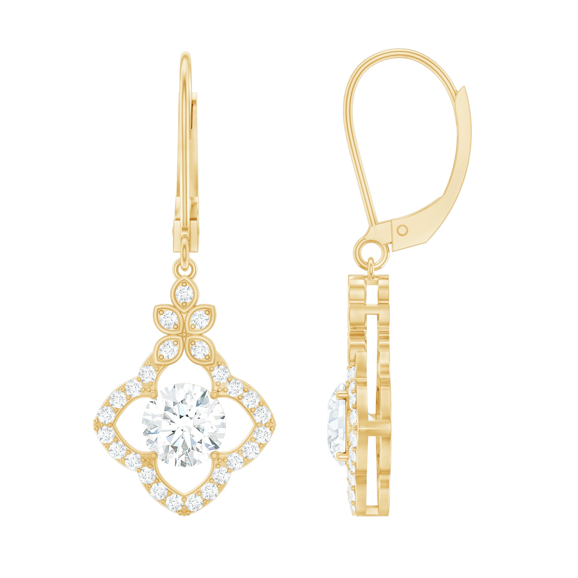 Make her eyes sparkle as brightly as these Diamond Flower Earrings. We designed these Floral Drop Earrings to capture timeless elegance and charm, featuring a 6 MM round cut diamond (lab grown) in the center, set in prong setting. The center stone is surrounded by a floral-inspired diamond halo and a unique cluster of petals is placed at the top, crafted with fine attention to detail, giving these Drop Diamond Earrings a graceful and feminine touch. These Dangling Earrings are curated with lever back closure, ensuring both comfort and security, ideal for all-day wear. To guarantee premium craftsmanship, these affordable April Birthstone Earrings come with a certificate of authenticity.