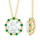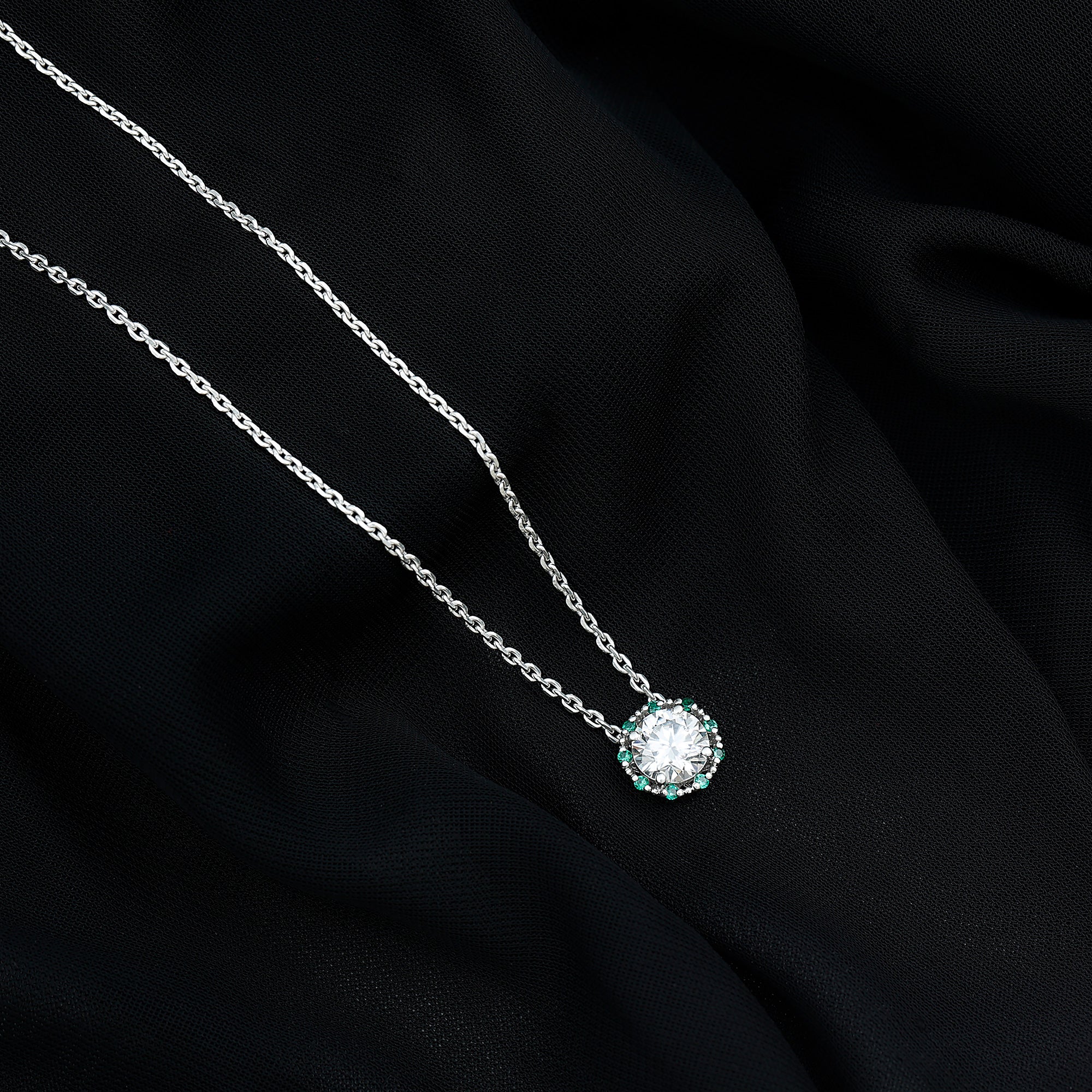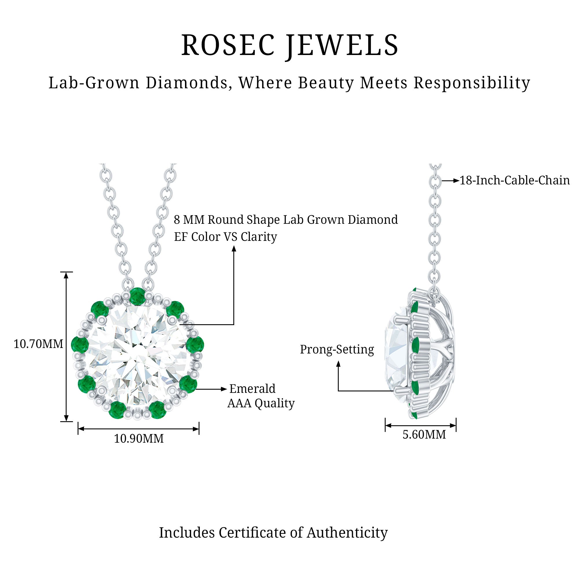 Introducing this stunning Diamond Pendant Necklace, a beautiful combination of classic elegance and modern appeal. Adorned with an 8 MM round cut diamond of EF-VS quality set in the center in prong setting, encircled by vintage inspired beadwork and deep green emerald gemstones. This hidden bail gives this 2 CT Diamond Necklace a floating effect without any distraction and makes it a versatile piece of jewelry for casual and formal outfits. This Halo Pendant is a thoughtful and affordable present for your loved one. Made with ethically sourced, lab grown diamonds, it offers the luxury of fine jewelry while being environmentally friendly.