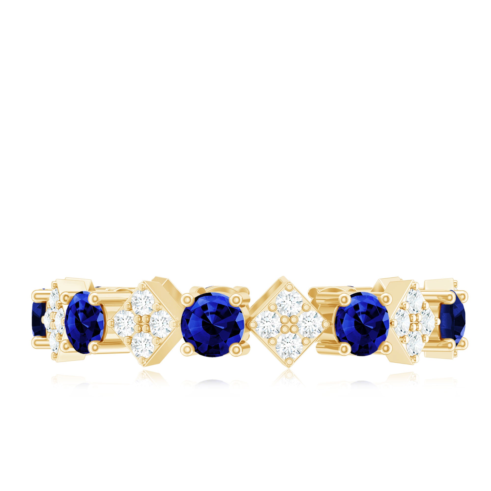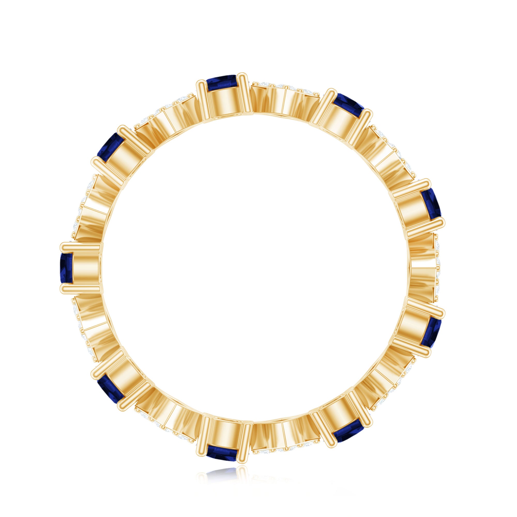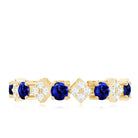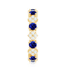 Create unforgettable memories this Valentines Day with this exquisite Contemporary Eternity Ring. Featuring Round Shape Created Blue Sapphire gems set in a secure Prong Setting and Diamond stones in a dazzling Pave Setting, this stunning Eternity Ring is crafted from Solid Gold and will keep your love alive for eternity. Its the perfect way to celebrate your golden memories together.
