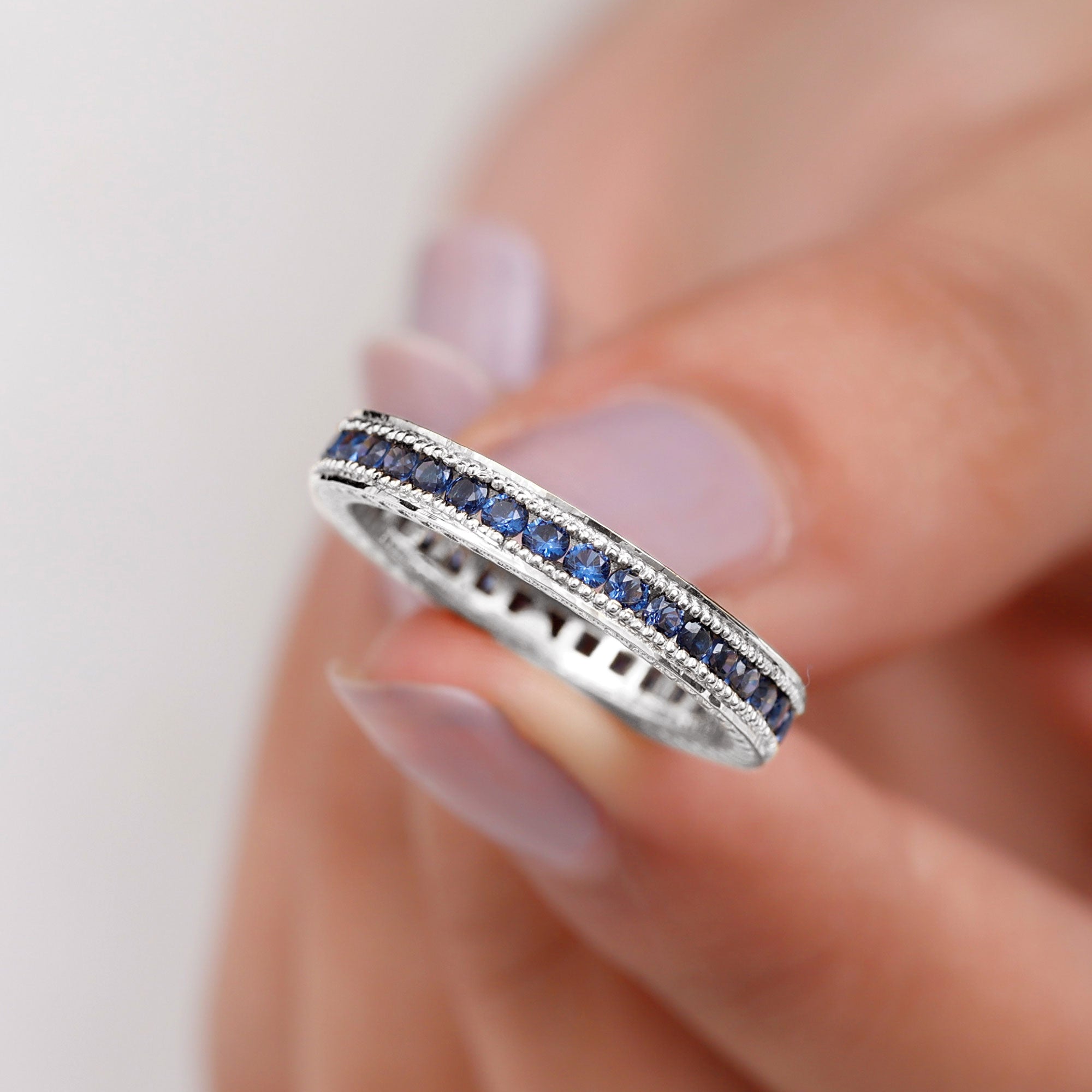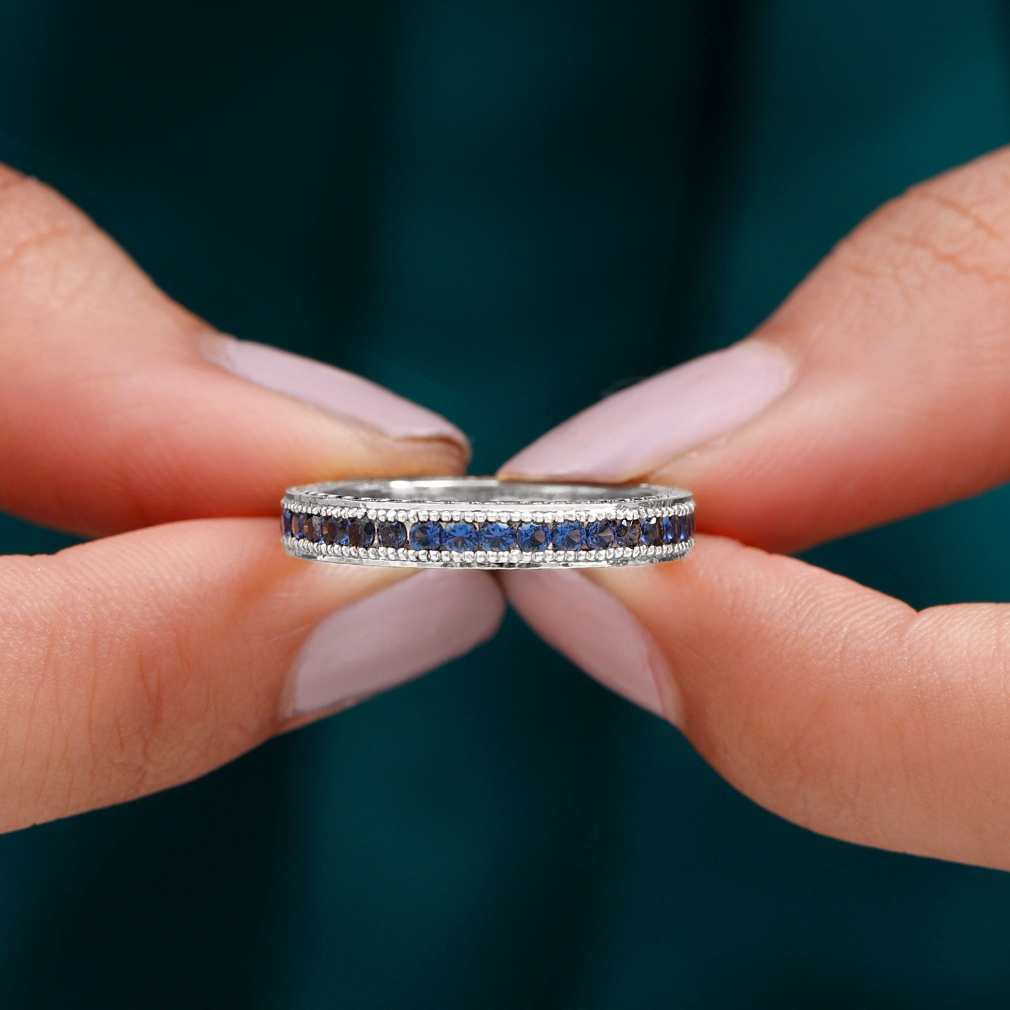 Sophisticated and modernistic, this Full Eternity Band will give you an updated look with a classic design. This illuminating band features a perfect line of sparkling round shape Lab Created Blue Sapphire set in a channel setting. This Beaded Eternity band is going to be her jewel of delight. Add a pop of vibrant elegance to any moment with this gorgeous Channel Set Eternity Band. Their edges and vivid sparkle bring a modern edge to the timeless eternity style, making this Lab Created Sapphire Wedding Band both chic and versatile. This Band Ring, crafted with AAAA Quality Lab Grown Blue Sapphire, presents the same beauty and charm as natural gemstones. It serves as an excellent option for commemorating milestones, celebrating special events, or simply enhancing everyday style with a bold yet elegant flair. Ideal for gifting or stacking, this Lab Grown Sapphire Ring complements engagement rings, wedding bands, or other eternity styles, providing countless opportunities to personalize your appearance. Offered in a range of sizes from 3 to 13, this Eternity Wedding Ring enables you to select the perfect ring for your loved one or yourself. Both charming and significant, this Anniversary Band Ring represents an affordable luxury that is truly worth cherishing.