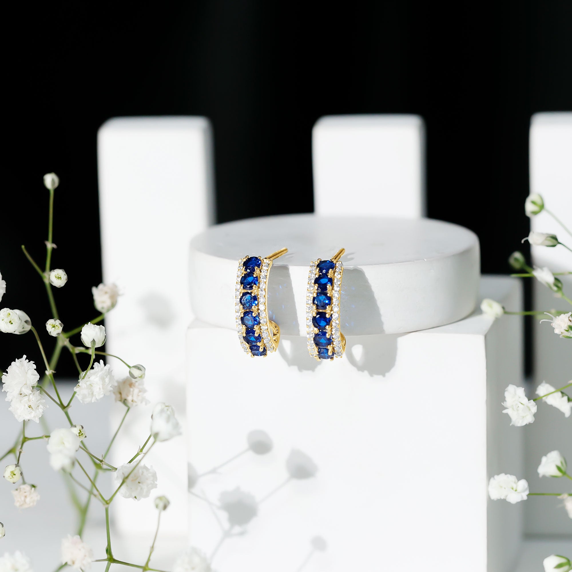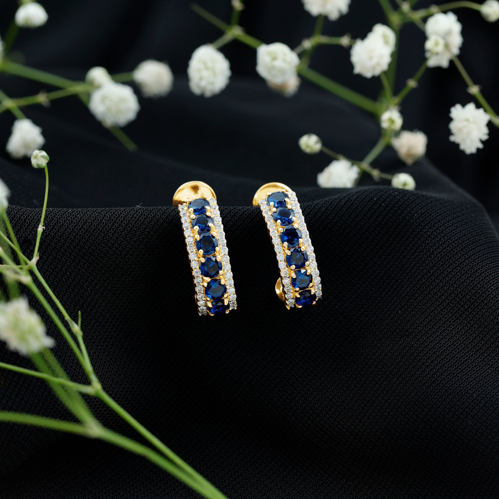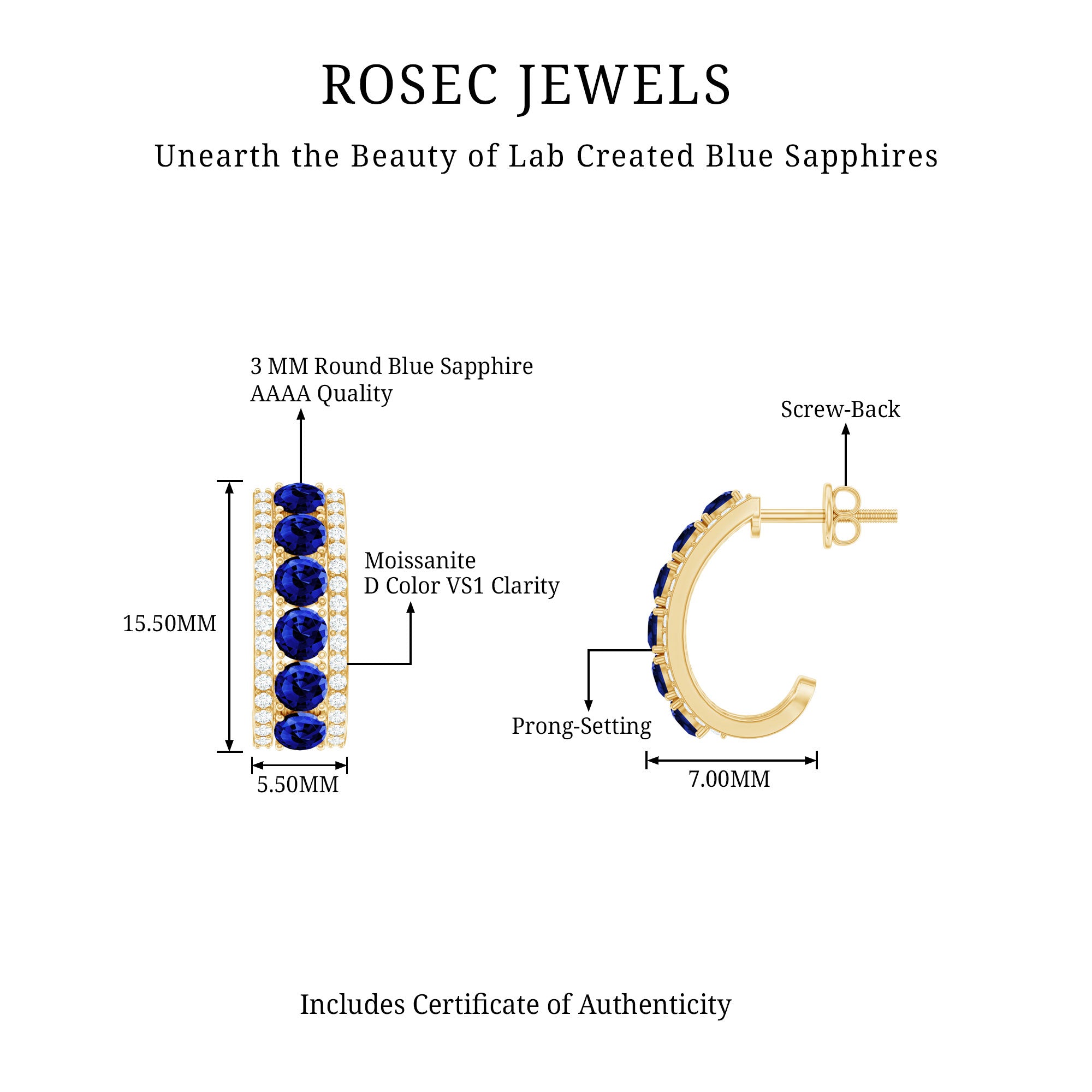 Bright blue color has a way of making any jewelry piece feel a little more royal, and these Lab Grown Blue Sapphire Earrings bring that feeling to life with every wear. These J Hoop Earrings feature a curve that hugs the ear in a stylish way. Along the center of each hoop sits a row of round lab created blue sapphires, held by prongs. On each side of the sapphires, tiny sparkling moissanite stones add a gentle shine, giving the Sapphire Hoop Earrings a balanced and elegant look. The J-shaped hoop design brings a modern twist to a classic style. These Sapphire and Moissanite Earrings add color to everyday outfits and bring a graceful touch to dressy looks. A secure screw-back closure keeps the earrings in place, making them comfortable for all-day wear. They stay steady on the ear and feel light, so you can enjoy them from morning to night without any discomfort. These Half Hoop Earrings also make a thoughtful gift for birthdays, anniversaries, or celebrations that call for something meaningful. You can wear them alone as a standout piece or layer them with other favorites.
