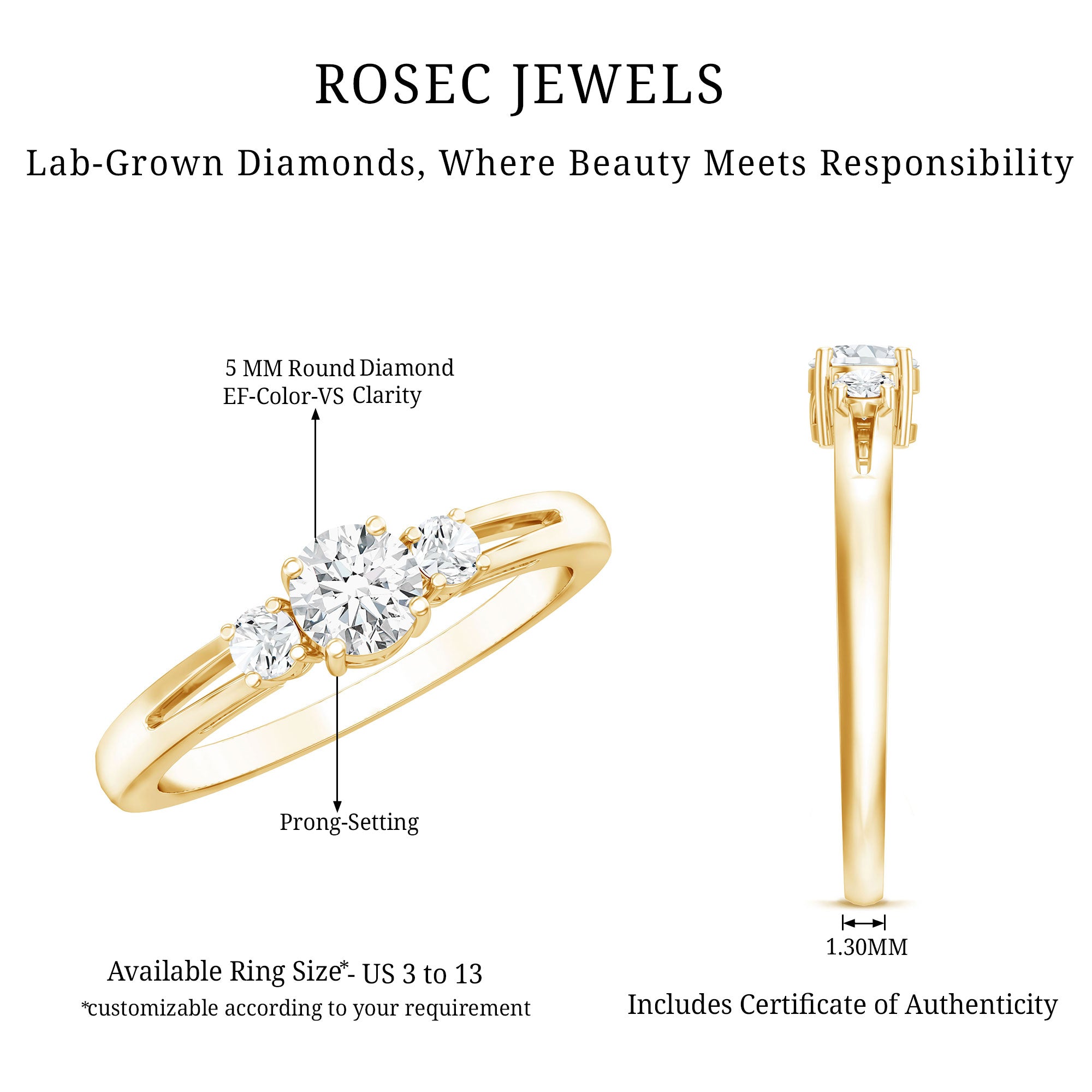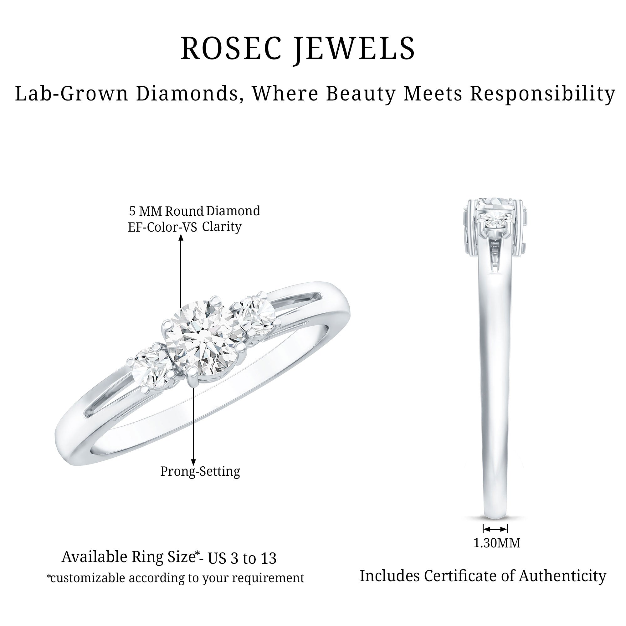 Seal your promise with a truly unique Three Stone Ring that symbolizes your past, present, and future. Rosec Jewels offers a breathtaking Diamond Promise Ring, meticulously handcrafted. It showcases a 5 MM round lab-created diamond at the center, accompanied by two side stones in prong setting for an elegant appearance. This thoughtful detail transforms this Simple Diamond Ring into more than just jewelry, it becomes a cherished keepsake. With its graceful silhouette and comfortable fit, this Lab Grown Diamond Ring is ideal for the contemporary bride who values timeless beauty with a touch of meaning. Whether you are celebrating a significant milestone or seeking a way to convey your commitment, this Past Present and Future Ring will serve as a perfect memento for her, one she will treasure for a lifetime. This lab-created Diamond 3 Stone Ring beautifully encapsulates the journey of your relationship within a single design. By merging modern aesthetics with classic sophistication, this Round Diamond Ring for Women features EF color VS clarity stones that radiate fire and brilliance.