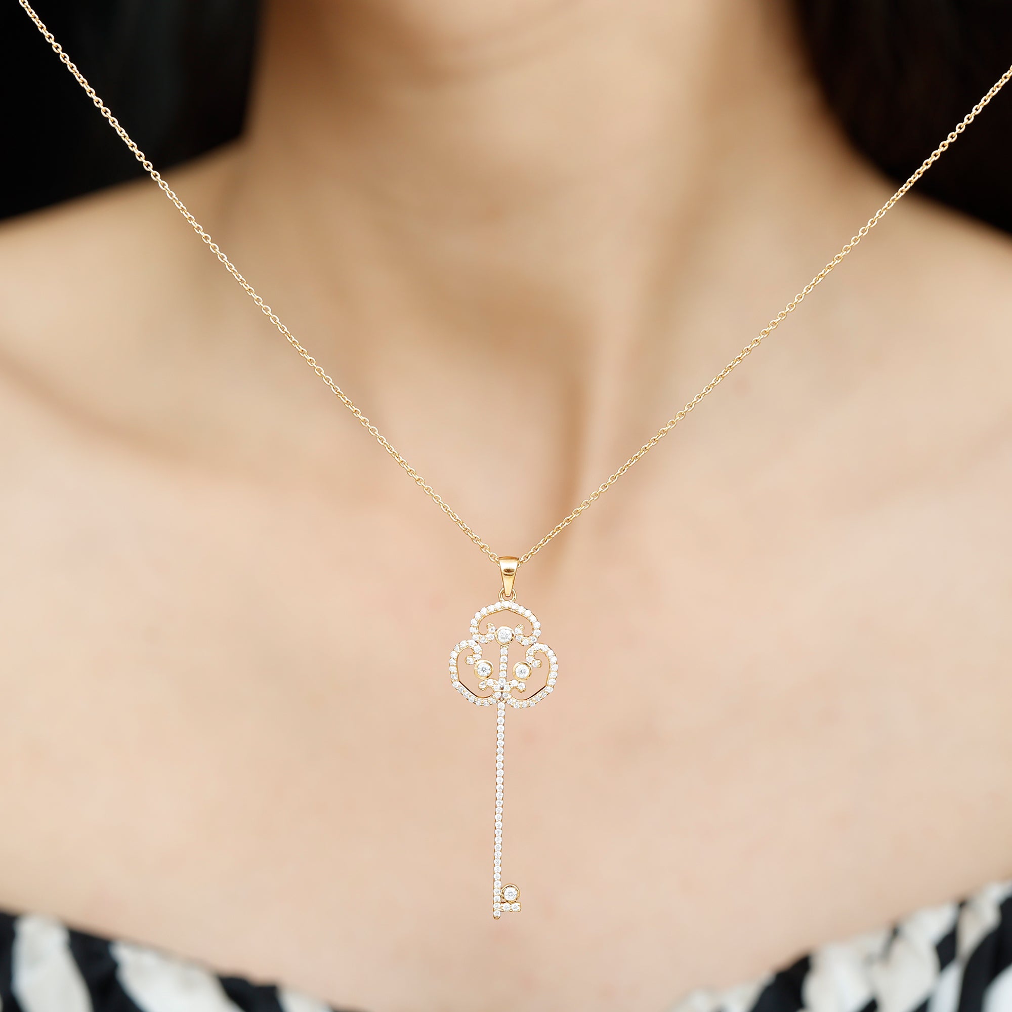This captivating Key Necklace is a beautiful mix of sparkle, meaning, and timeless style. The pendant is shaped like a classic key and is adorned with Round Shape Lab Grown Diamond stones that shine with every movement. This Key Charm Necklace is the kind of piece that feels special the moment you put it on. The top of the key features a Vintage Inspired design that adds a soft, elegant touch. This Lab Grown Diamond Necklace is simple yet unique, perfect for adding a little charm to your everyday outfits or for making a subtle statement at special events. Made with Lab Grown Diamond stones of EF-VS Quality, this Lab Made Diamond Necklace offers the same brilliance as natural gemstones, but more sustainably and thoughtfully. Whether you are buying it as a gift or treating yourself, this Vintage Style Necklace is a lovely reminder of new beginnings and open doors. The necklace comes in a beautiful jewelry box, ready to give or enjoy. Delicate, meaningful, and easy to wear, this Diamond Key Pendant (Lab Created) is a little piece of elegance you will love having in your collection.