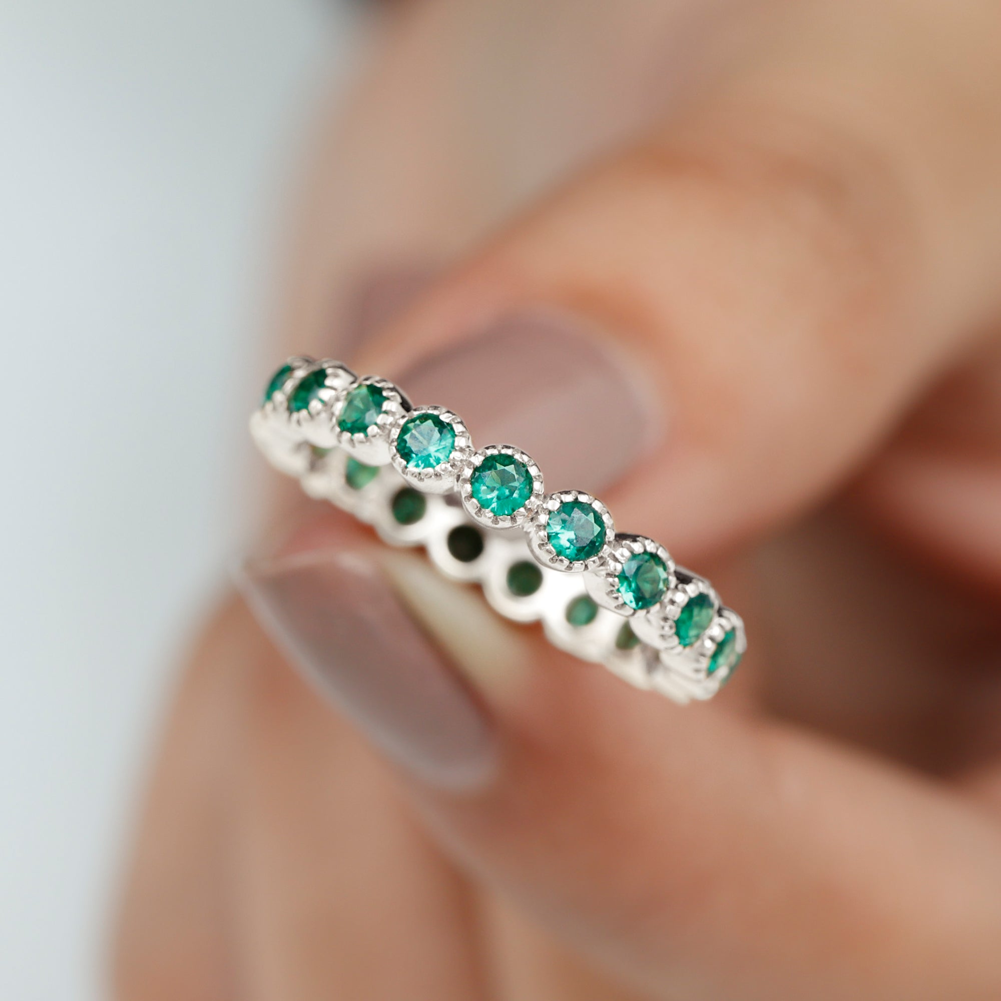 Certified Lab Created Emerald Full Eternity Band Ring in Bezel Setting