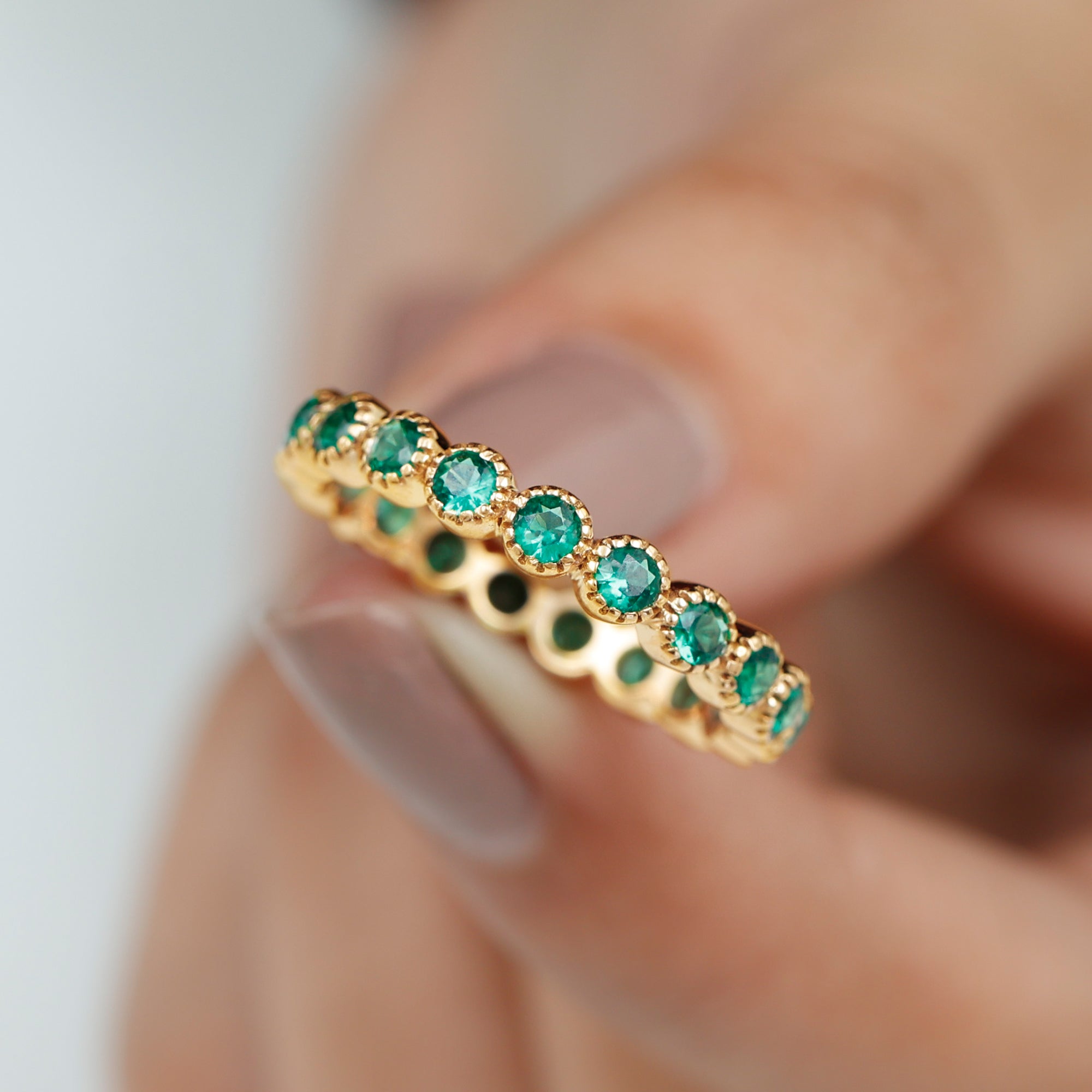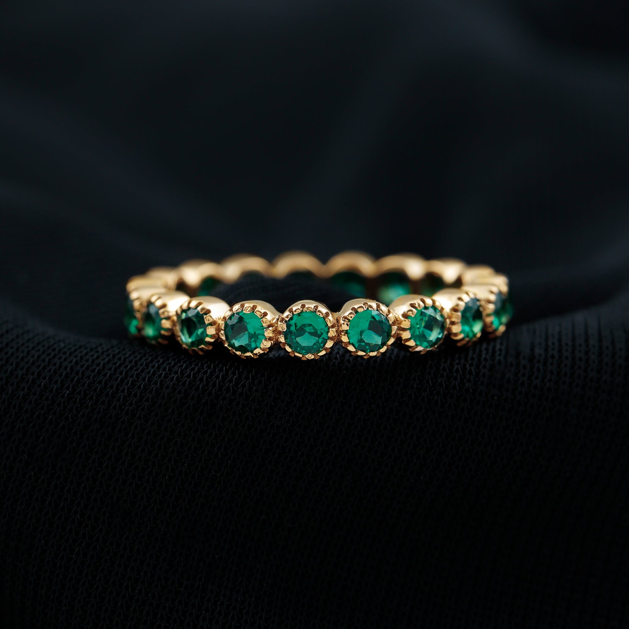 This gorgeous Full Eternity Ring is the perfect mix of elegance and simplicity. It is made for the woman who wants a little sparkle in her daily accessories. This Eternity Band features a continuous line of dazzling Round Cut Lab Created Emerald of AAAA quality, all meticulously set in a secure Milgrain Bezel Setting, symbolizing unity and everlasting love. You can rock this Wedding Band on its own for a chic, sophisticated look or stack it with another ring for a more personalized flair. This Moissanite Band comes with a certificate of authenticity and a signature velvet pouch, keeping your ring safe when you are not wearing it. Available in US ring sizes 3 to 13, this Eternity Wedding Ring is designed to fit perfectly because every great love story deserves the ideal fit. Whether you are proposing, celebrating an anniversary, or just showing your love, this Stacking Ring beautifully combines emotion and elegance in the most radiant way.
