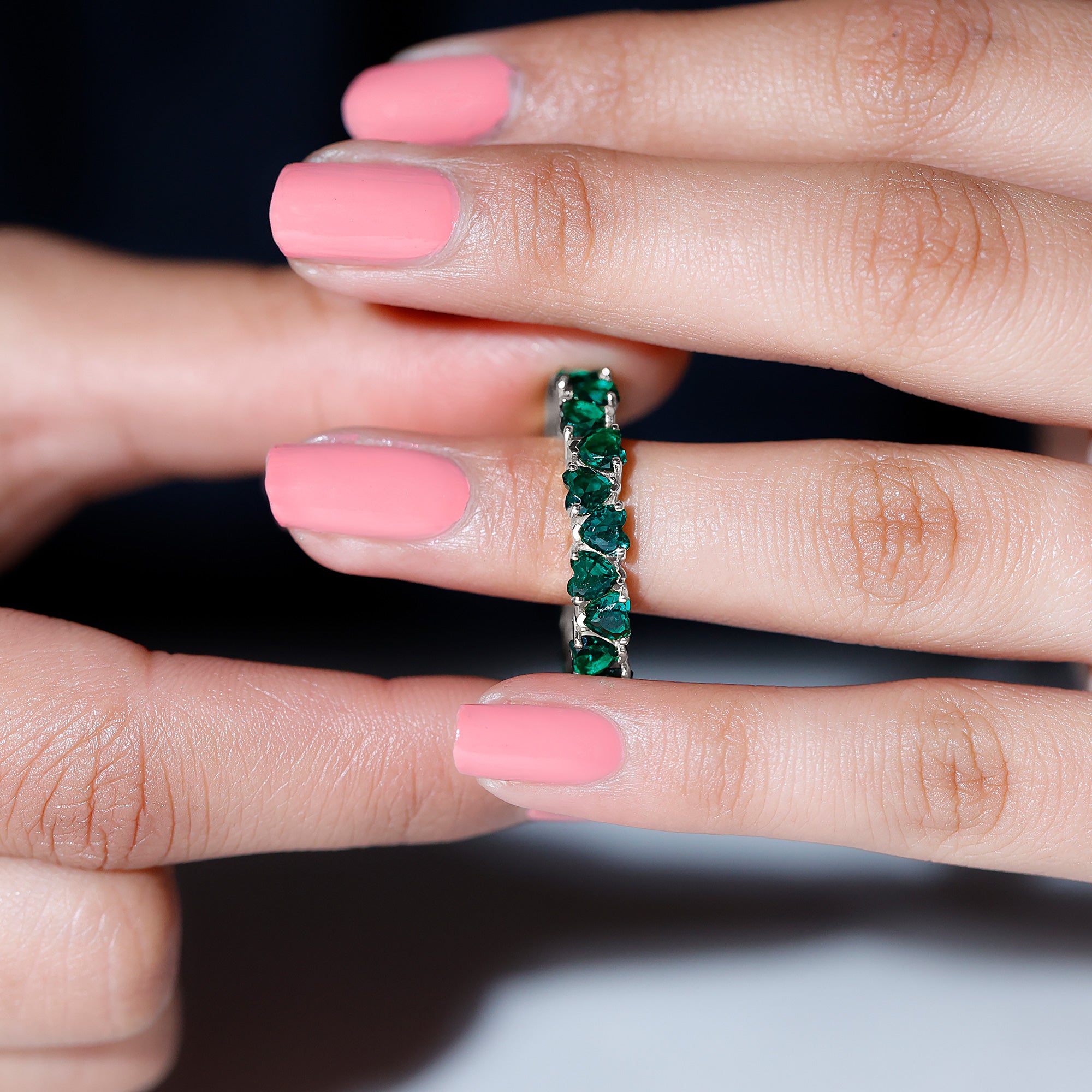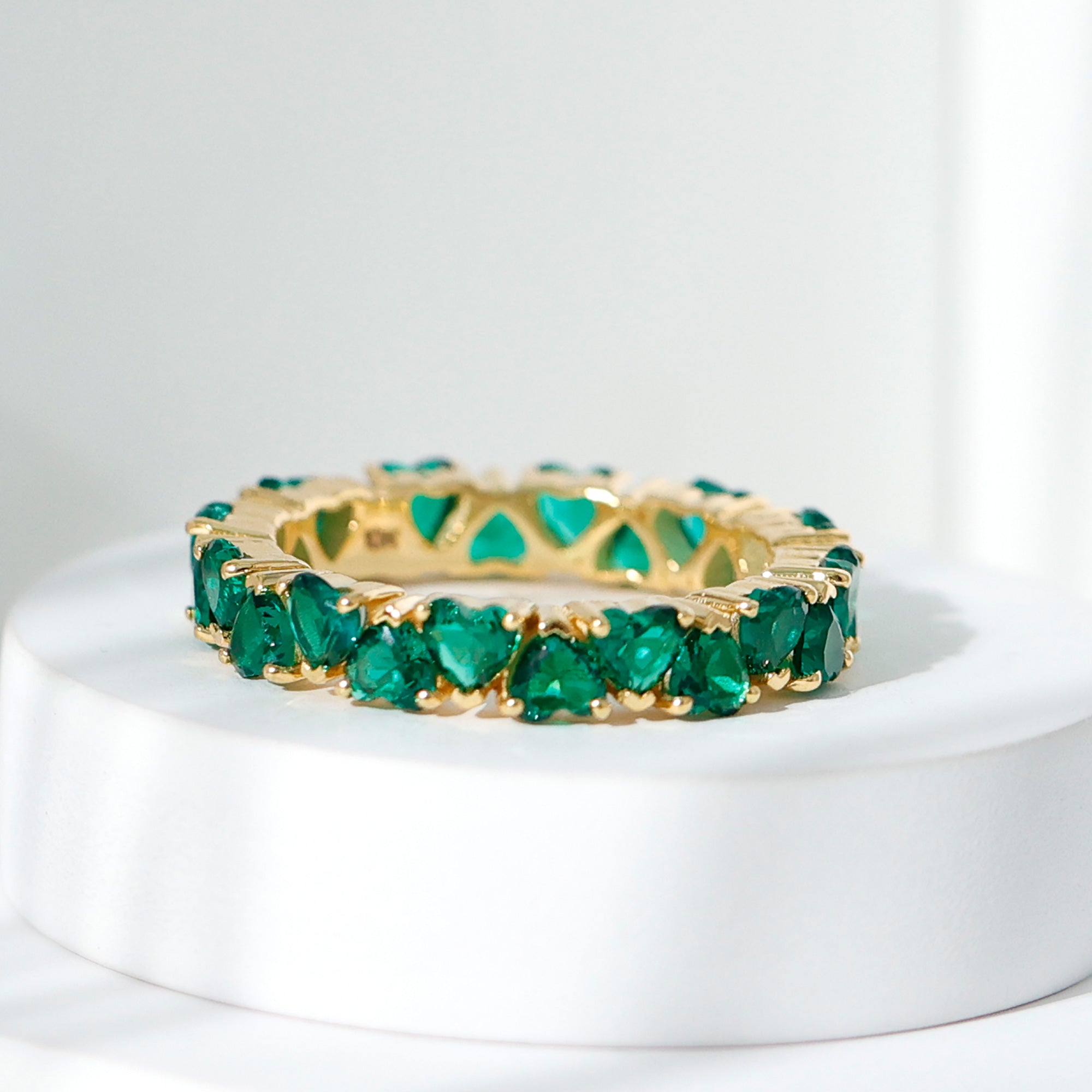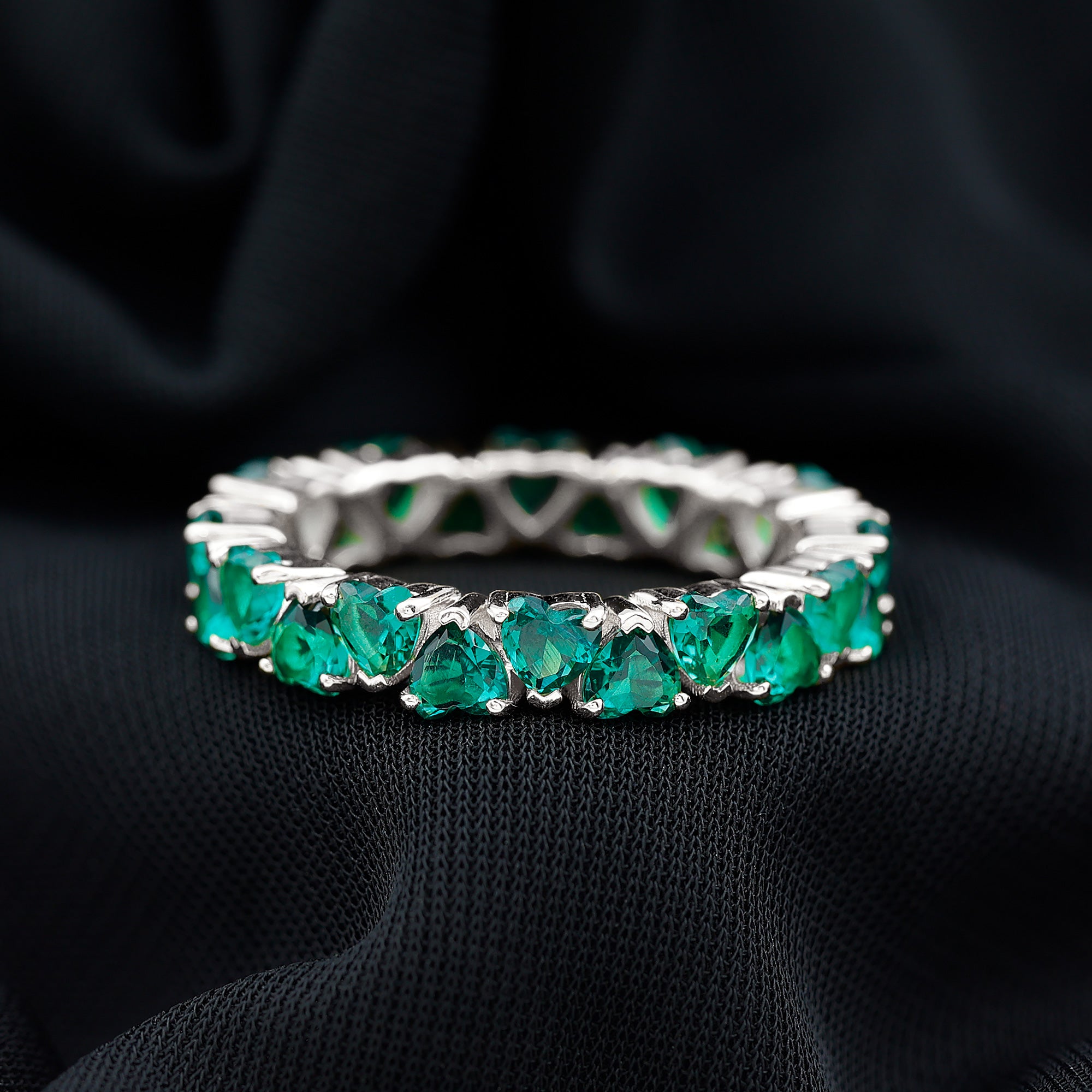 Emerald hearts come together in a seamless circle, creating a band that glows with meaning and timeless charm. This Heart Eternity Ring features vibrant lab created emeralds, each expertly shaped into a delicate heart and set securely in claw setting. The stones are arranged in an alternating pattern, giving the Emerald Wedding Band a graceful rhythm that catches the light from every angle. Designed as a full eternity ring, it forms an unbroken loop of color and brilliance. The rich green of emerald is often connected with renewal, growth, and deep love, making this piece especially meaningful for anniversaries, weddings, promise rings, or personal milestones. Handcrafted with care, the Emerald Anniversary Band is made to feel smooth and comfortable on the finger, allowing everyday wear without compromising elegance. The durable lab created emeralds bring beauty, strength, and ethical craftsmanship together in one design. Whether worn alone for a standout moment or stacked with other rings for a layered style, this Emerald Eternity Band is a heartfelt symbol meant to be cherished.