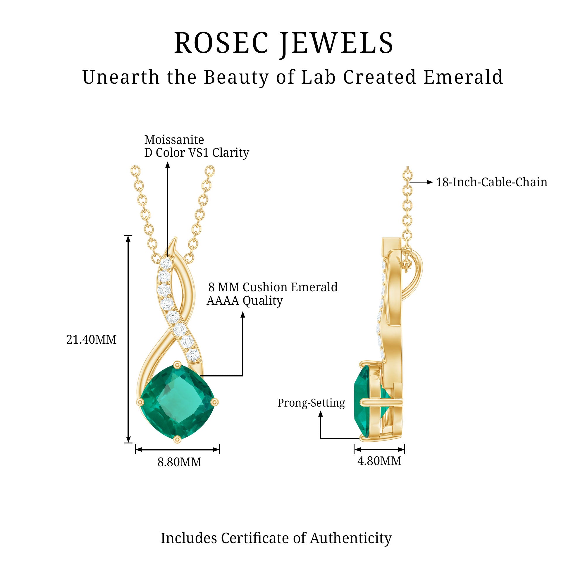 Create a memorable moment with a lovely Infinity Pendant Necklace designed to touch the heart of any woman. Crafted with high-quality metal, the Solitaire Pendant highlights an 8 MM cushion cut lab created emerald held securely in prong setting. Graceful infinity symbolizing endless connection and lasting devotion. Round brilliant cut moissanites sparkle along the infinity shape, adding bright flashes of light that enhance the pendant’s beauty. Every detail is made to offer both elegance and simplicity, creating a piece that feels special yet easy to wear. Hanging from a smooth chain with a hidden bail, the Emerald and Moissanite Necklace rests gently at the neckline. The hidden bail design keeps the look seamless, allowing full attention to stay on the emerald and the sparkling infinity symbol. Its comfortable fit and timeless style make it ideal for daily wear or meaningful occasions. Given as a gift to someone special or chosen as a personal keepsake, the Cushion Cut Emerald Necklace brings joy, beauty, and a touch of romance.