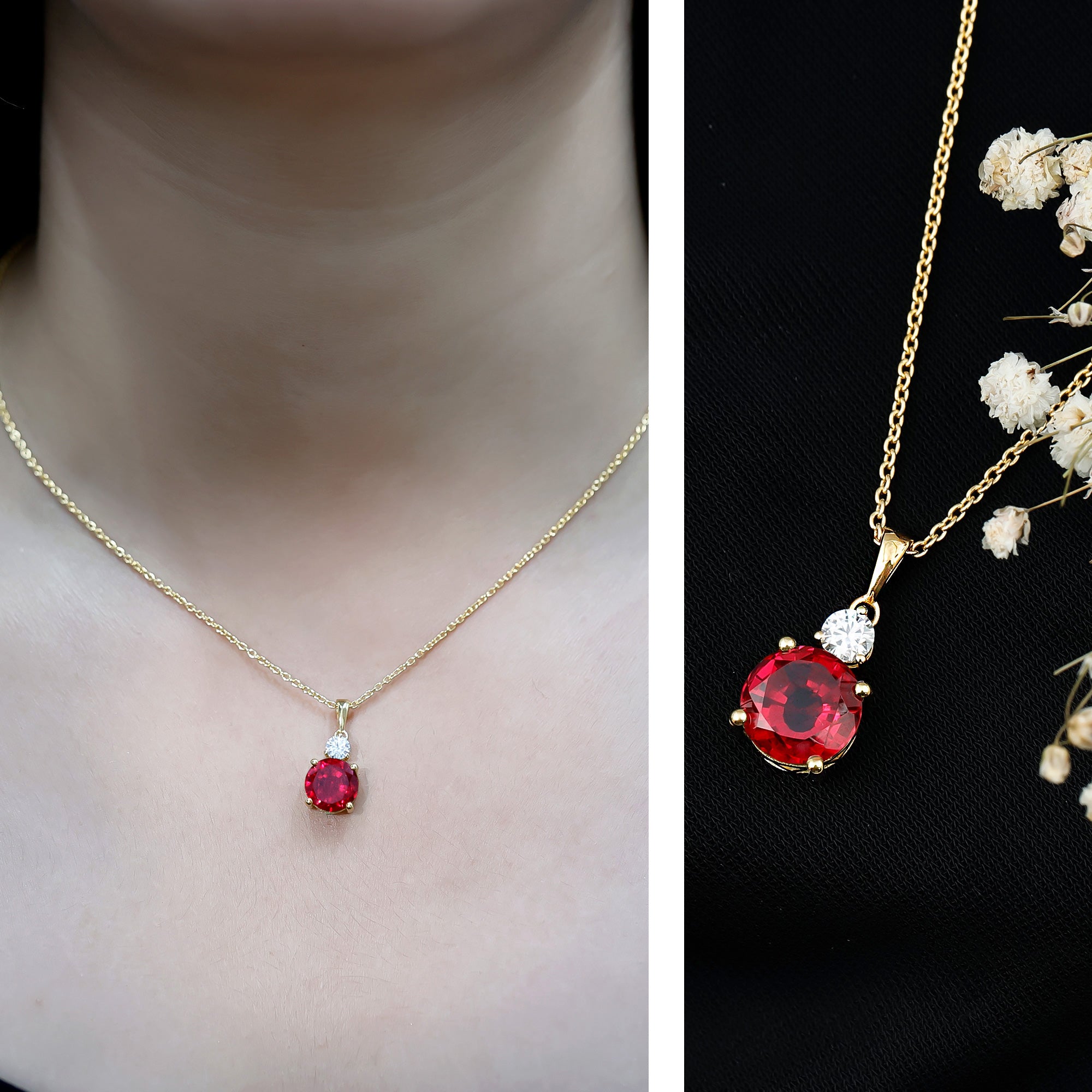 If you are someone who loves meaningful sparkle with a touch of elegance, this beautiful Solitaire Ruby Necklace is designed just for you. Crafted in 14K yellow gold plated silver, it carries the charm of traditional jewelry with a modern, thoughtful twist. At the heart of the piece is a 9 MM round cut lab created ruby, held securely in prong setting. Just above the ruby sits a 4 MM round moissanite, which adds a soft yet striking shimmer to the overall design. The pairing of the rich ruby and sparkling moissanite gives this Red Stone Necklace a balanced, eye-catching appeal, perfect for both everyday elegance and special occasions. The Ruby and Moissanite Necklace is suspended from a sturdy, lightweight chain, making it comfortable to wear all day. A bail connects the pendant to the chain, keeping the design clean and simple, while allowing the pendant to move freely and sit on the neckline. This Round Pendant is not only beautiful, but also environmentally friendly, made with lab grown gemstone that offer ethical luxury without compromising on style or sparkle. Whether you are dressing up for a romantic evening, heading to a big event, or simply want to brighten your daily wardrobe, this Ruby Pendant adds just the right touch of color and brilliance.