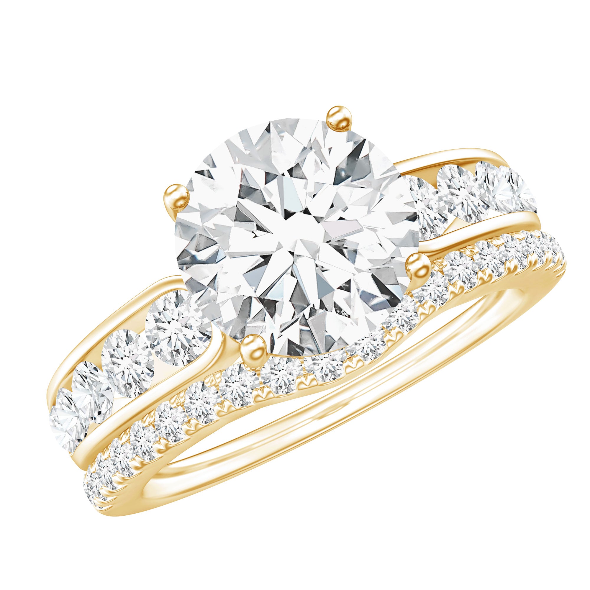The unique and stunning Lab Grown Diamond Ring Set is designed to grab attention and make your day even more memorable. Celebrate your emotions with a symbol of joy, complemented by the elegant design of the Bridal Ring Set. This beautiful 2 Piece Ring Set includes an Engagement Ring and a Wedding band, ready to dazzle and create a breathtaking stack. The Engagement Ring features an 8 MM round cut lab grown diamond in 4 prong basket setting, enhanced by additional round gemstones as side stones in a graduated style, elevating the center stones beauty. The slightly curved Wedding Band studded with a row of lab diamonds, perfectly hugs the main ring and representing everlasting love. The EF Color VS Clarity Lab Grown Diamond offers a clean, bright look with exceptional visual appeal. This Wedding Engagement Ring set stands as a testament to unity in relationships, embodying sophistication and capturing every gaze. Its beauty combines simplicity and grace, symbolizing the crafting of a remarkable shared future.