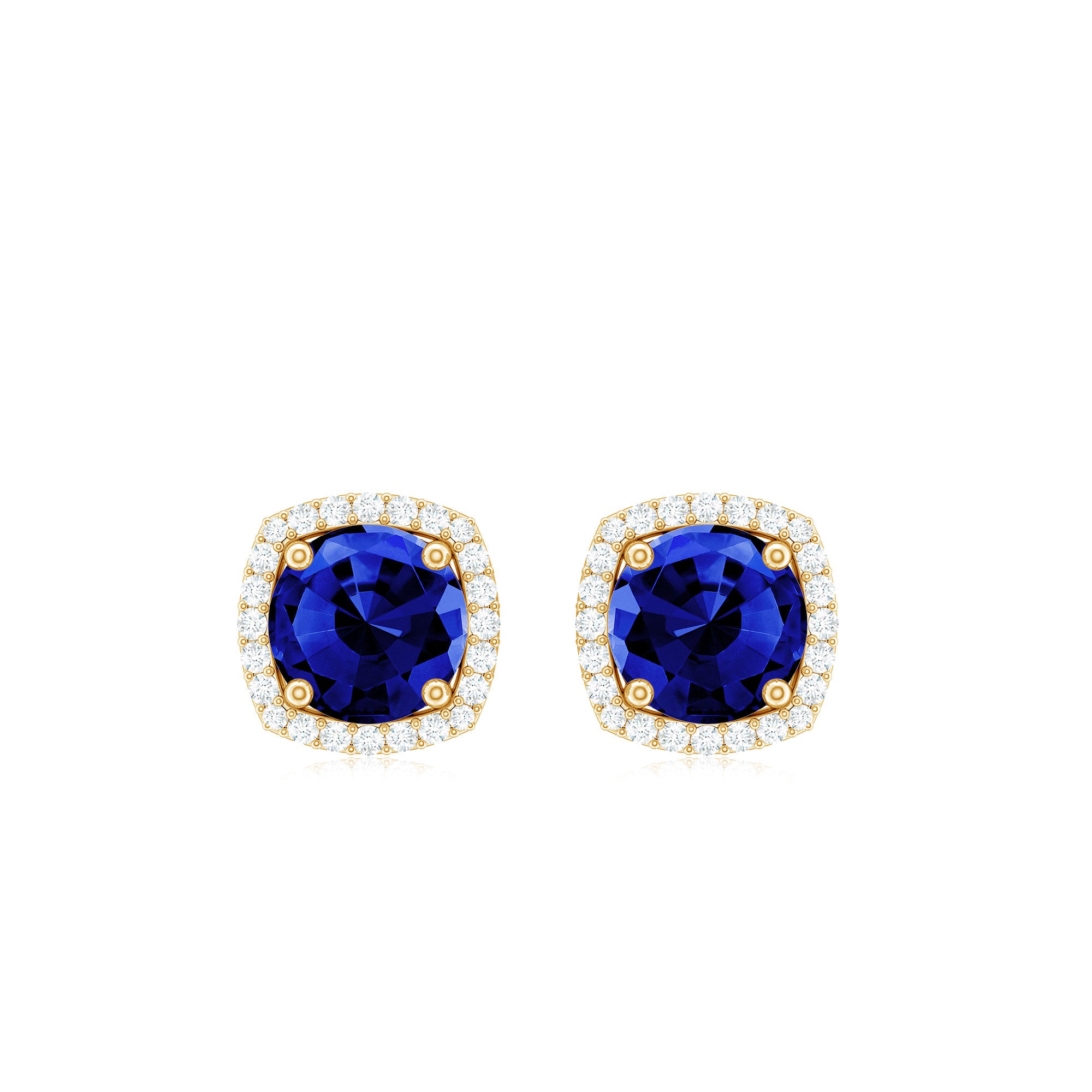 Enhance your outfit with a touch of charm and sparkle by wearing these beautifully crafted Lab Created Blue Sapphire Earrings, ideal for both everyday use and special events. They showcase a 6 MM round lab created blue sapphire as the centerpiece, securely set in 4-prong setting, and surrounded by a halo of diamonds that amplify its brilliance. These Blue Sapphire and Diamond Earrings are lightweight and comfortable, making them perfect for all-day wear. The screw back closure guarantees they remain securely in place without sacrificing style. The combination of AAAA quality lab created blue sapphire and sparkling HI-SI quality diamonds adds just the right touch of glamour. These Halo Stud Earrings come with a certificate of authenticity and are thoughtfully packaged in a jewelry box, making them ready for gifting or for adding a special element to your personal collection. Whether you are dressing up for dinner, going to work, or simply looking to add a hint of elegance to your everyday style, these Sapphire Stud Earrings provide the perfect blend of sophistication and charm.