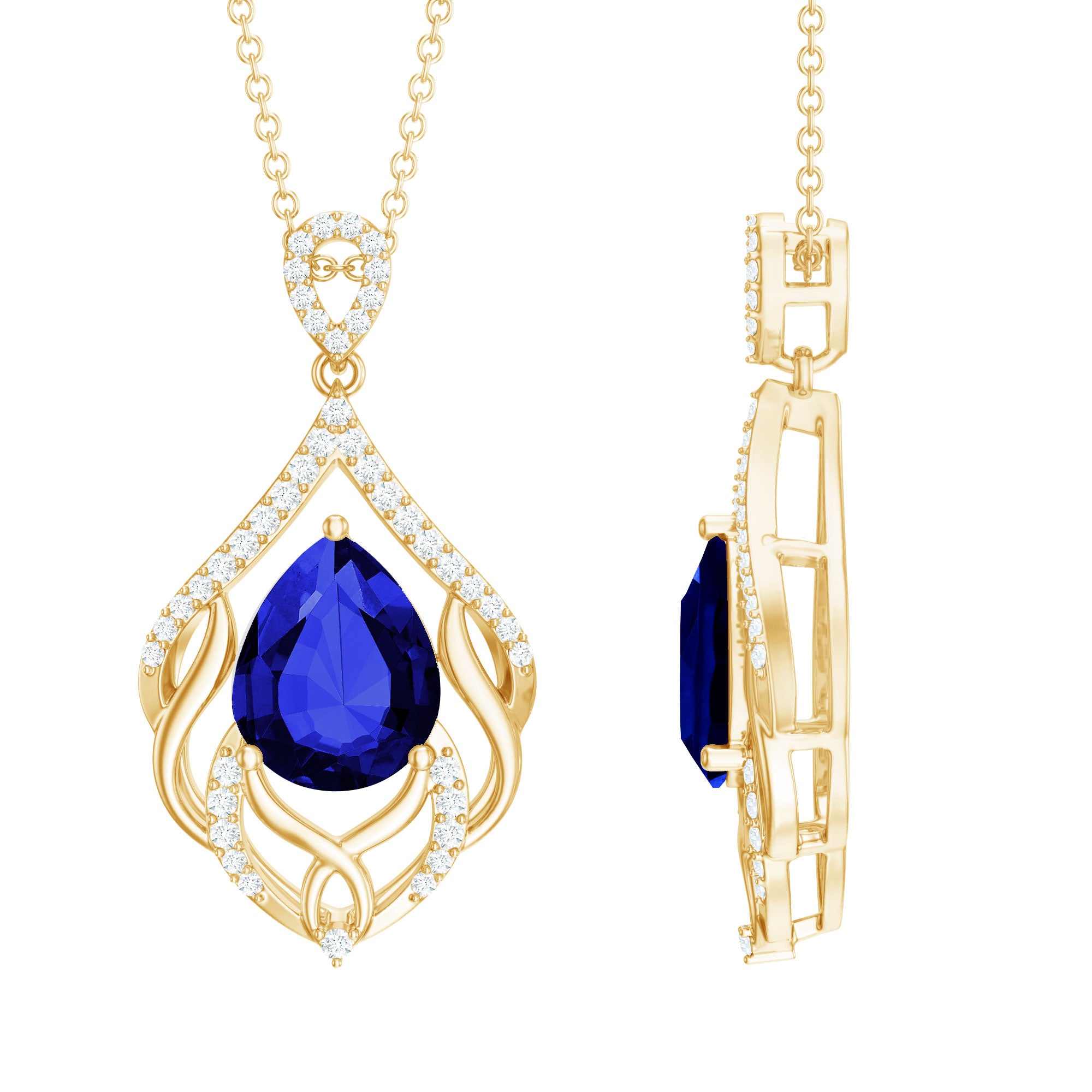 Indulge in the artistry of our Leaf Inspired Lab Created Blue Sapphire Pendant Necklace, where each detail whispers sophistication and grace. Our Designer Blue Sapphire Teardrop Pendant Necklace isnt just jewelry; its a statement, a symbol, and a dazzling chapter in your own love story. The design features a 8x10 mm Pear Shaped Synthetic Sapphire delicately cradled on a bed of leafy metal patterns, adorned by the shimmering embrace of round shape lab grown diamonds. Embrace the brilliance, adorn yourself with passion and shine of Aaaa quality Sapphire and Ef-Vs quality Diamonds, and let this Designer Necklace script your romance in gemstones! Rosec Jewels specializes in crafting stunning jewelry pieces using Certified Lab Cultured Gemstones.