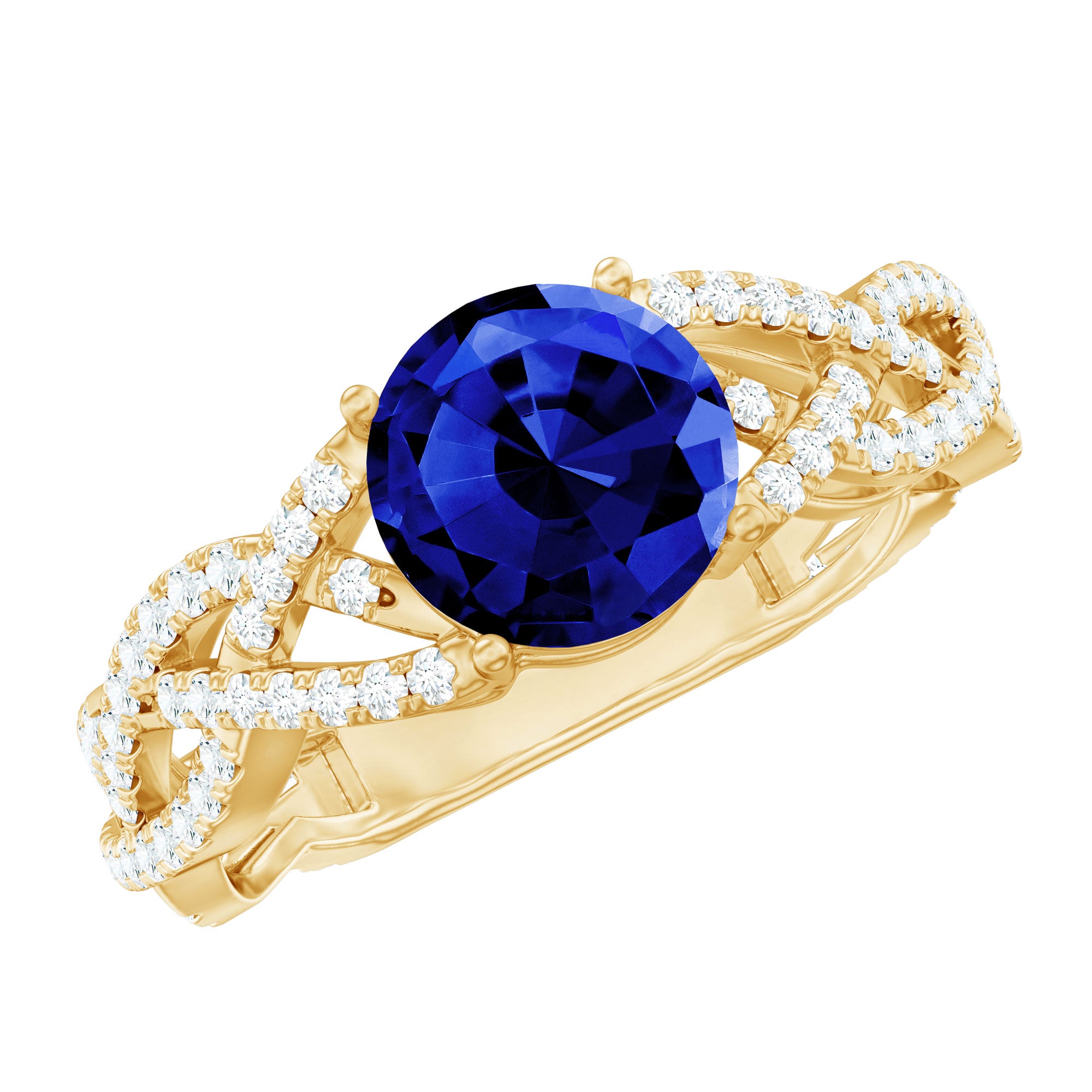 On your special day, elevate your love story with this mesmerizing Solitaire Engagement Ring. Crafted to perfection, the 8 mm Round Shape Lab Created Blue Sapphire set as a center stone. The intricate braided band adorned with delicate Diamond gemstones (Synthetic) symbolizes the intertwining of two lives. Meticulously designed, this Sapphire Diamond Ring embodies timeless beauty and commitment. The Aaaa Quality Sapphire and Ef-Vs Quality Diamonds make your Engagement Ring not only a symbol of love but also a statement of conscious choices.