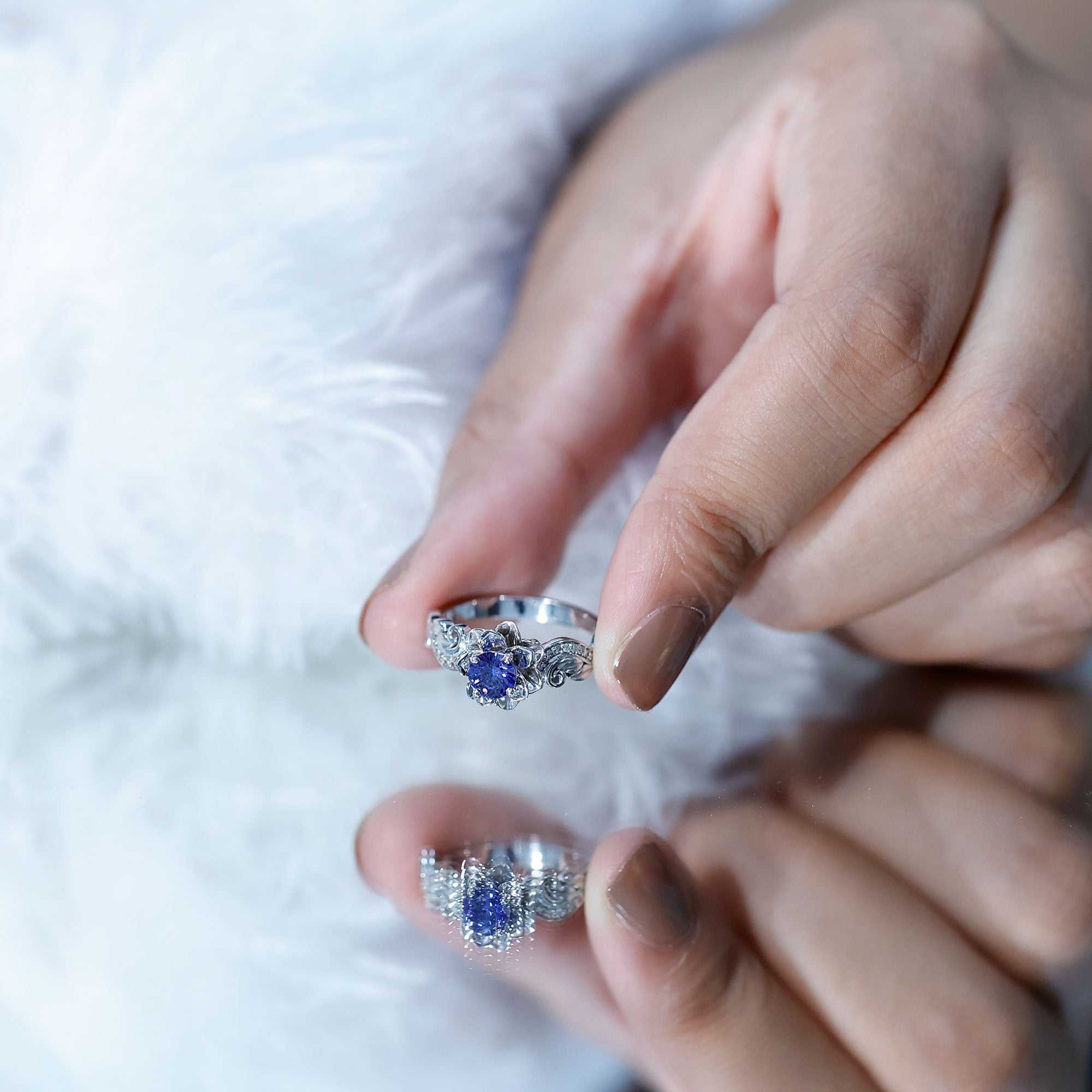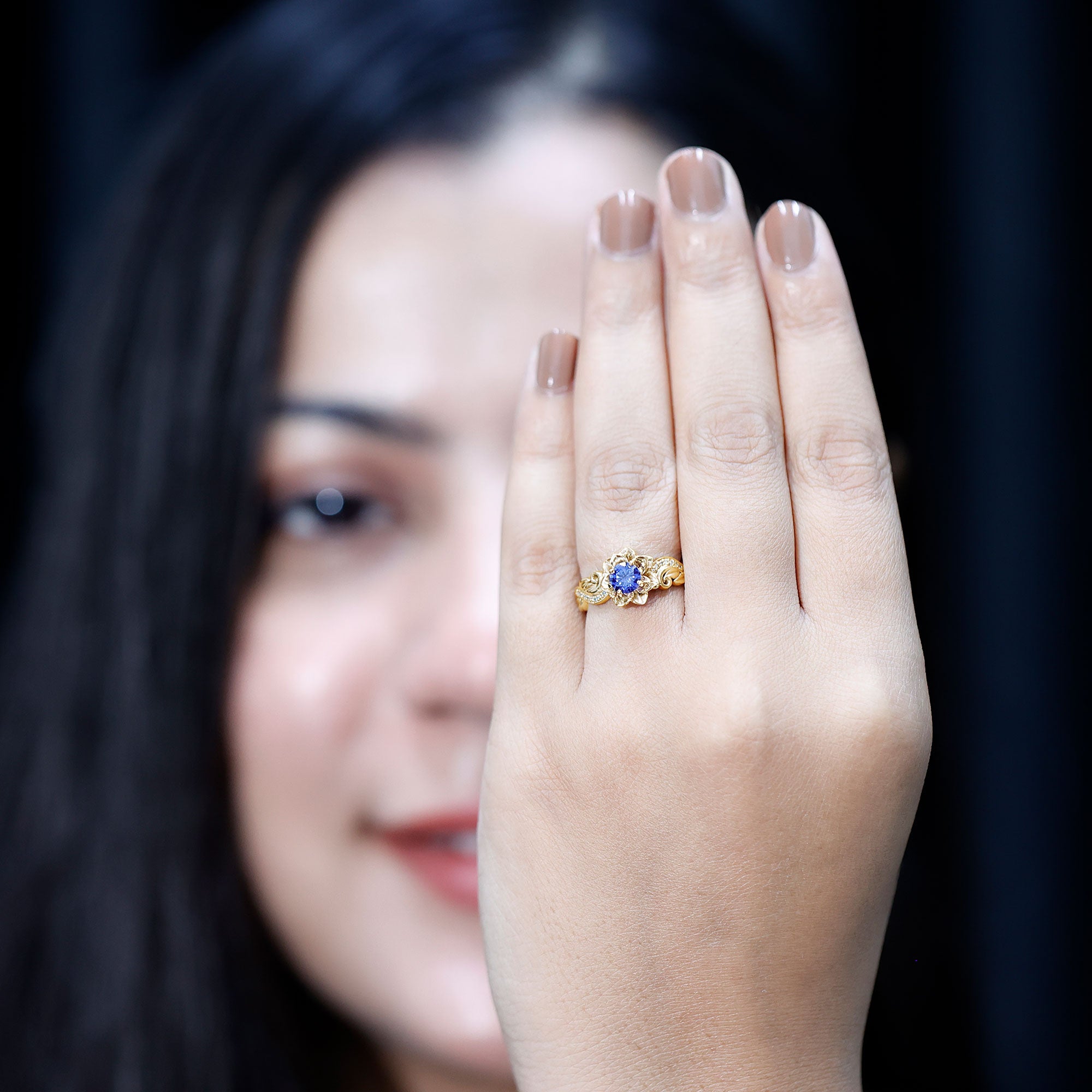 The bloom of true love shines beautifully in this enchanting Flower Engagement Ring, a design inspired by the most delicate and meaningful forms of nature. At the center of the floral motif sits a radiant 5 mm Round Shape Lab Created Blue Sapphire set in Prong Setting, glowing with a rich and captivating blue that symbolizes loyalty, wisdom and lasting devotion. Surrounding the center stone, the flower-inspired design creates a graceful and romantic look that captures the beauty of a blossom in full bloom. The band continues the nature inspired story with elegant leaf details, gently adorned with sparkling Diamond stones that add a soft shimmer from every angle. Each curve of this Lab Grown Blue Sapphire Engagement Ring is thoughtfully crafted to reflect growth, harmony and the journey of two hearts coming together. Its delicate yet eye-catching design makes it perfect for someone who loves jewelry with meaning, charm and a touch of natural beauty. Whether chosen for a heartfelt proposal or to celebrate a special chapter in your love story, this Lab Blue Sapphire Diamond Ring carries a timeless sense of romance. Presented in a signature jewelry box and available in a variety of ring sizes for the perfect fit, this beautiful Nature Inspired Engagement Ring is a sparkling symbol of a love that continues to grow and blossom forever.
