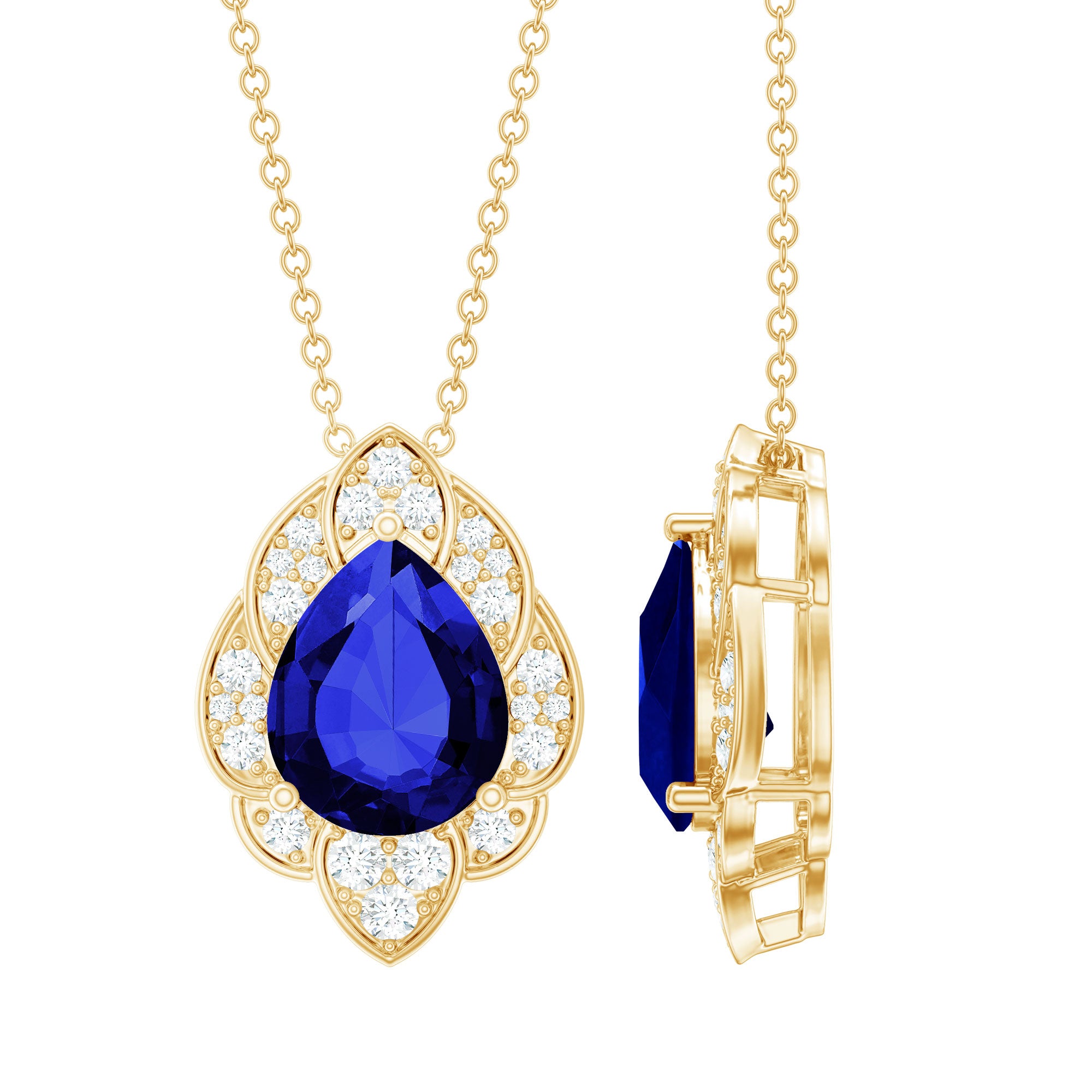 Our Nature Inspired Lab Created Blue Sapphire Pendant Necklace, is not merely jewelry; its an eloquent expression of your affection. The meticulous craftsmanship and thoughtful design make it a symbol of enduring love and admiration. The design features 8x10 mm pear shaped sapphire (lab created) placed in the center adorned with Round shaped Diamonds (lab grown) and beads. This pendant features the sparkle of Aaa Quality Sapphire and Ef-Vs Quality Diamonds. When the deep intertwined of sapphires with diamonds radiance then magic happens. Present her with this Sapphire Diamond Pendant, and witness how its elegance enhances her every moment.