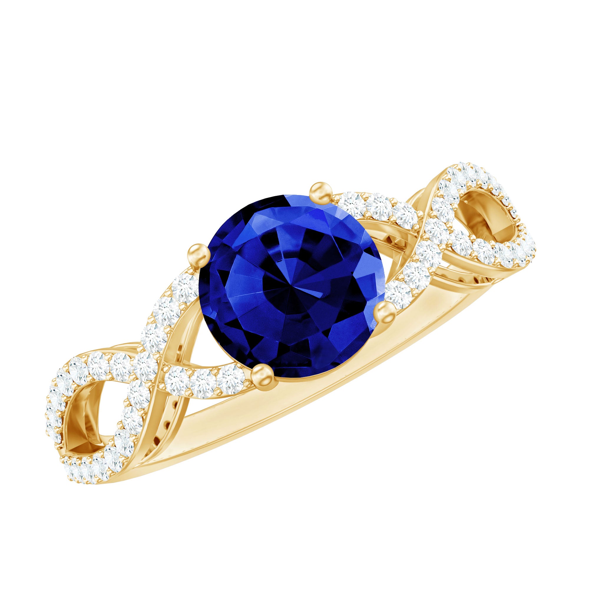 Express your feelings and devotion with this Blue Sapphire Ring the ultimate symbol of love. Showcasing a 7 MM Round Shape Created Blue Sapphire meticulously set in prong set accentuated by petite Moissanite lined on the crossover shank creating a captivating contrast she will adore forever. With its certified gemstones and exquisite craftsmanship, the sapphire ring is designed to make all your moments special. Elevate your big day to new heights and make every moment memorable with her by presenting this crossover engagement ring, made just for her.