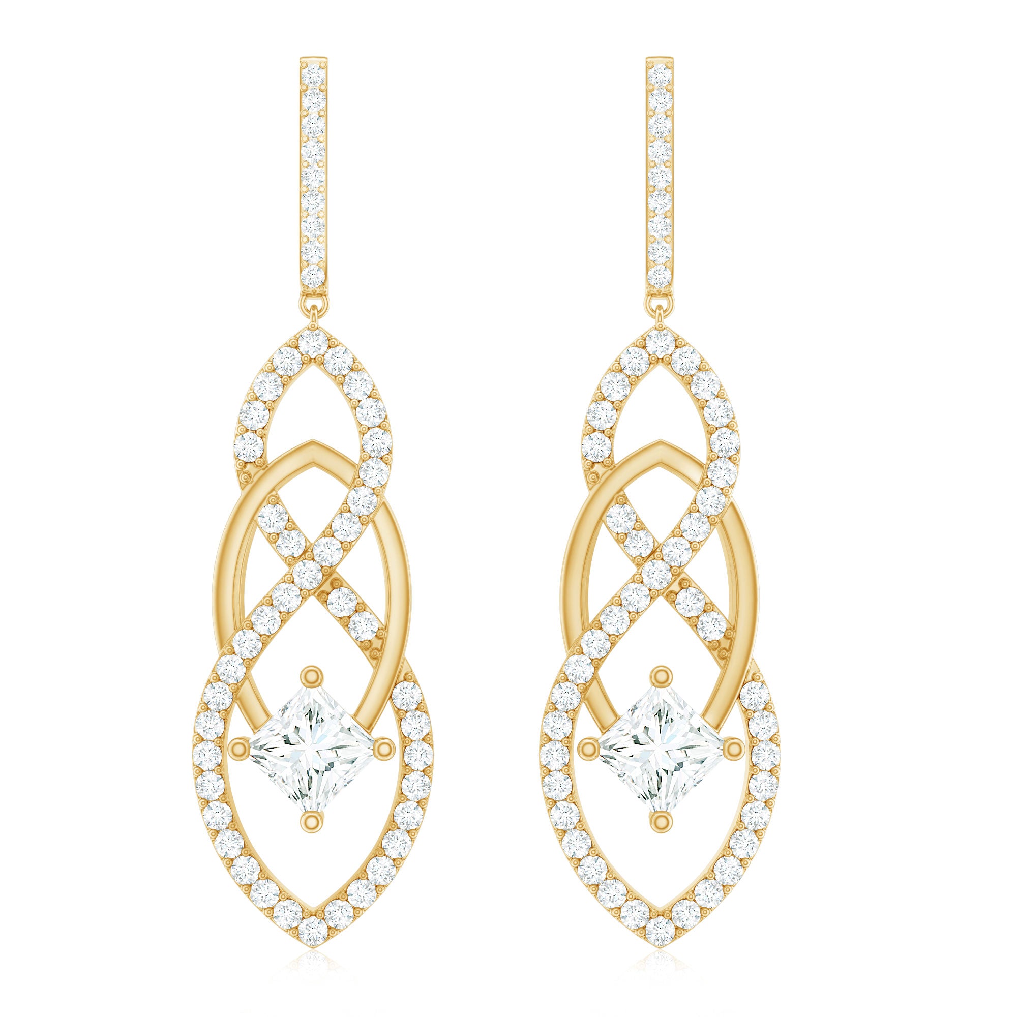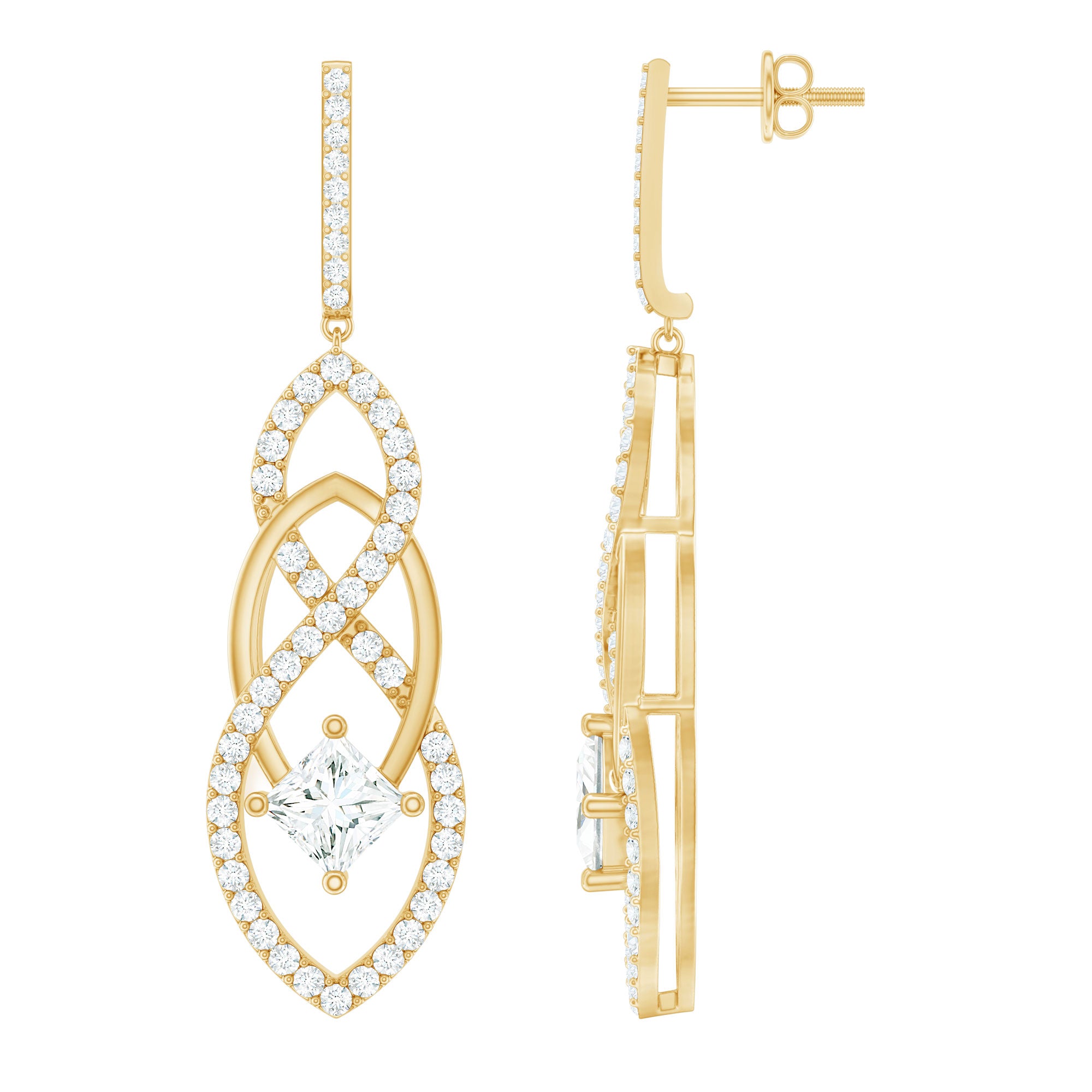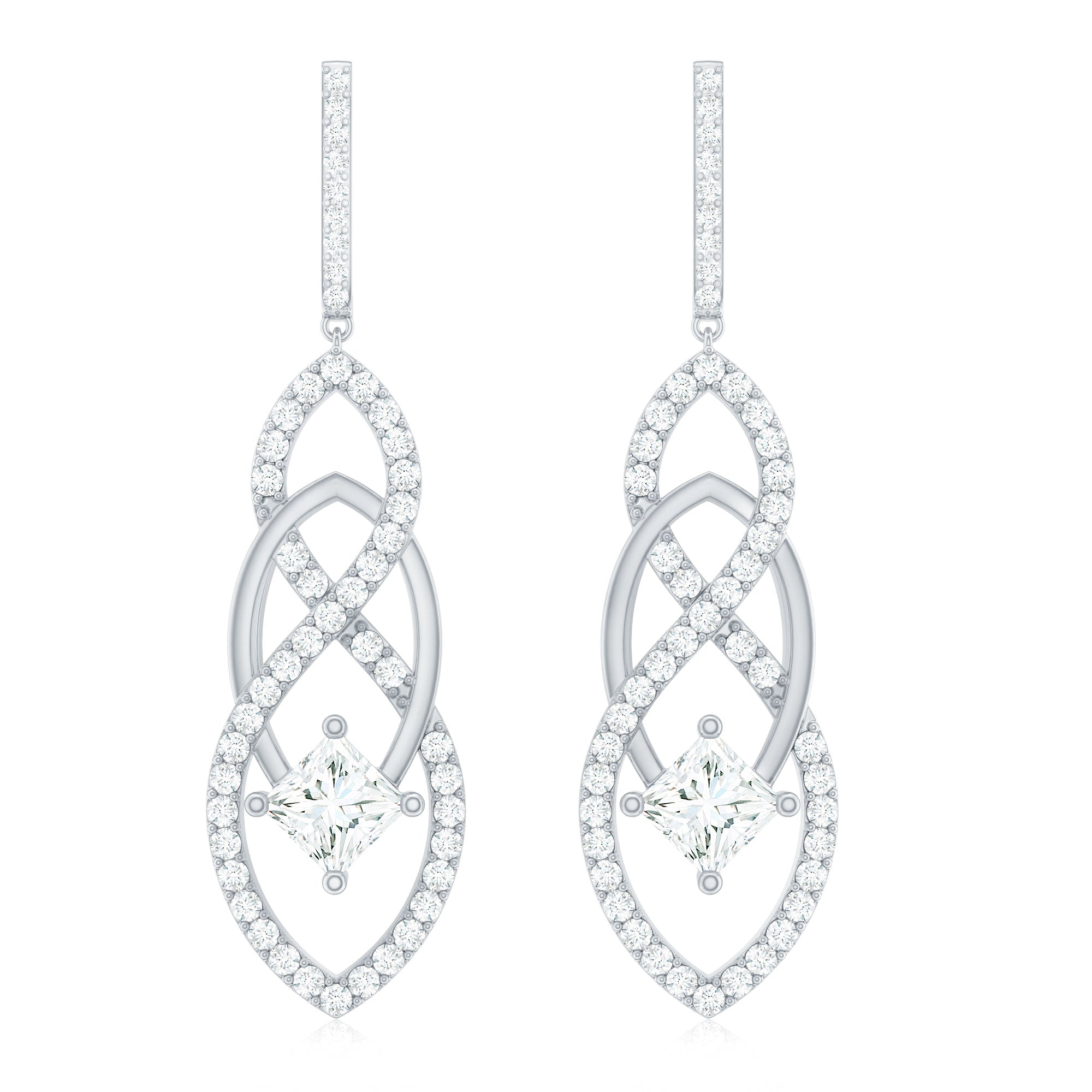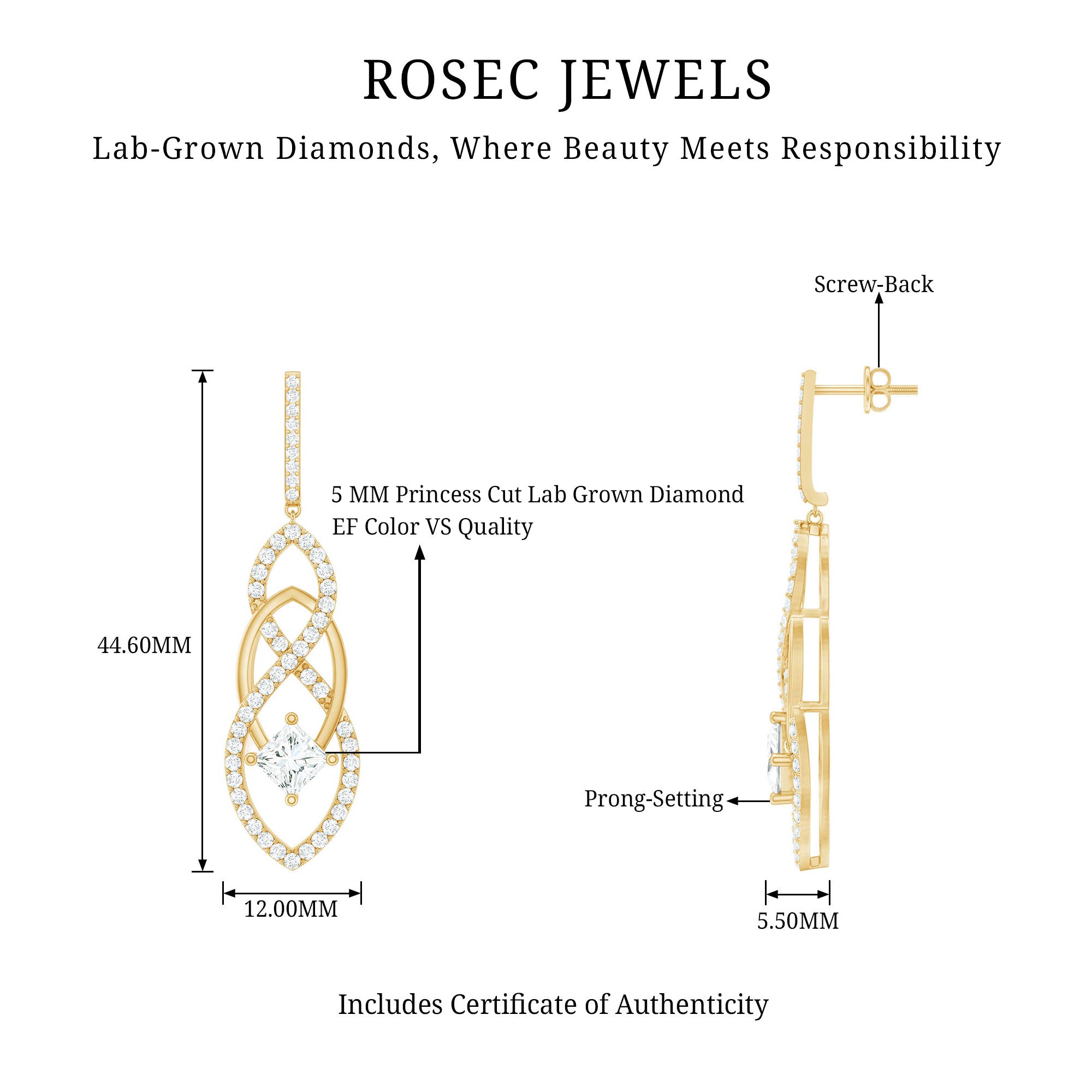 Walk down the aisle with a feeling like the queen, these Diamond Wedding Earrings are designed to add that perfect sparkle to your special day. Crafted with perfection, each earring showcases a diagonally set 5 mm Princess Cut Diamond of Ef-Vs quality as a centerpiece held in a secure prong setting, decorated by dainty sparkling round shaped lab grown diamonds studded over the Infinity Design, symbolizing neverending love and commitment. The Infinity Earrings come with a safe screw back closure and a certificate of authenticity to ensure the quality of the gemstones. Meticulously designed by Rosec Jewels, these Diamond Dangle Earrings (Synthetic) epitomize our dedication to ethically sourced, stunning jewelry.