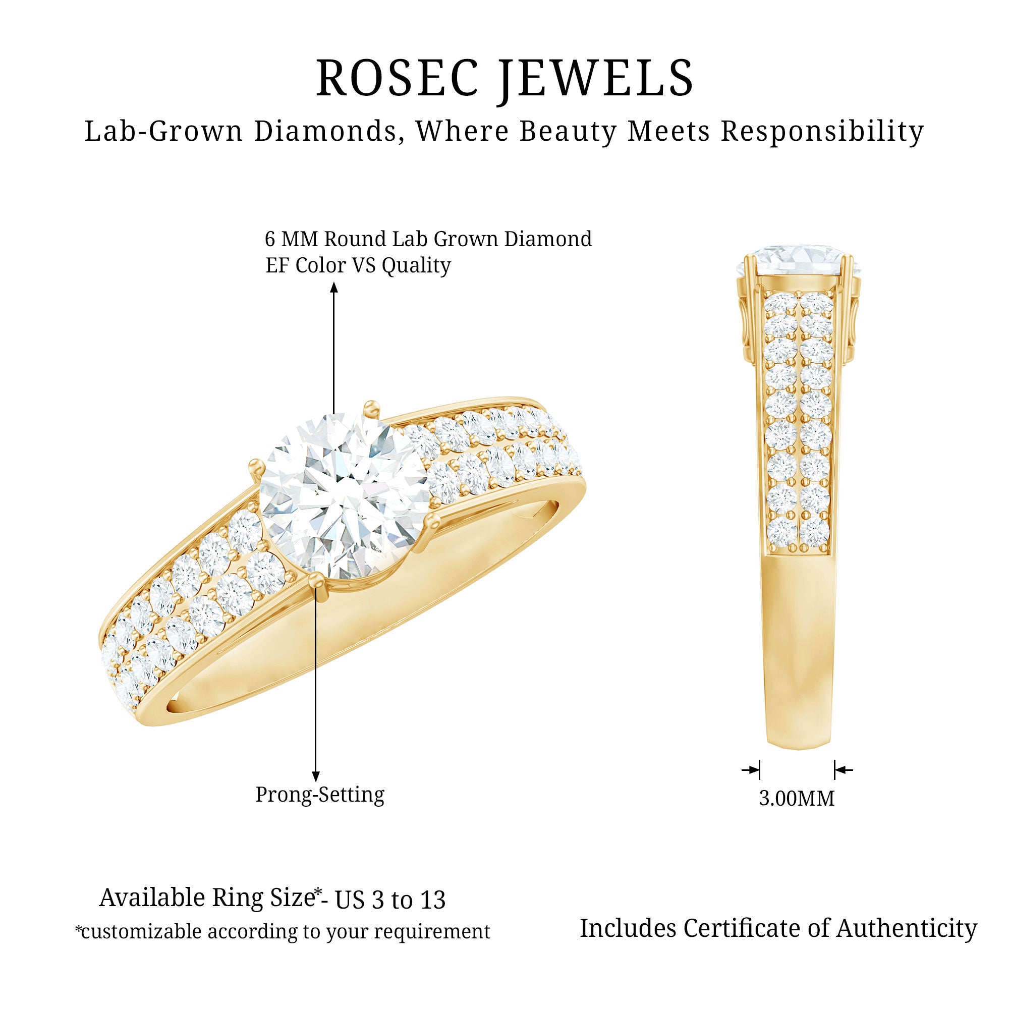 Timeless and classic this Lab Grown Diamond Ring has an eye-catching design that creates display of fire and brilliance. It is uniquely adorned with 6 MM Round Shaped Lab Grown Diamond in Prong Setting, with a cluster of Diamond gemstones in paved effect that adds shine to the ring and makes it a great choice for the bride-to-be who wants a glamorous and modern look. This Diamond Engagement Ring is a sentimental choice for her special day. Symbolizing eternal joy this breathtakingly beautiful Engagement Ring For Women is a go to choice that ensures it will be cherished for years to come.