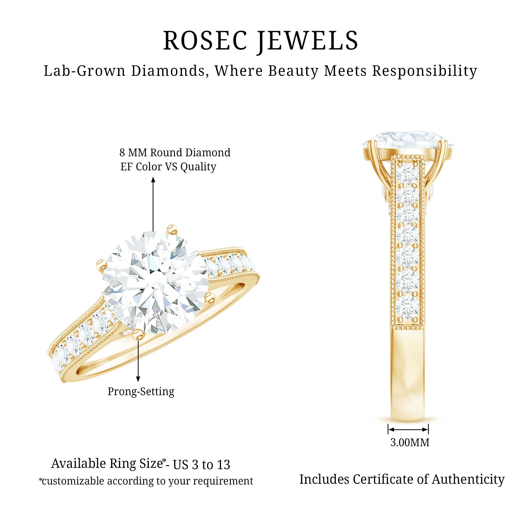 The Diamond Solitaire Ring is a cherished piece of jewelry that will enhance your style and make you truly appreciate it. The iconic Timeless Engagement Ring serves as a signature element with its elegant design, ensuring you to stand out. This High Profile Engagement Ring features an 8 MM round lab-grown diamond, securely held in prong setting as the Solitaire gemstone. The band captures attention beautifully, adorned with small stones and bordered with beaded detailing, making it a breathtaking choice for any bride-to-be. The luxurious aspects of this ring include the solitaire gemstone, complemented by petite peek-a-boo diamonds set under the main stone. This gemstone has been tested in lab and comes with authenticity certification. The round ring is available in US sizes ranging from 3 to 13 and arrives in a signature jewelry box that ensures safe and secure storage. With a variety of options in metal colors and types, this Lab Created Engagement Ring is ideal for celebrating special occasions, whether it's a birthday, anniversary, wedding, engagement, or any other memorable moment.