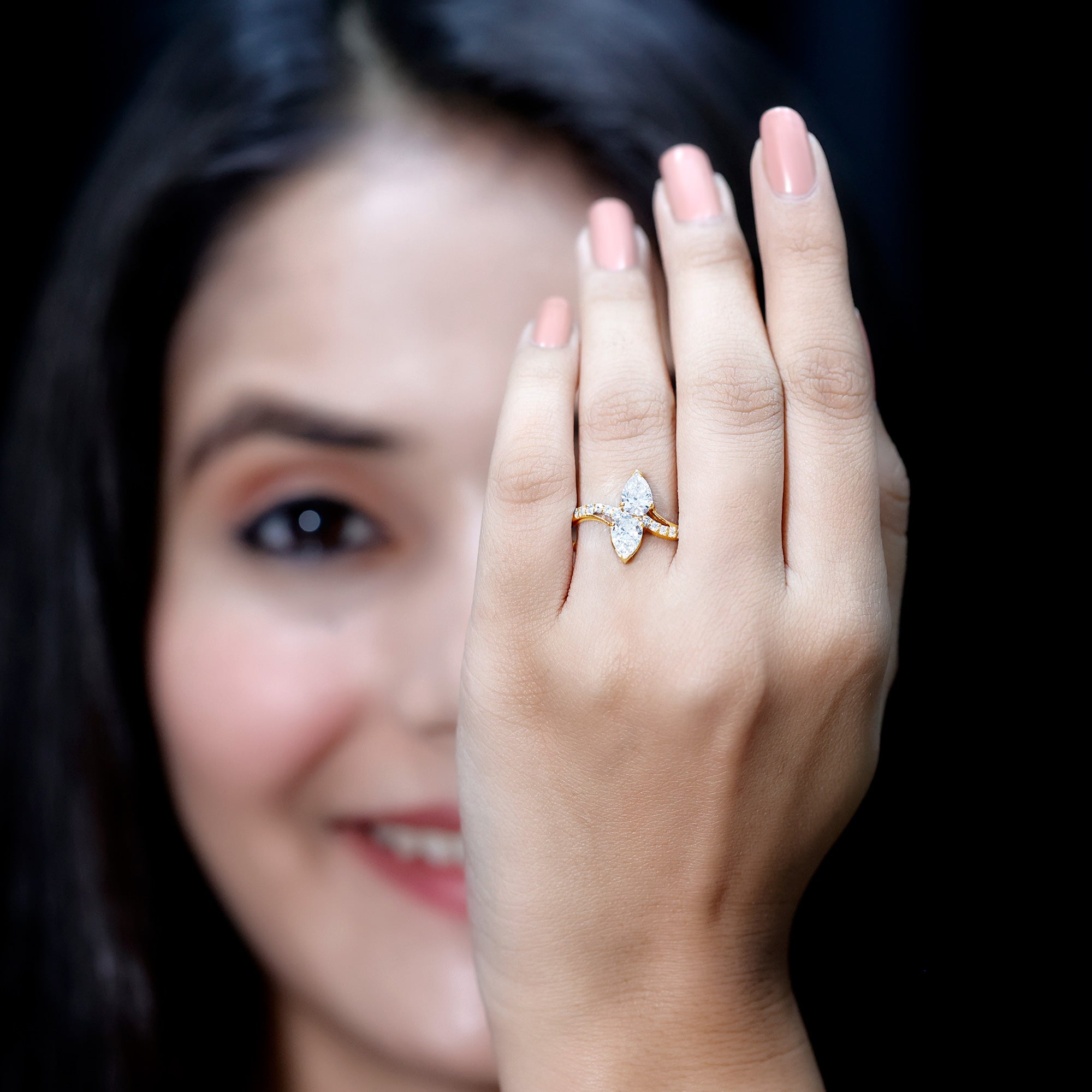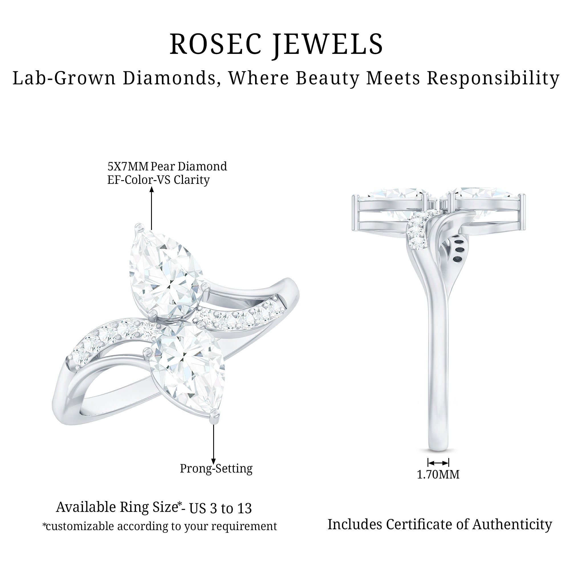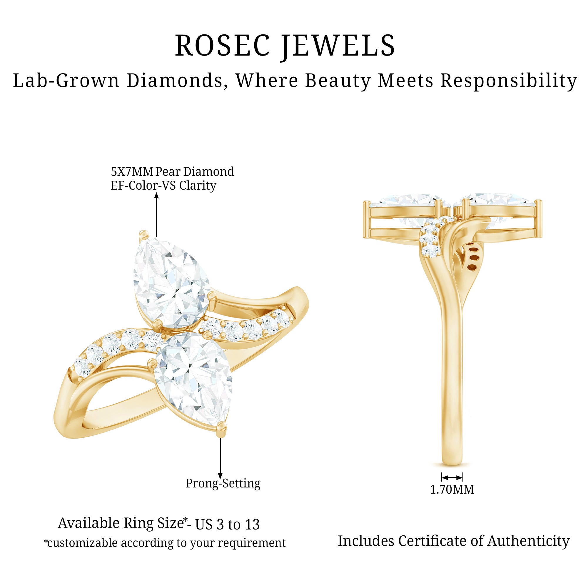 Rosec Jewels presents this stunning forever Two-gether Diamond Engagement Ring. It is embellished with 5X7 MM pear shaped two diamonds set in secure prong setting with a row of sparkling round stones over the curved band. This Two Stone Diamond Ring is handcrafted with ethically sourced, eco-friendly lab created gemstones, its a thoughtful and budget-friendly choice for an Alternative Engagement Ring or any meaningful occasion. Let this Toi Et Moi Ring be a shining reminder of the love you share and the memories yet to be made. Crafted for you, our each jewelry piece is designed with attention to detail, comfort, quality, and longevity.