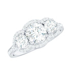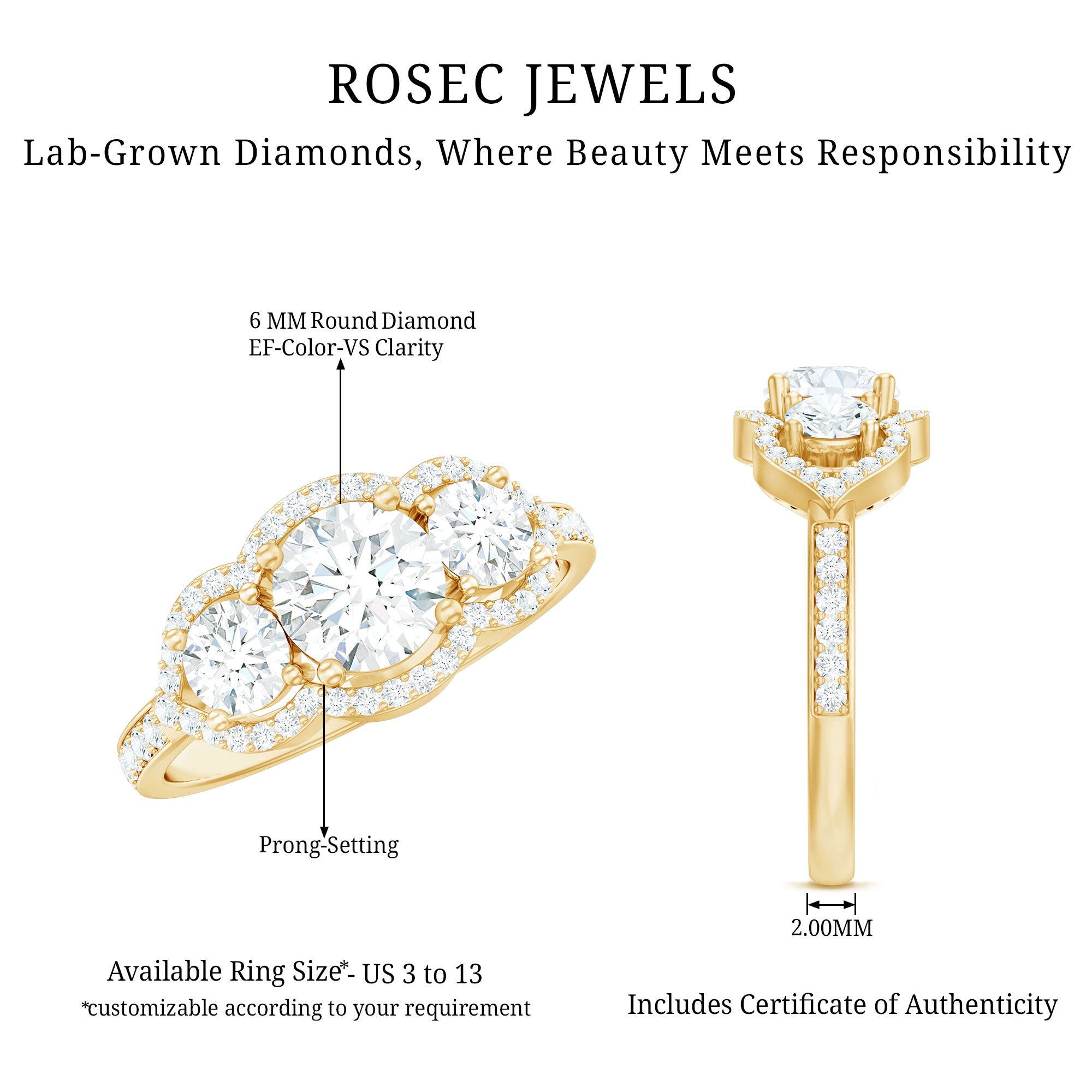 As a timeless option for wedding engagement, this Lab Grown Diamond Ring has a beautiful balanced look that has style and symbolism truly representing a relationship. The rings center stone has 6 MM Round Shaped Lab Grown Diamond flanked with Round Diamond on the sides. Extremely versatile this Past Present Future Ring has the Halo of Lab Diamond along with the side stones. This 3 Stone Engagement Ring reflects the unity and bond that shows reflecting the past, celebrating the present and reminiscing about the future. As an emblem of unending love, this exquisite and stylish EF-VS Quality Lab Diamond is classic and ensures a special moment whenever worn.