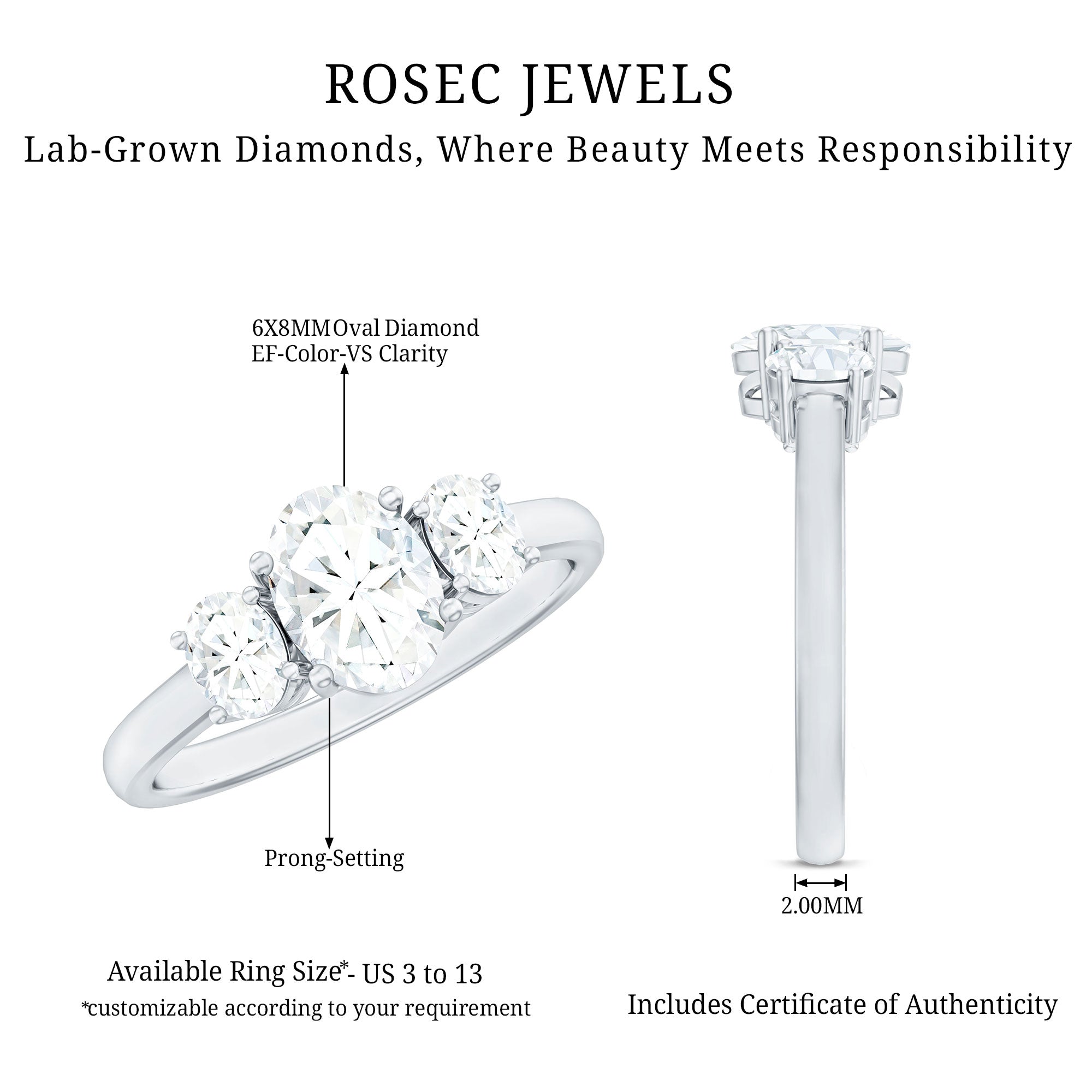 Celebrate every moment of your love story with this classic Diamond Engagement Ring. This Three Stone Engagement Ring is more than just a piece of jewelry, its a reflection of your unconditional love. Featuring three oval cut diamonds (EF-VS Quality), each set in a secure prong setting, this Lab Grown Diamond Ring captures the essence of your past, present, and future. Designed with timeless elegance, the Low Profile Ring is perfect for celebrating a bond that will last forever. Whether you are starting a new chapter together or looking for a way to express your commitment, this Simplistic Ring will forever remind you of the love you share.