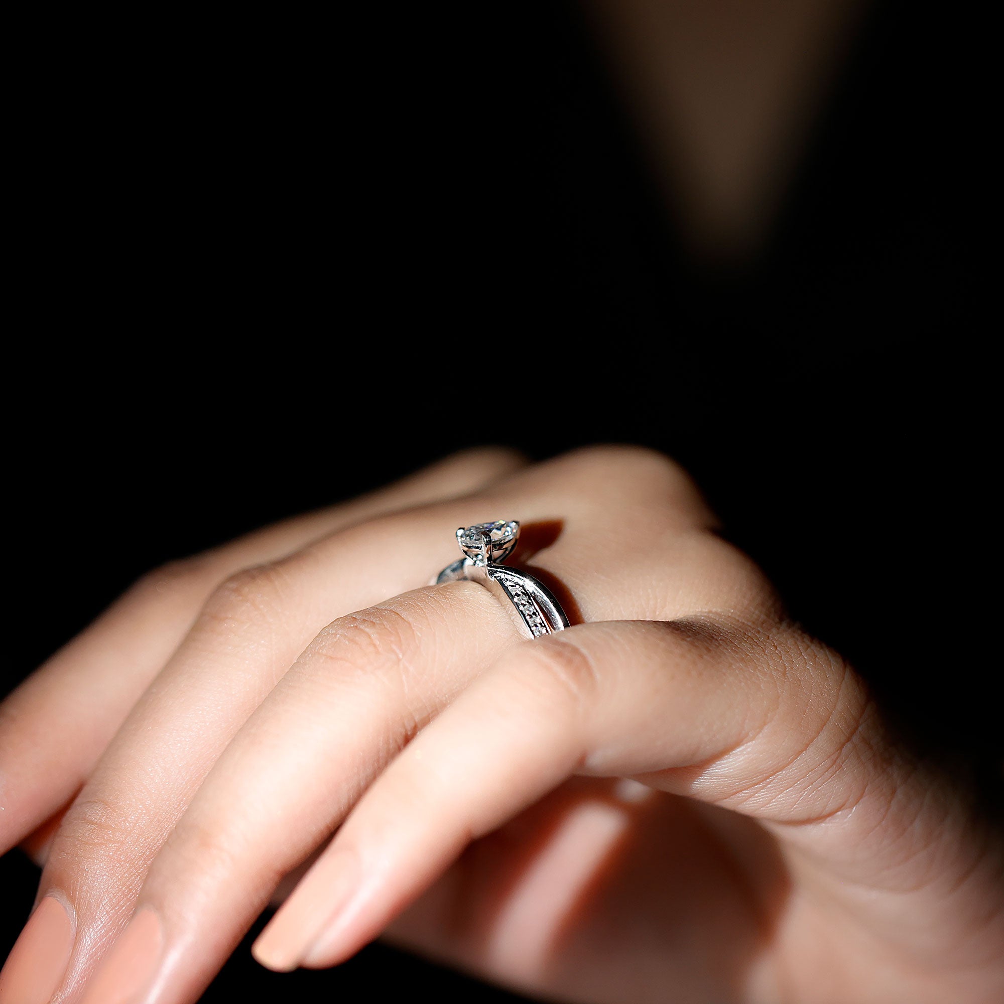 Standing out in unique design this enchanting Lab Grown Diamond Ring is a stunning tribute to beauty and emotion. Being versatile in design this Teardrop Engagement Ring symbolizes the beautiful journey of love that flows endlessly. The EF-VS Quality Lab Diamond has a mesmerizing play of brilliance symbolizing beautiful journey of love. This Solitaire Engagement Ring is adorned with 5X7 MM Pear Shaped Lab Grown Diamond in Prong Setting, creating a touch of sparkle that dances with every moment. The band features beautiful side stones, making it ideal for someone who envisions a love that encourages a lifelong commitment, all wrapped up in a design that narrates your one-of-a-kind love story.