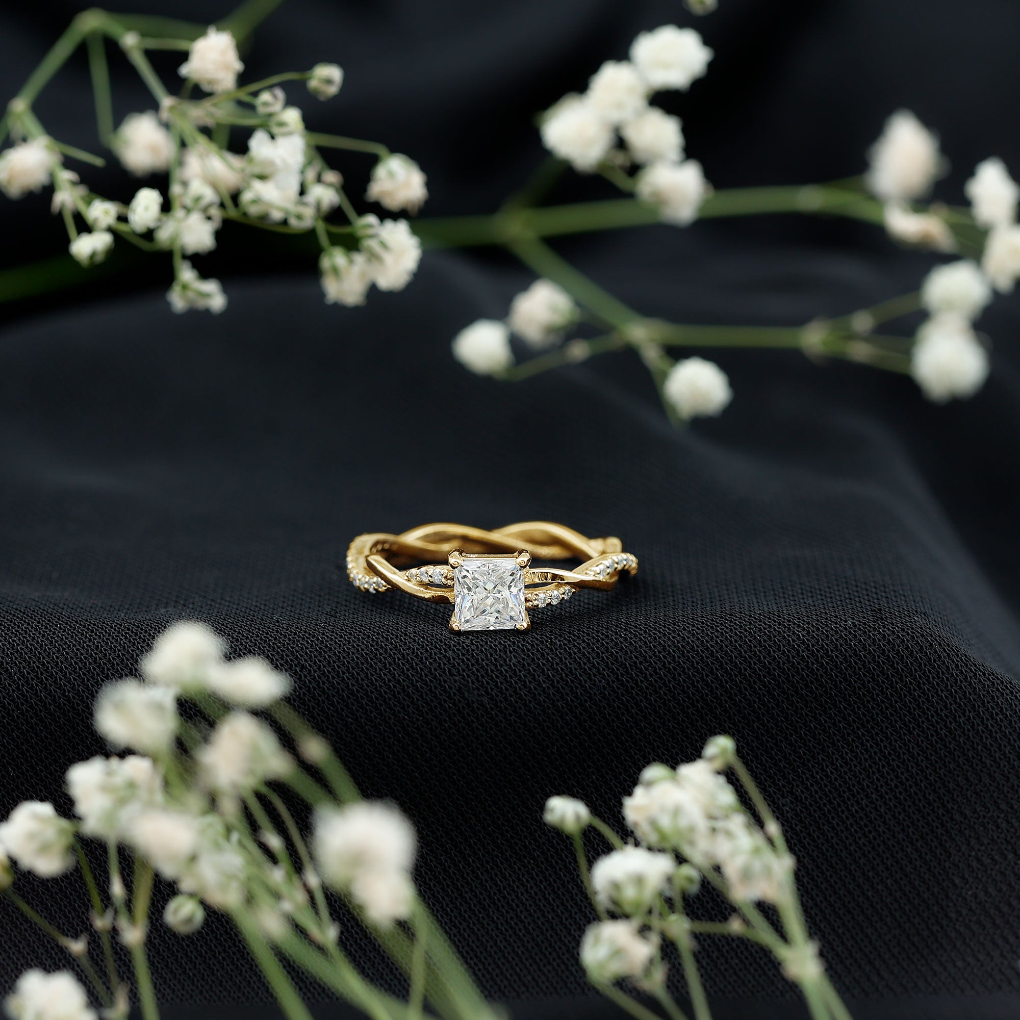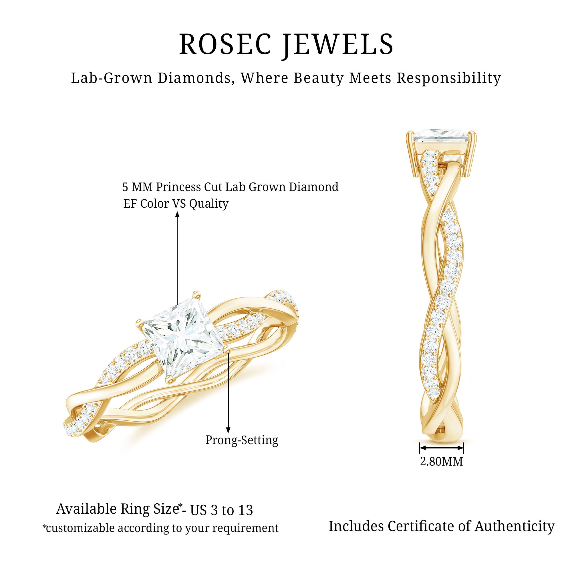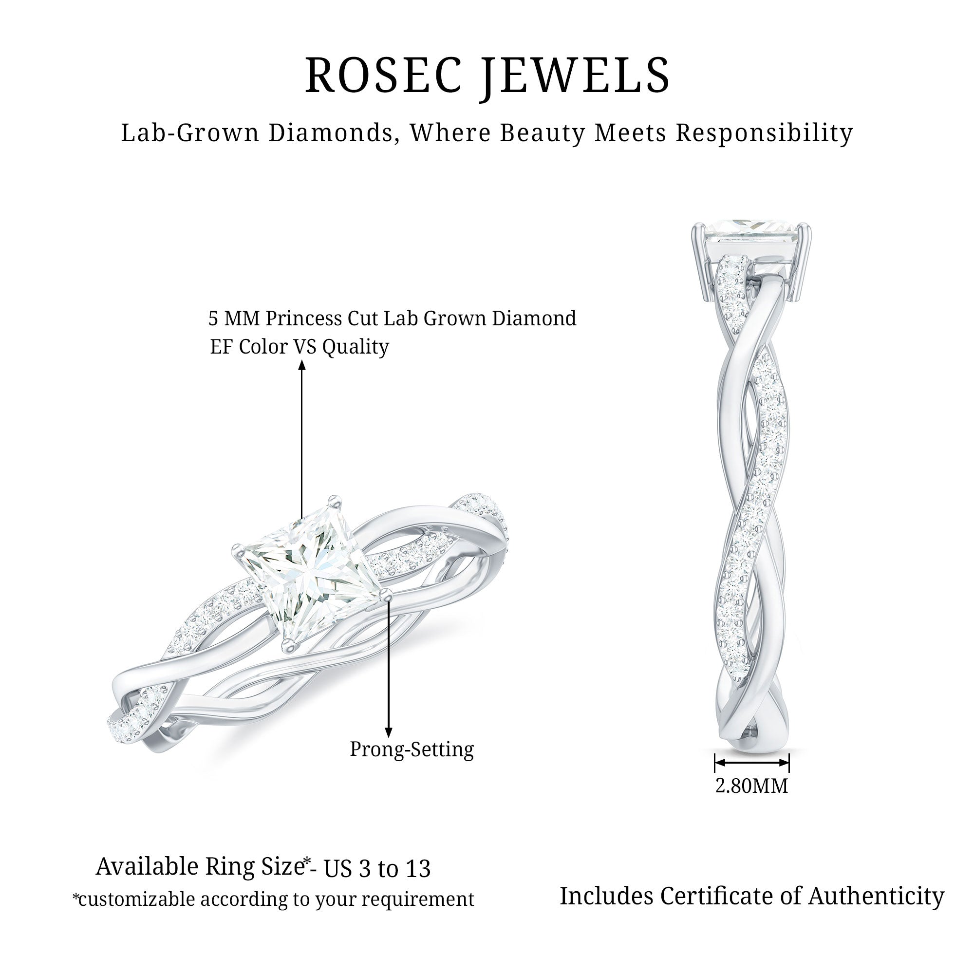 As a dazzling tribute to elegance, this Lab Grown Diamond Ring has retro and contemporary aesthetics. This striking design features 5 MM Princess Cut Lab Grown Diamond in Prong Setting at its center which is celebrated for its exceptional sparkle and contemporary appeal. This Promise Engagement Ring has a unique braided band which is a beautiful reminder that your love is stronger through the intertwining of two lives. Step into your forever with this Diamond Engagement Ring that embodies the boldness of your love story, blending classic sophistication with a touch of modern flair. Celebrate the enchanting journey ahead with a masterpiece designed to reflect your unique bond and timeless commitment.