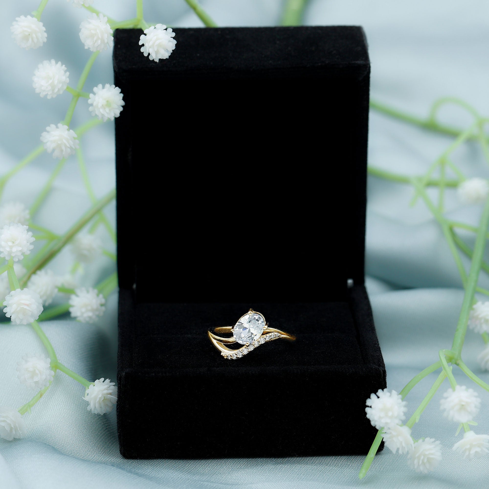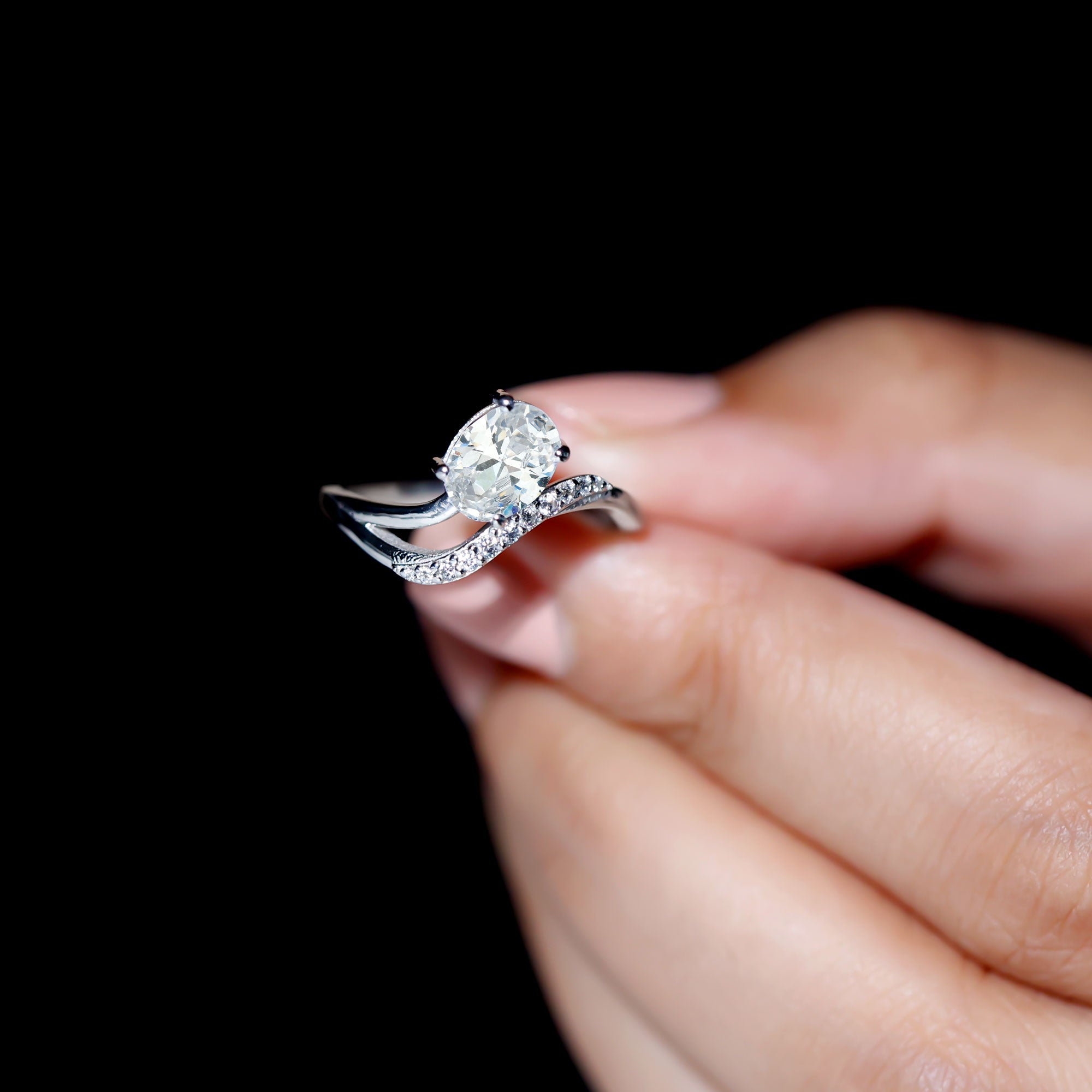 Give your lady love this Oval Diamond Engagement Ring on a special day, it is as unique as your love for her. The breathtaking 6X8 MM oval shaped diamond of EF-VS quality is set elegantly in an East-West style in prong setting. The gracefully curved band is adorned with a delicate row of shimmering round cut diamonds, adding a romantic touch and symbolizing the beautiful journey of love. Designed for a woman who loves contemporary elegance, this Diamond Solitaire Ring is perfect for making her feel special every day. Whether she adores minimalist beauty or bold fashion statement, this Curved Engagement Ring will complement her style effortlessly. Also, our Single Stone Ring comes in the appropriate packaging ensuring it is ready for presenting upon arrival.