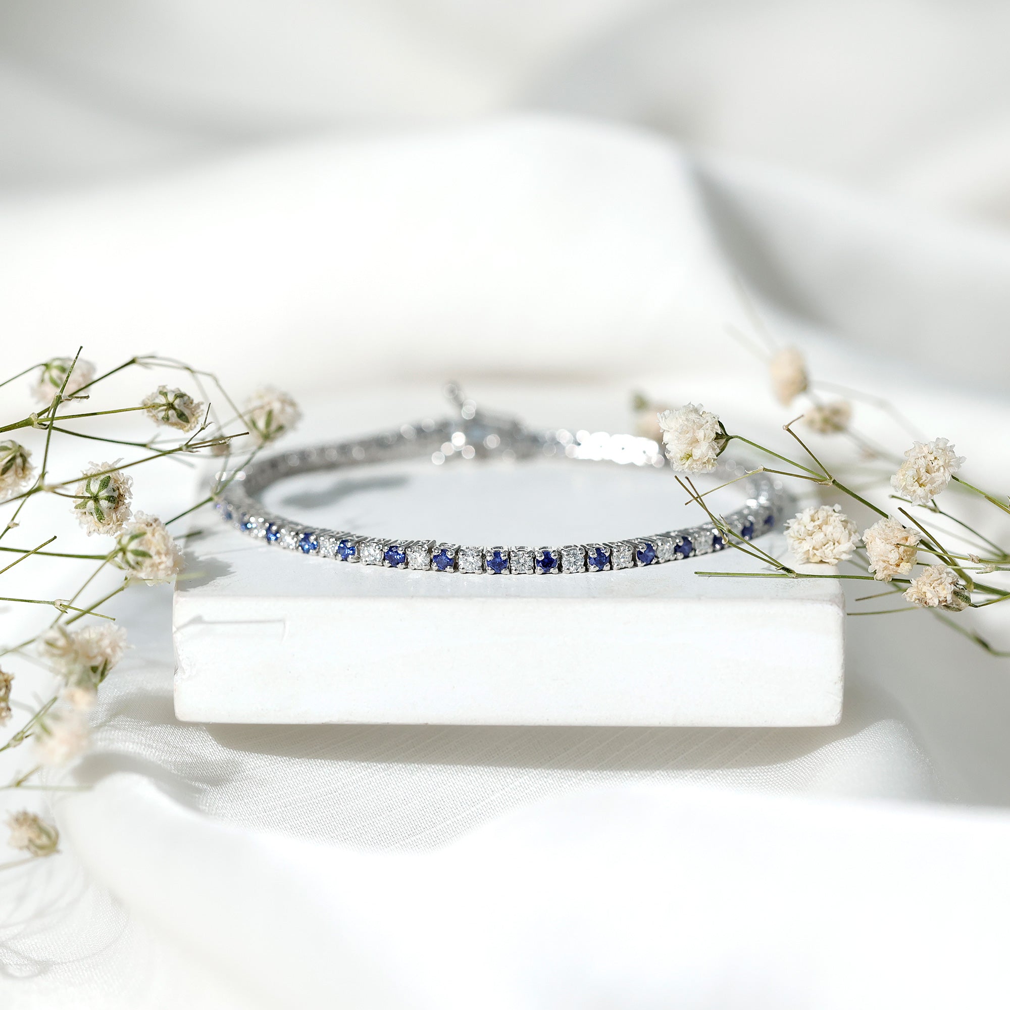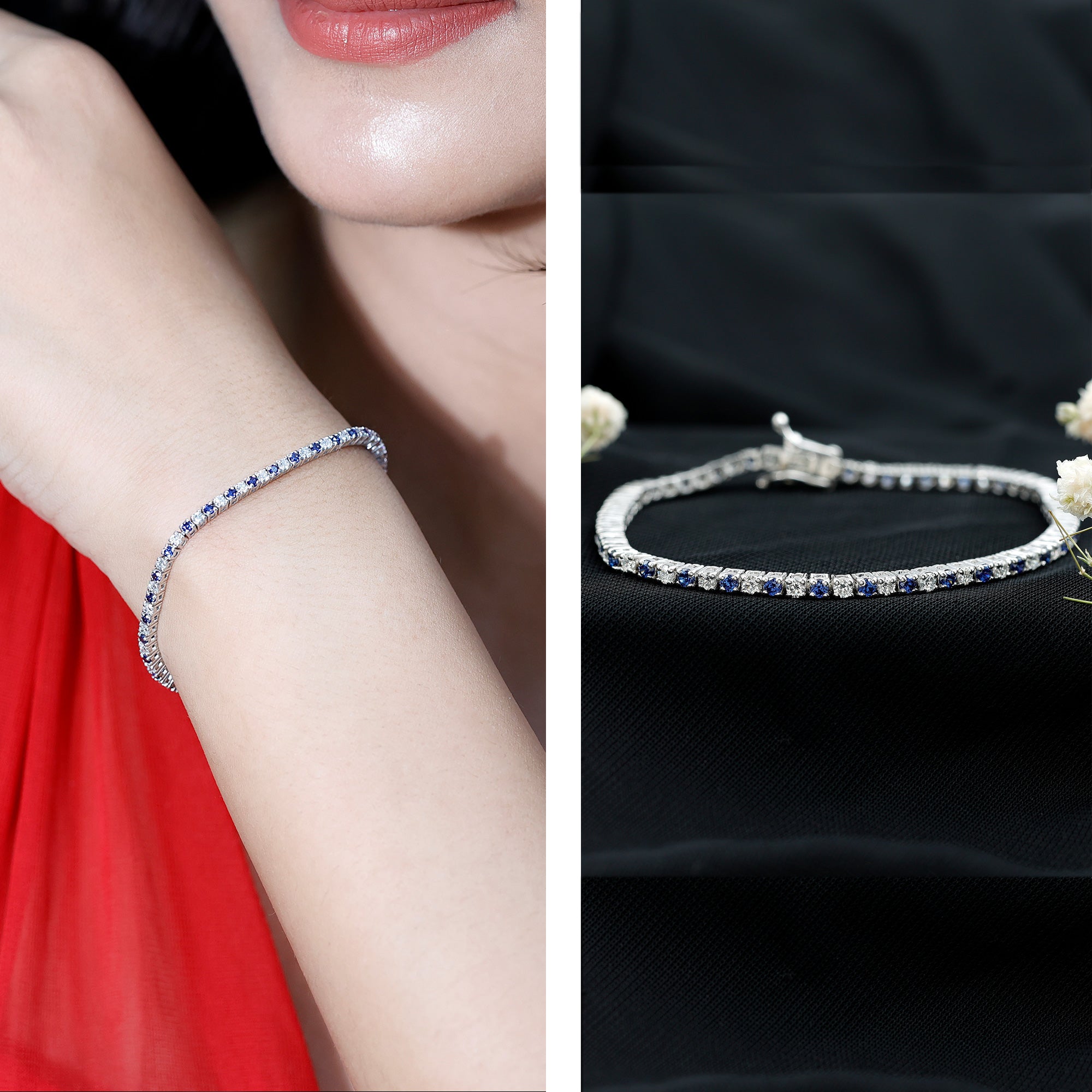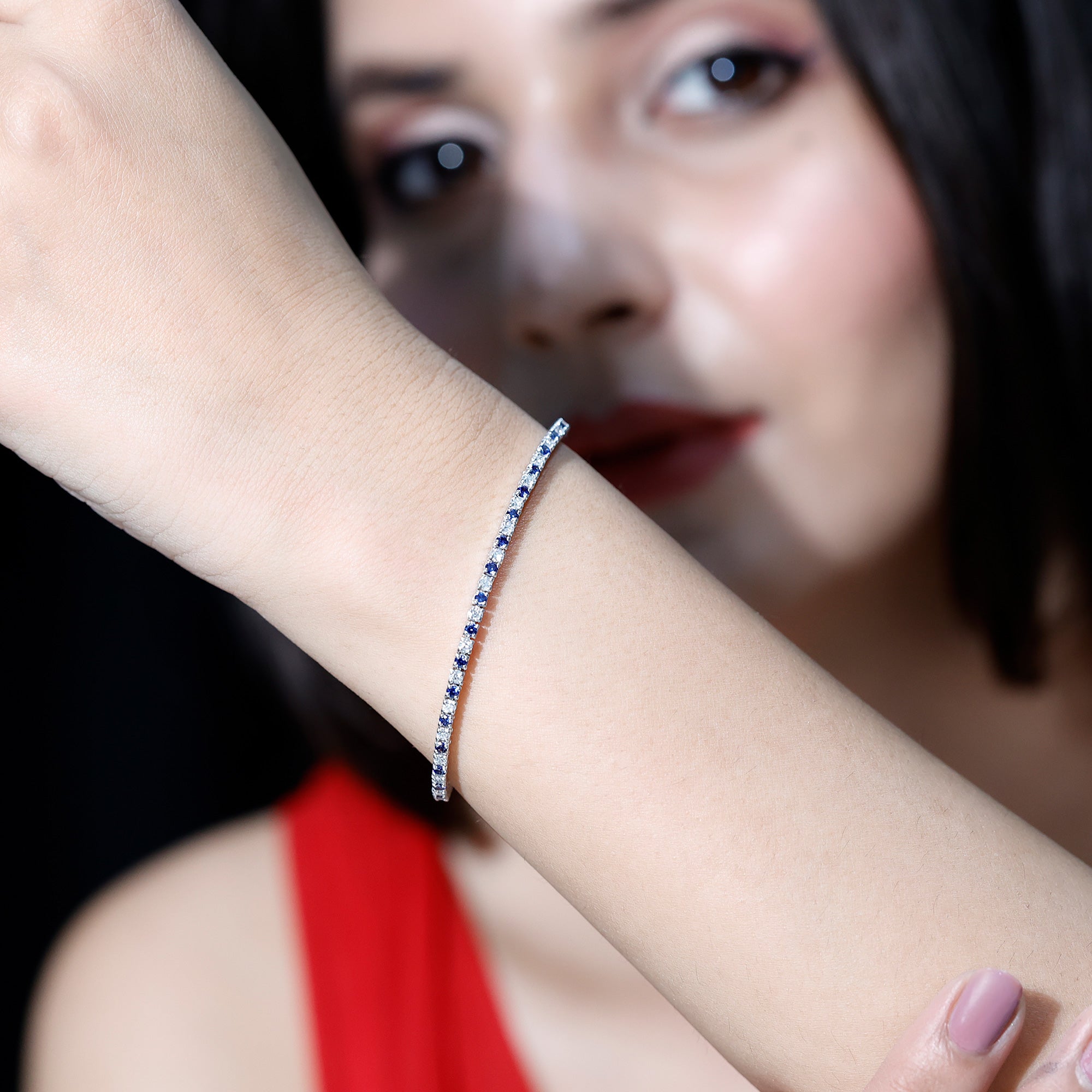 Wrap the wrist in the aura of light with this Lab Grown Diamond Tennis Bracelet, which is a stunning choice to complement your outfit. Simple and versatile, this Wedding Bracelet For Bride has a sophisticated design with a bold burst of color. This bracelet is beautifully adorned with Round Shape Lab Grown Diamond and Lab Blue Sapphire in Prong Setting, with sparkle, making a lasting impression. This Lab Diamond Sapphire Bracelet adds a touch of elegance with the epitome of style. Its attention grabbing design is perfect to suit every occasion and personal taste. Add a touch of intrigue and sophistication with this Bridal Bracelet that has impeccable flair that can be stacked with other bracelet as well or worn alone for a minimalistic look. Exuding grace and sophistication, it creates a classic and timeless look. The EF-VS Quality Lab Grown Diamond and AAAA Quality Lab Blue Sapphire, with a brilliant color and clarity, has the elegance where simplicity speaks volume.