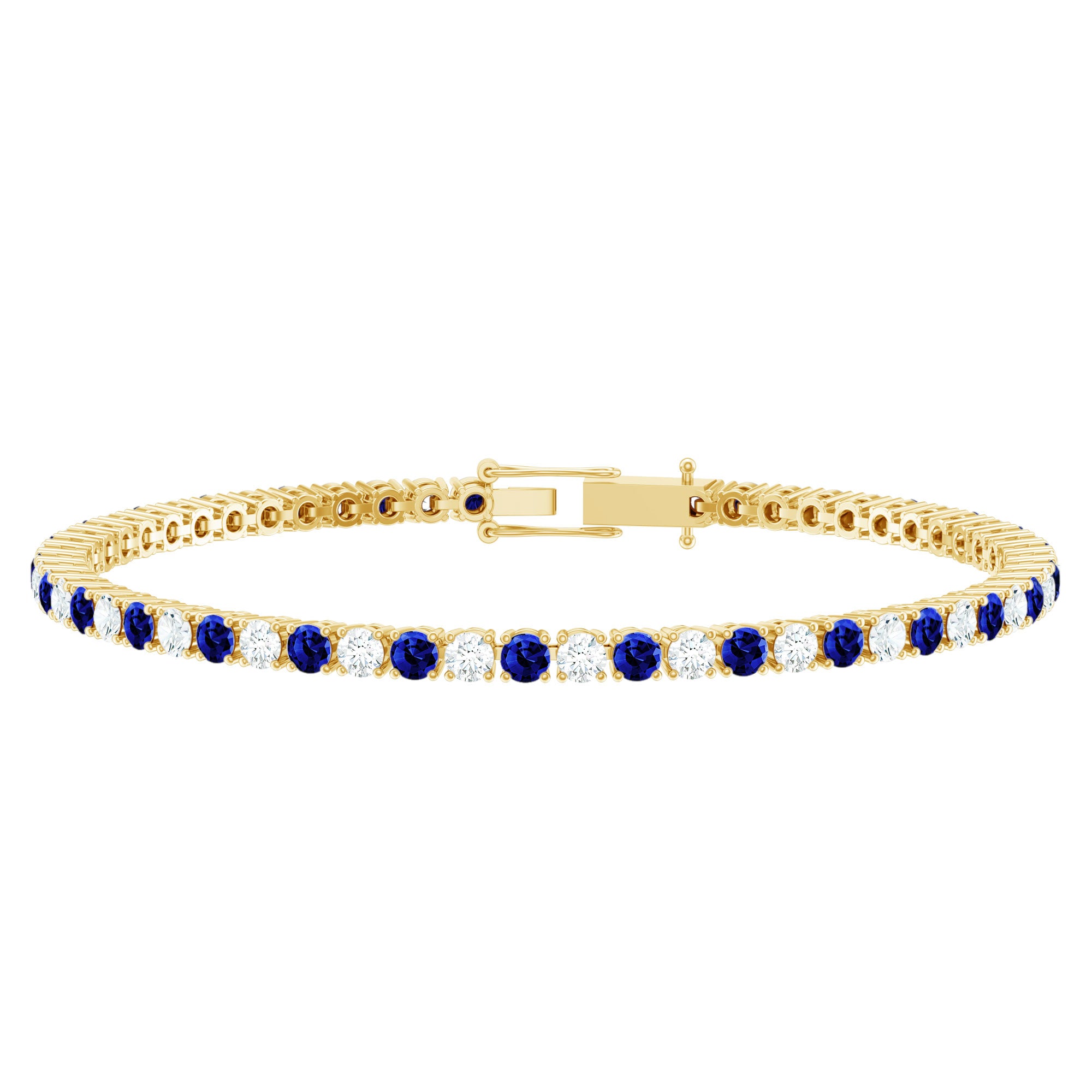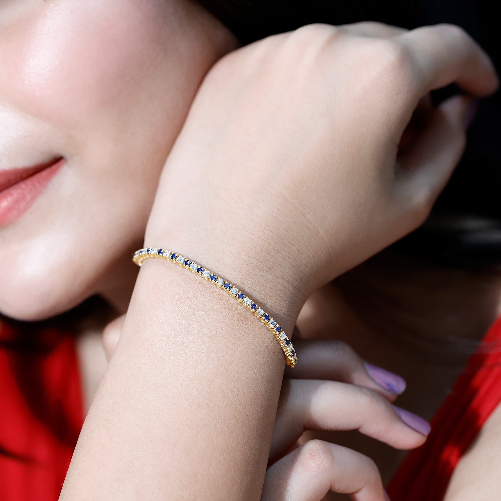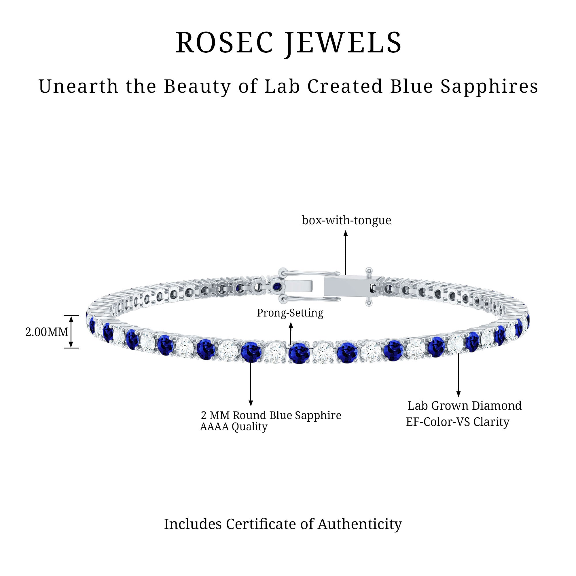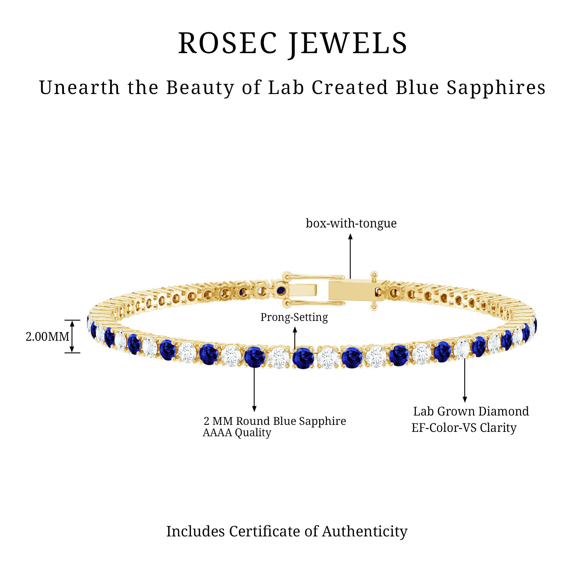 Wrap the wrist in the aura of light with this Lab Grown Diamond Tennis Bracelet, which is a stunning choice to complement your outfit. Simple and versatile, this Wedding Bracelet For Bride has a sophisticated design with a bold burst of color. This bracelet is beautifully adorned with Round Shape Lab Grown Diamond and Lab Blue Sapphire in Prong Setting, with sparkle, making a lasting impression. This Lab Diamond Sapphire Bracelet adds a touch of elegance with the epitome of style. Its attention grabbing design is perfect to suit every occasion and personal taste. Add a touch of intrigue and sophistication with this Bridal Bracelet that has impeccable flair that can be stacked with other bracelet as well or worn alone for a minimalistic look. Exuding grace and sophistication, it creates a classic and timeless look. The EF-VS Quality Lab Grown Diamond and AAAA Quality Lab Blue Sapphire, with a brilliant color and clarity, has the elegance where simplicity speaks volume.