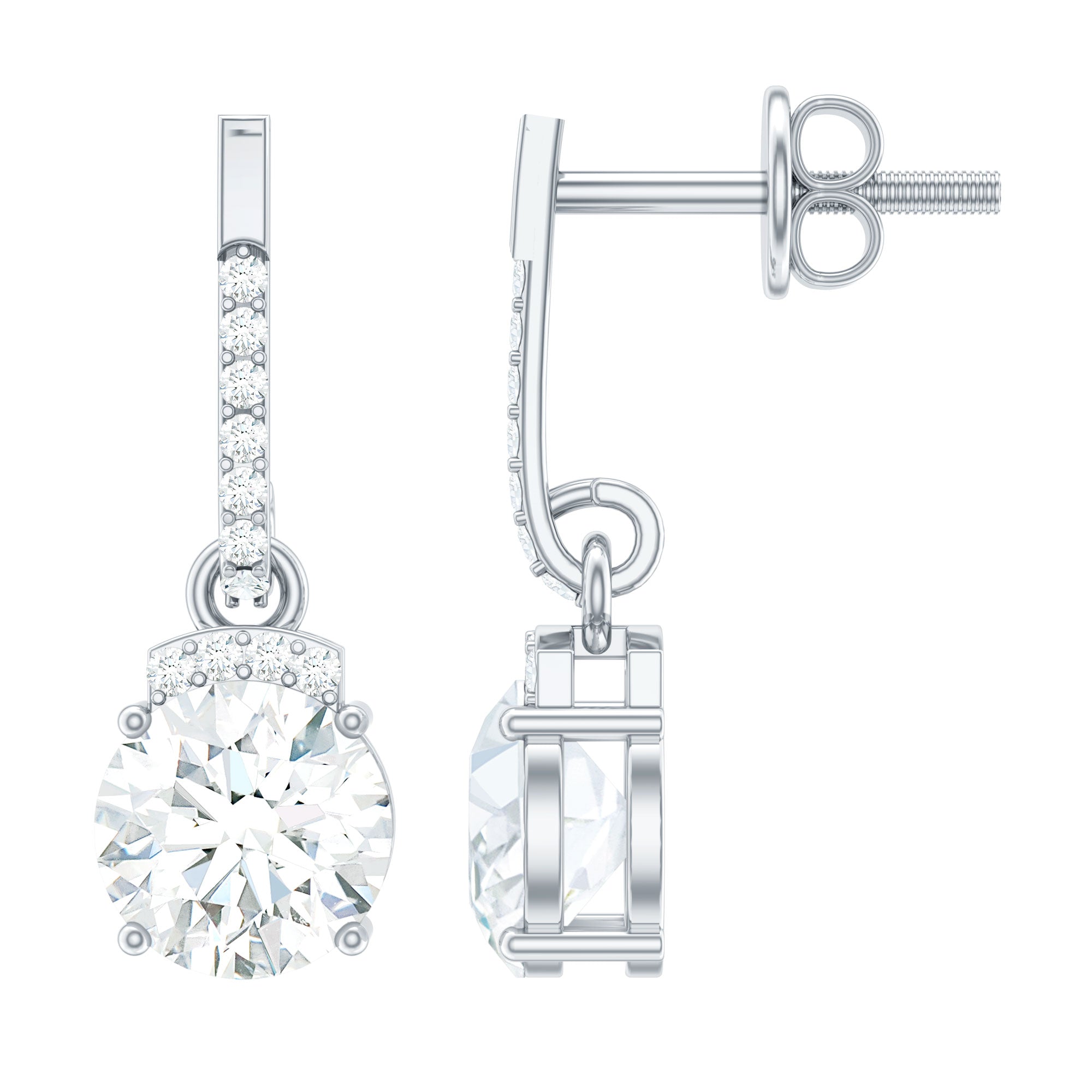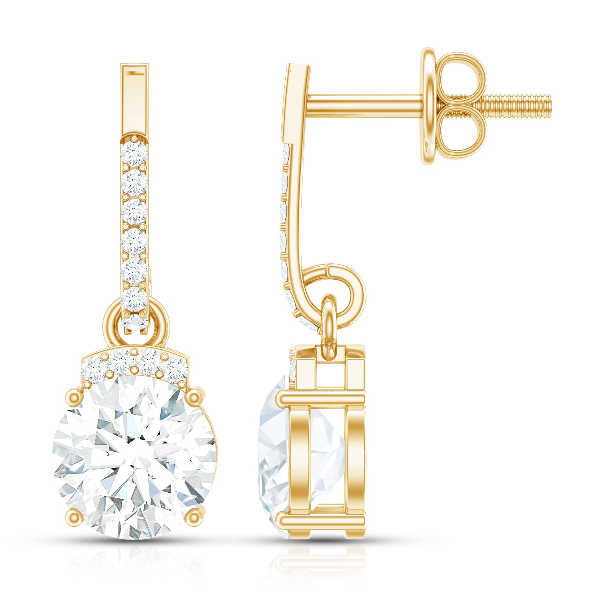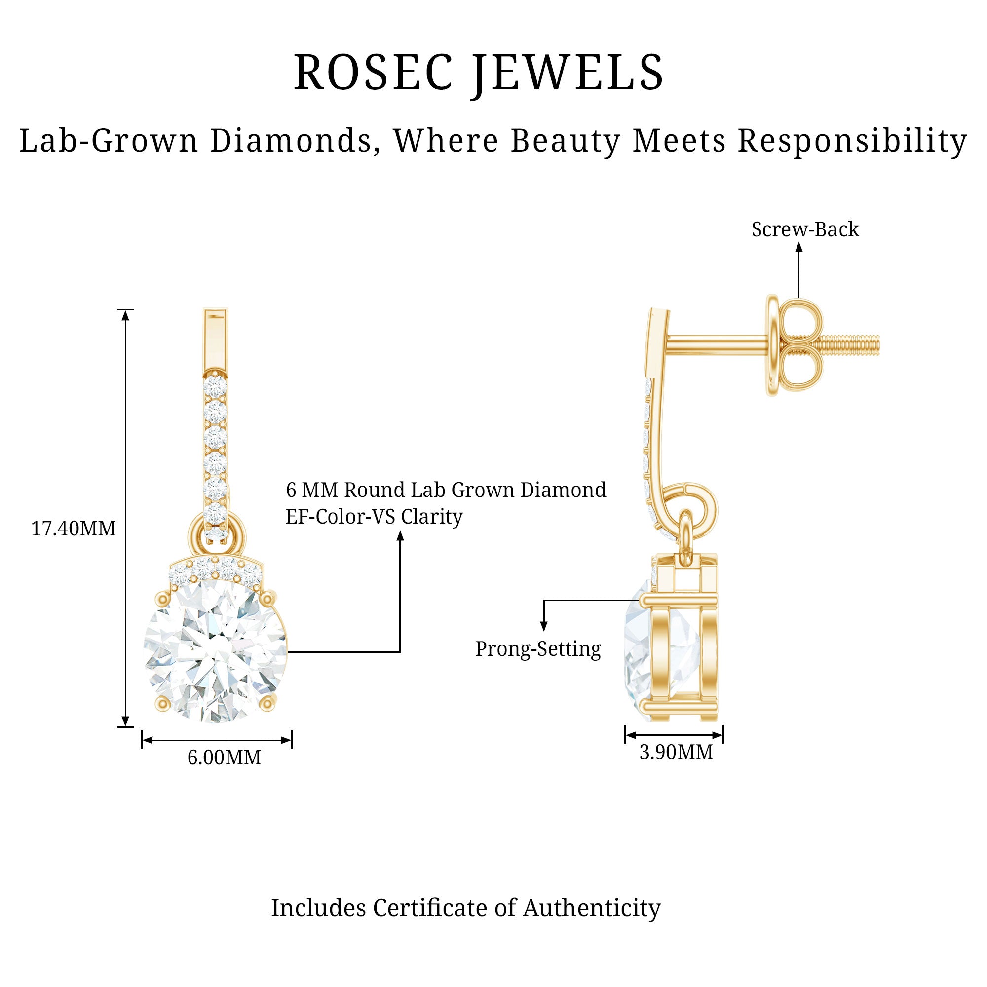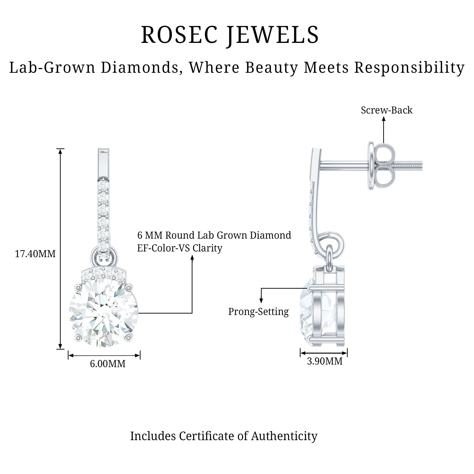 Looking for timeless elegance? Discover these Diamond Hanging Earrings from Rosec Jewels. These Drop Earrings feature Round Shape 6 mm Diamond gemstone set in a Prong Setting, accentuated by dainty gemstones set on a bar, radiating sophistication. Secured with Screw Back Closure, these 2 Carat Diamond Earrings (Lab Created) are a perfect addition to your Jewelry Collection, something that will never go out of style. They can be present as April Birthstone Earrings and are available in a wide range of metal choices, allowing you to select the perfect material to match your style and make it truly unique.