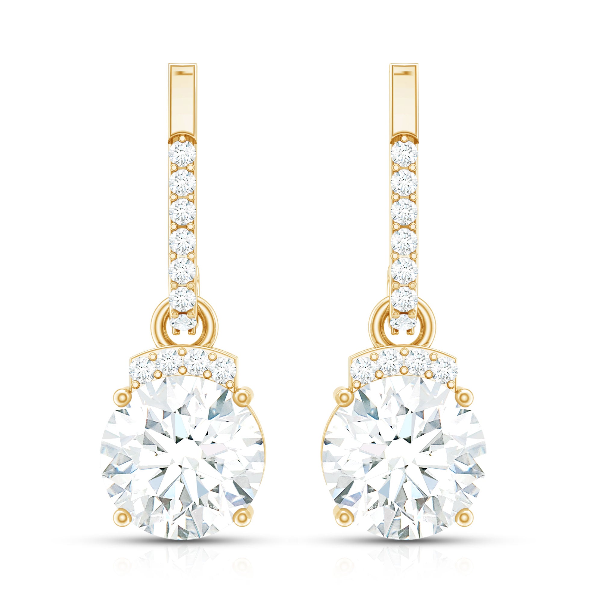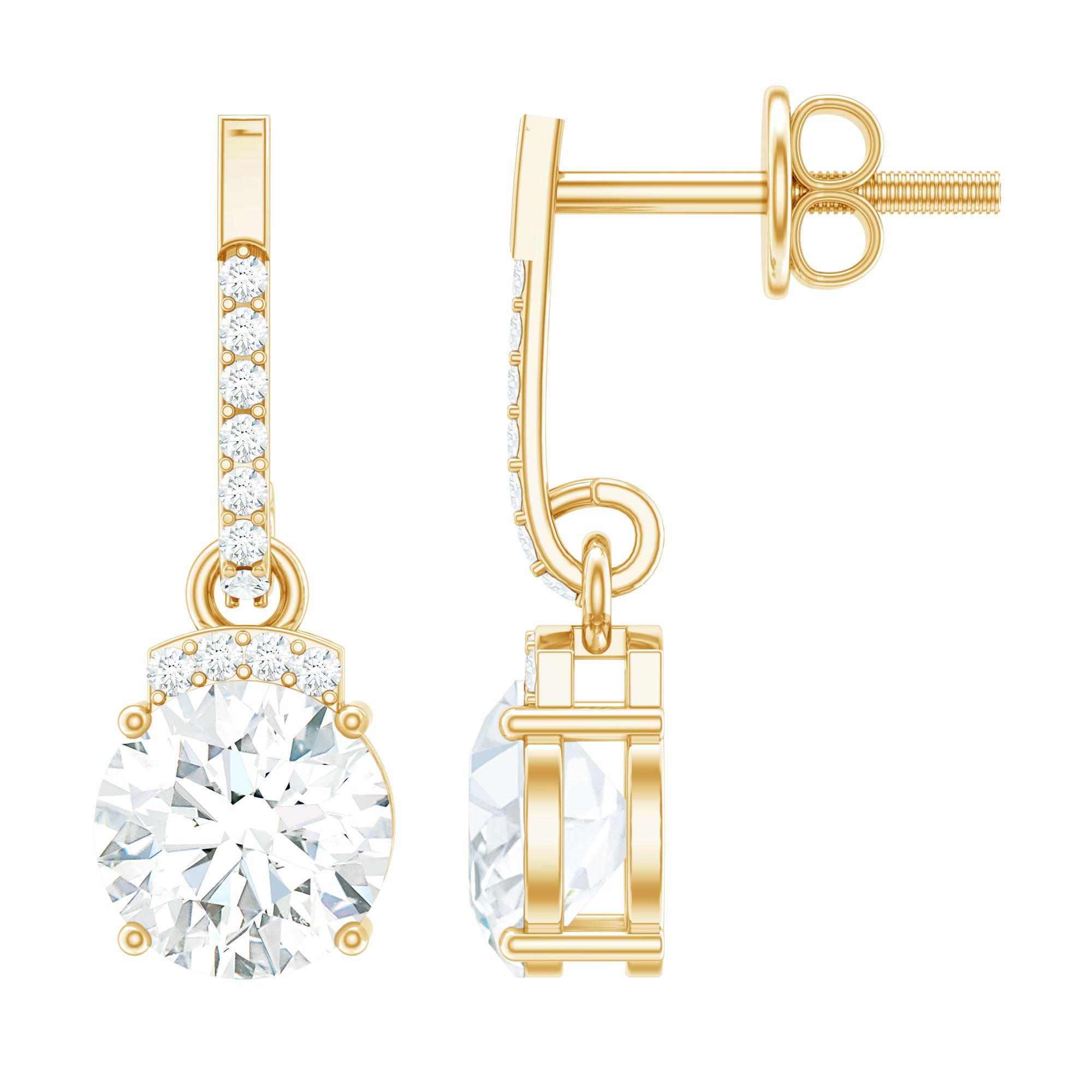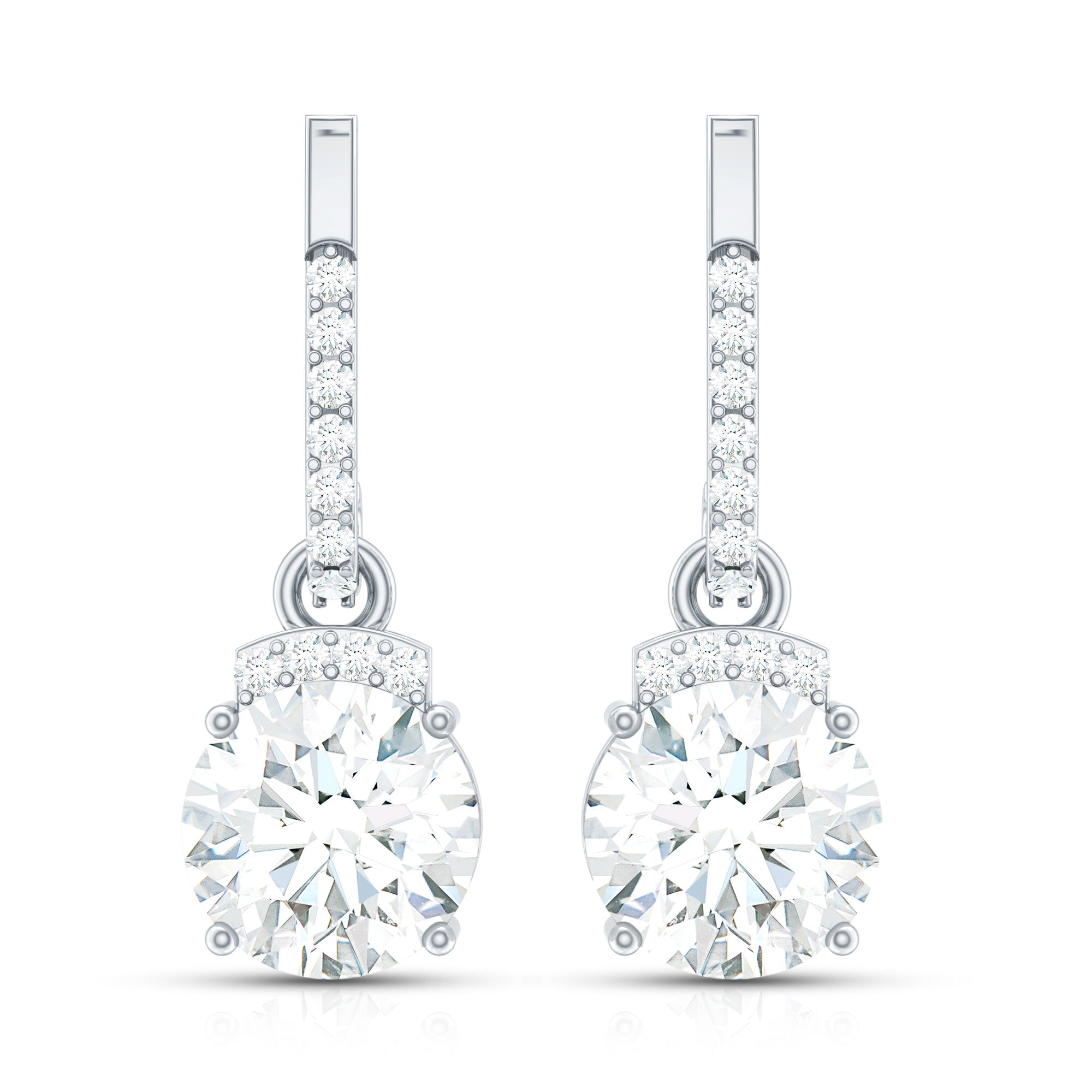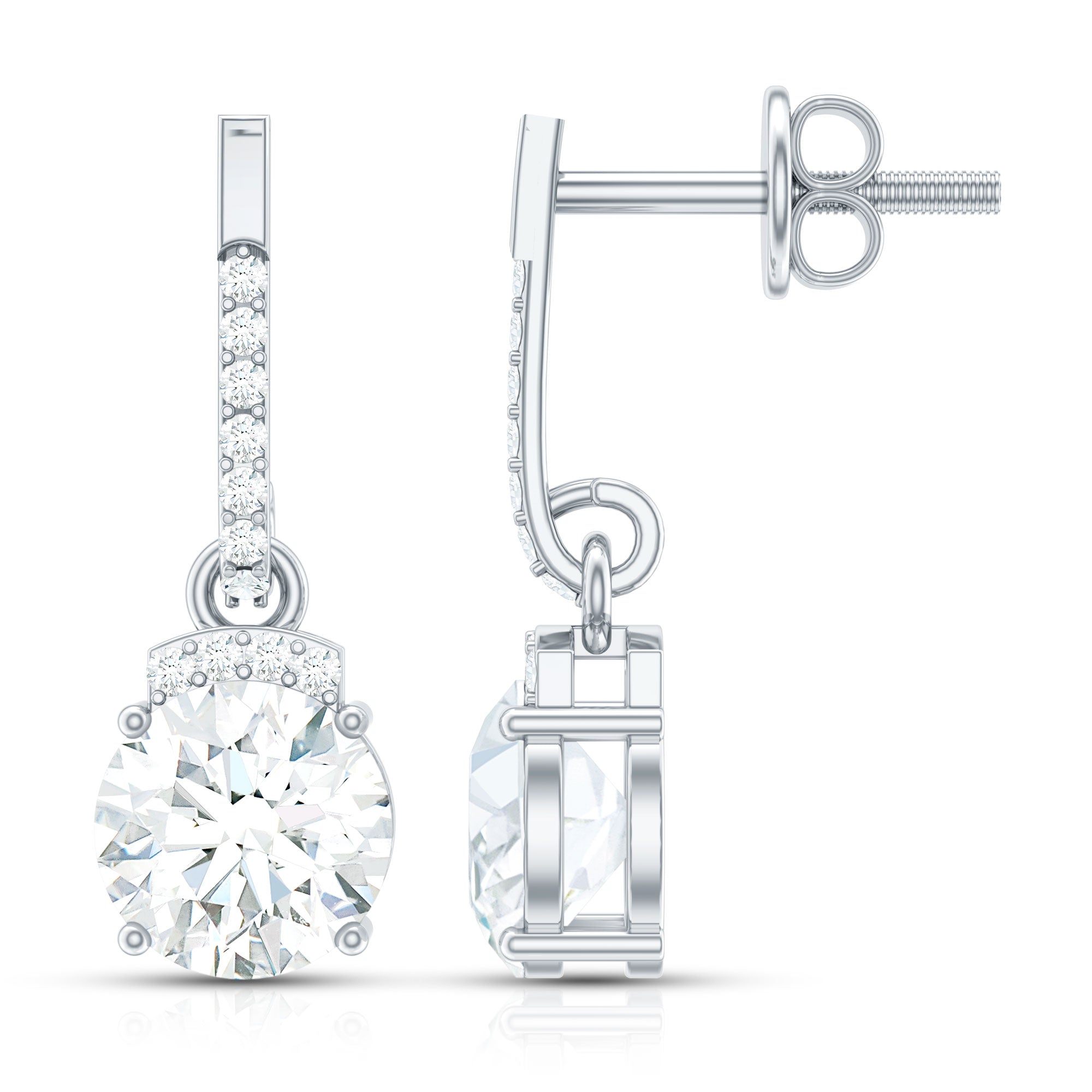 Looking for timeless elegance? Discover these Diamond Hanging Earrings from Rosec Jewels. These Drop Earrings feature Round Shape 6 mm Diamond gemstone set in a Prong Setting, accentuated by dainty gemstones set on a bar, radiating sophistication. Secured with Screw Back Closure, these 2 Carat Diamond Earrings (Lab Created) are a perfect addition to your Jewelry Collection, something that will never go out of style. They can be present as April Birthstone Earrings and are available in a wide range of metal choices, allowing you to select the perfect material to match your style and make it truly unique.