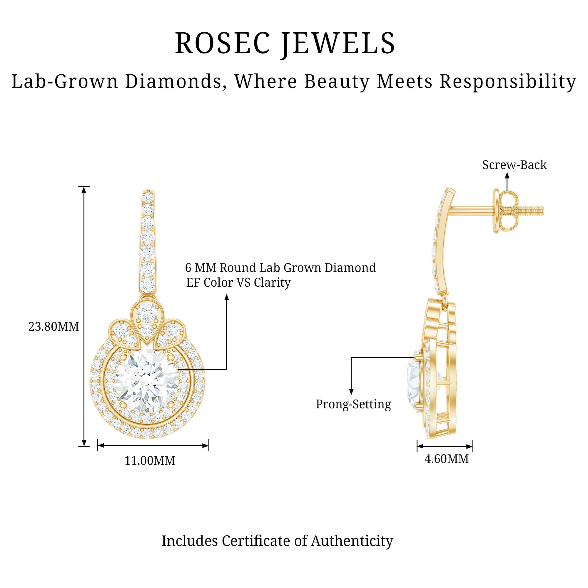 In these Bridal Earrings, a 6 MM round shaped diamond (lab grown) takes center stage, beautifully framed by a diamond double halo and dangling from a decorative bar at the top. Three delicate pear shaped motifs encrusted with diamonds sit gracefully above the center stone, adding a regal touch to the design. Secure prongs hold each gemstone in place, enhancing its brilliance, while the screw back closure ensures the earrings sit safely on your earlobes, offering a flawless fit with every wear. Our Diamond Wedding Earrings will add the perfect sparkle to your bridal glow. The Lab Grown Diamond Earrings are an affordable option for those born in April or those whose zodiac sign is Aries, these Dangling Earrings hold even deeper meaning, representing clarity, love, and strength.