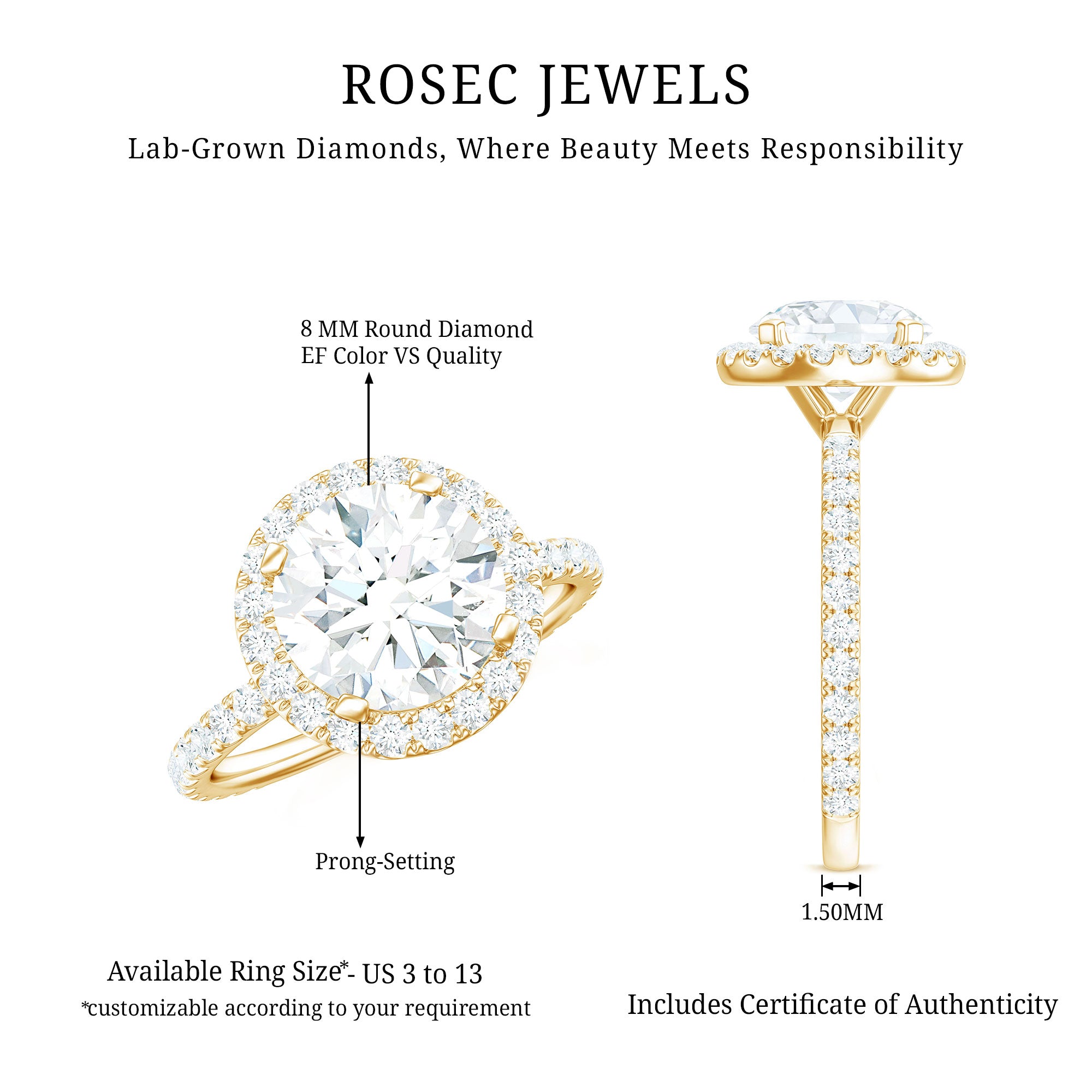 Big moments call for some big sparkle - this Lab Grown Diamond Engagement Ring is ready to seal the deal with its incredible shine. This Circle Engagement Ring showcases an 8 MM round cut lab grown diamond at its center, securely held in prong setting and surrounded by a stunning halo of delicate round cut stones. The diamond-encrusted band of this Halo Engagement Ring adds even more sparkle from every angle, blending simplicity and elegance perfectly. Whether you are planning a proposal or marking a special occasion, this timeless piece is crafted to make your moment unforgettable. Grab this 2 Carat Diamond Ring now and let your forever shine even brighter. It creates a beautiful and captivating allure of a Timeless Engagement Ring, with expert craftsmanship that offers a variety of metal options to choose from. With sizes available from 3 to 13 according to US standards, we also provide a free ring sizer to help you find your perfect fit without any last-minute stress. Arriving in a signature jewelry box that is ready for gifting, this Round Diamond Ring ensures that every occasion is memorable for your Girlfriend, Fiancee, Wife, or Mother.