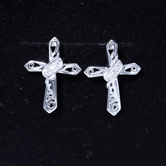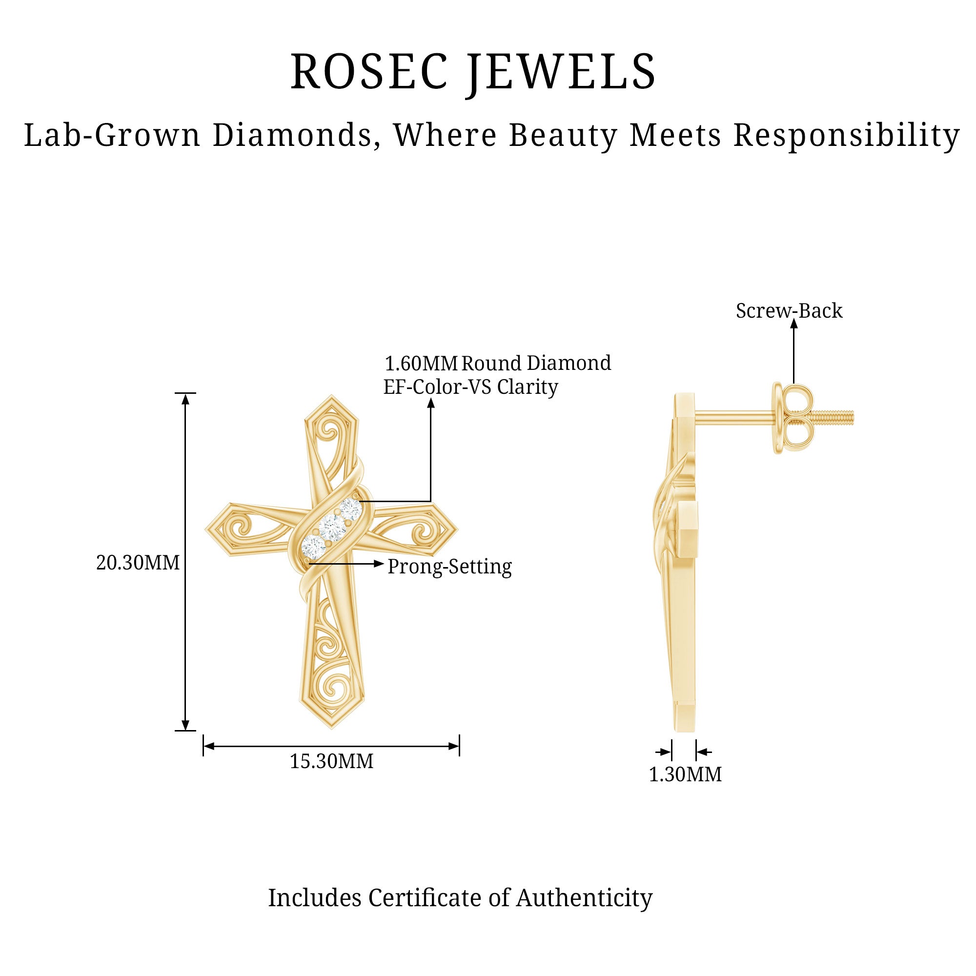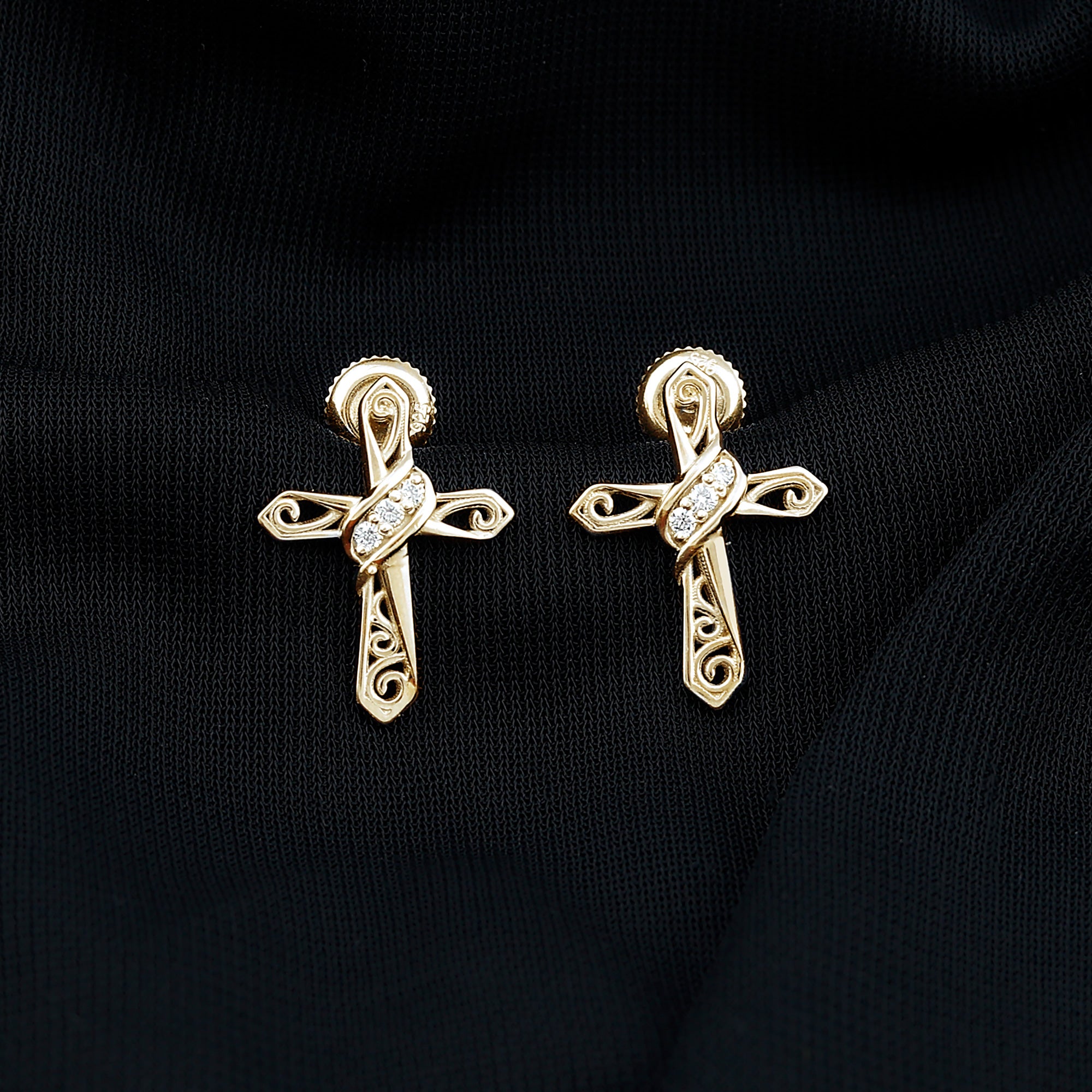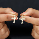 Handcrafted with intricate details, these Cross Stud Earrings are a celebration of faith with a touch of vintage luxury. The symmetrical cross design is adorned with delicate filigree patterns, reflecting your artistic side. At the center, shimmering round shaped lab grown diamonds (EF-VS Quality) symbolize purity and divine light. These Diamond Cross Earrings come with screw back closures, designed for comfort and lasting wear. The balance of shimmering gemstones and vintage inspired detailing make them a meaningful statement piece, perfect for those who cherish both spiritual deco-inspired devotion and timeless artistry. These Art Deco Diamond Earrings do not just complement your style but also reflect the depth of your spirit and the elegance of a bygone era.